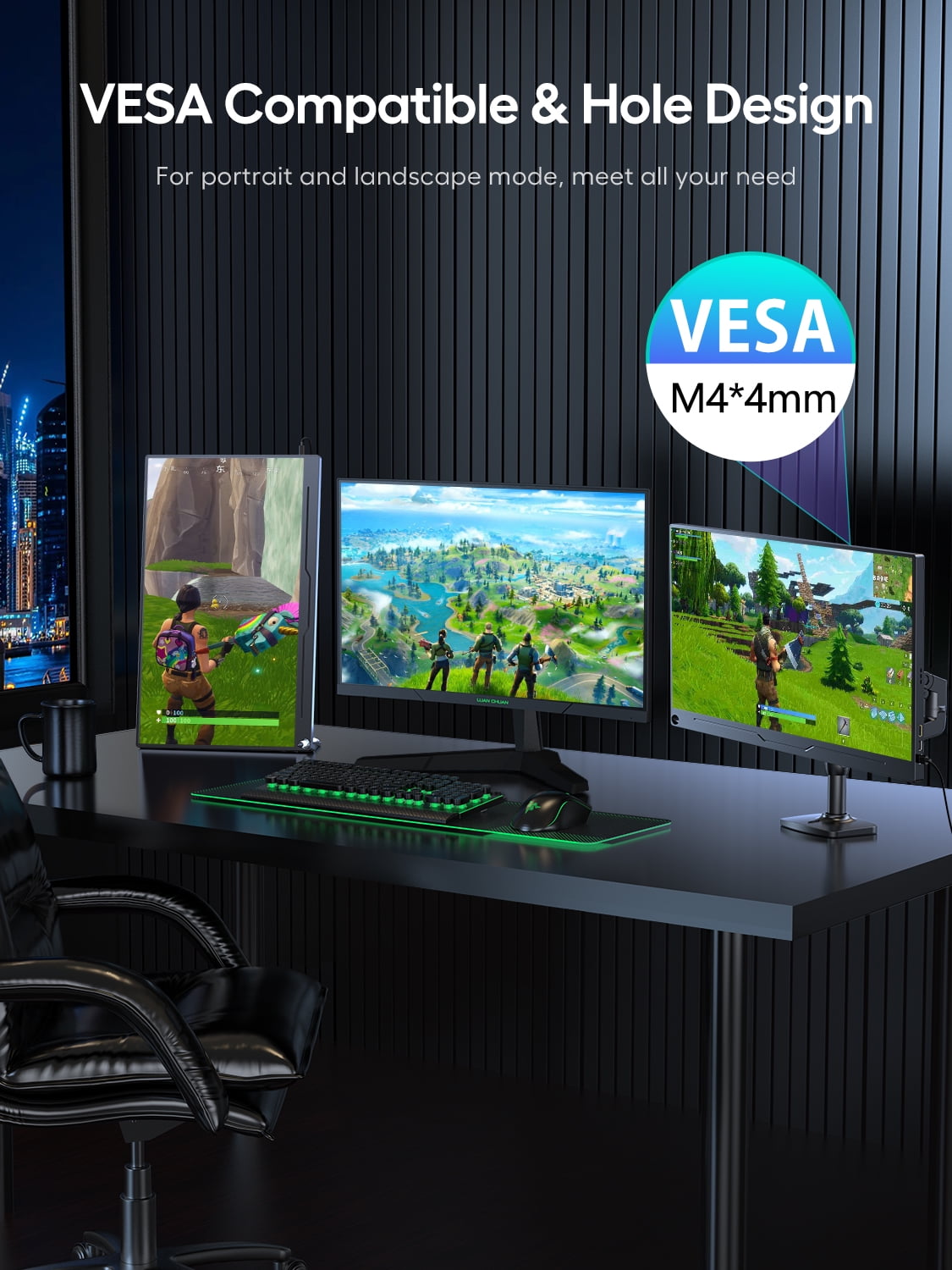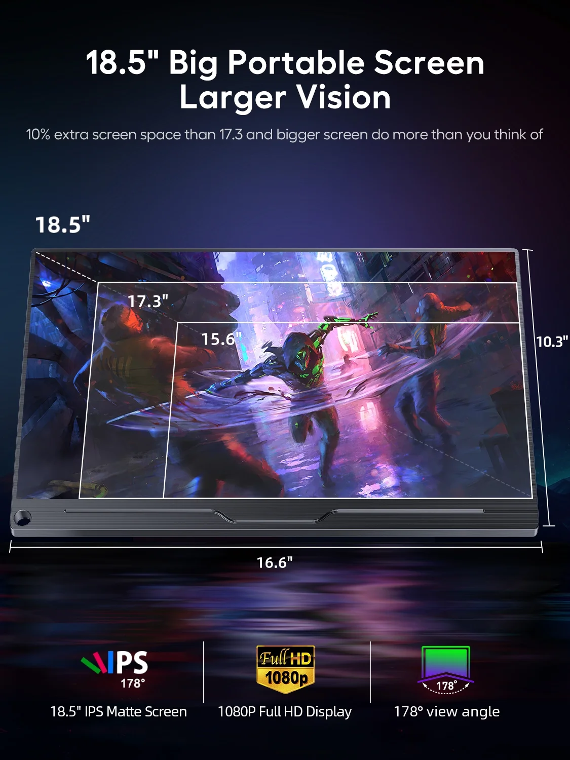 UPERFECT 18.5″ Portable Monitor could offer you the same gaming experience as the traditional dektop gaming monitor. It adopts 300cd/m² brightness, 100% sRGB Color Gamut, 100HZ refresh rate, 16:9 aspect ratio, 1000: 1 contrast ratio, 178° viewing angle, 8 bit display color Which can deliver you more clear, brighter, crisper image, see more detail and colorful video, enjoy more wonderful and professional Esports.