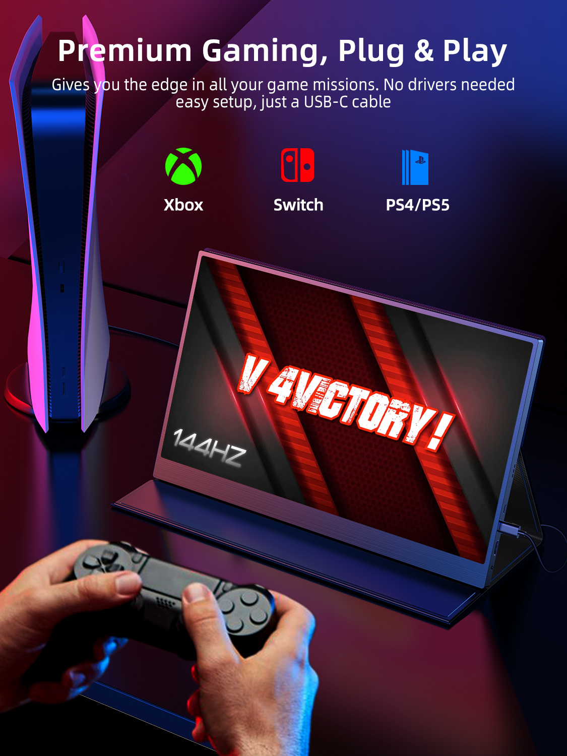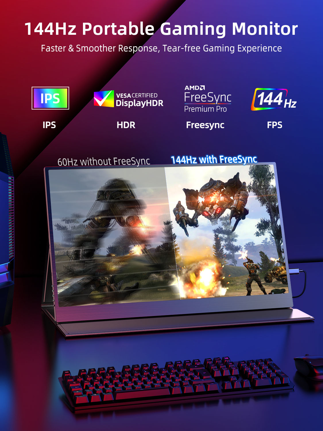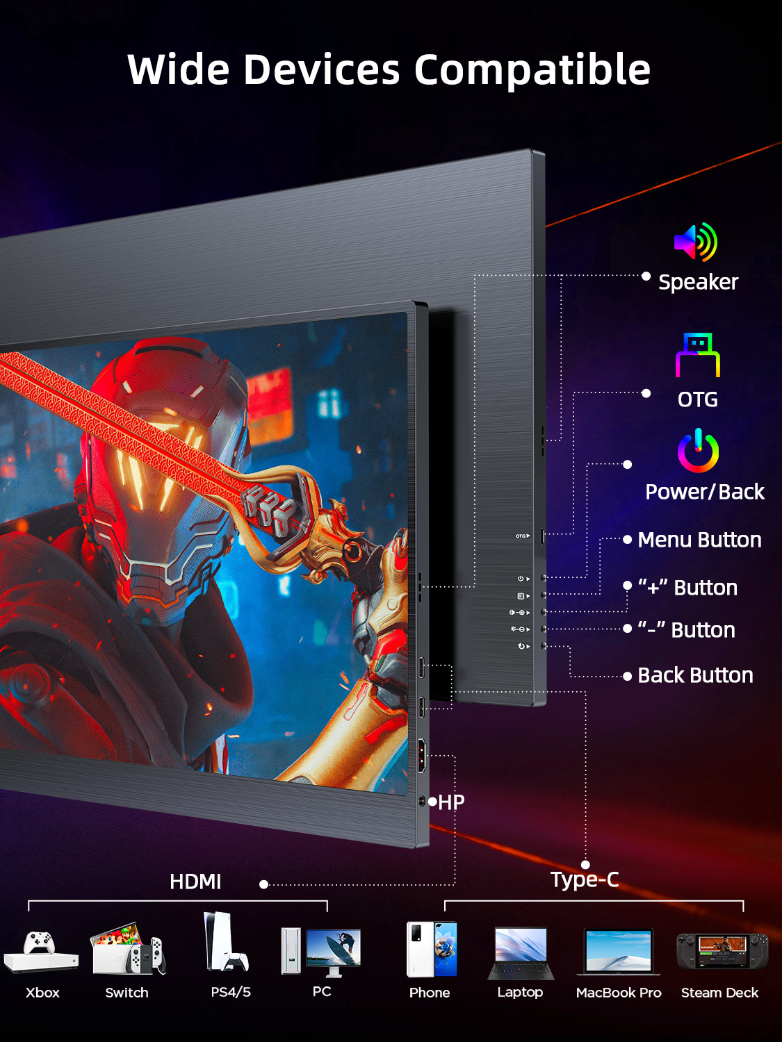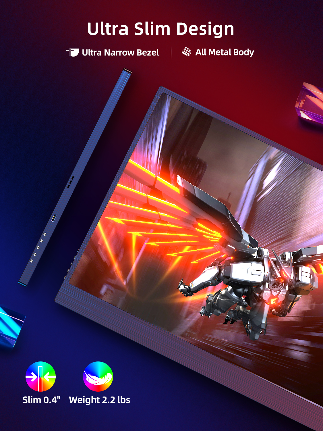 Excellent Gaming Monitor – The 17.3-inch 144hz display brings a more perfect display effect, high-quality color display, equipped with HDR, better display effect, perfectly adapts to your game console and office equipment to handle your work quickly and efficiently, providing a more immersive gaming experience. UPERFECT 2 year guarantee – UPERFECT grants a 100% money-back guarantee for all problems within 90 days and 2-year quality and replacement guarantee. NOTE: Please check if the Type C of your laptop is a full-featured Type C port. If it is just a Type C for charging, it will not be available. And check if your phone have enough power output, or it requires an adapter to support power. Please check if your laptop has Thundbolt 3.0 port, or you may need to connect your laptop to the monitor via HDMI port or mini DP port. Screen Refresh Rate: 144Hz Screen Size: 17.3 inch Resolution: 1920 × 1080 Display Ratio: 16:9 Viewing Angle: 178° Panel Type: IPS Contrast Ratio: 800:1 Brightness: 250 cd/㎡ Color Gamut: 72% sRGB Color Depth: 16.7M(8bit) Response Time: 3-5ms Viewable Area (mm): 381.89 × 214.81 mm (15.04 × 8.46 inch) Physical: Material: Aluminum Product Size: 398 × 247 × 12 mm (15.67 × 9.72 × 0.47 inch) Net Weight: 1.03 kg (2.27 lbs) Rated Power: 9W Interface 2 × Full-Featured USB Type-C for Audio & Video Input 1 × HDMI for Audio & Video Input 1 × Micro USB-B OTG for USB Drive or Keyboard and Mouse 1 × 3.5mm AUX for audio output Advanced Touch Screen: No Built-in Battery: No Gravity Sensor: No Built-in Speakers: Yes, 2 speakers 8Ω 1W Vesa: Yes, 75*75mm@M4*4mm Driver Free: Yes Stand Holder: No Cover Case: Yes, Foldable Back Cover Case What’s in the box? 1 * UPERFECT Portable Monitor 1 * HDMI to HDMI Cable 1 * Type C to Type C Cable 1 * Type C to USB A Cable 1 * Power Adapter 1 * Smart Cover 1 * Manual
