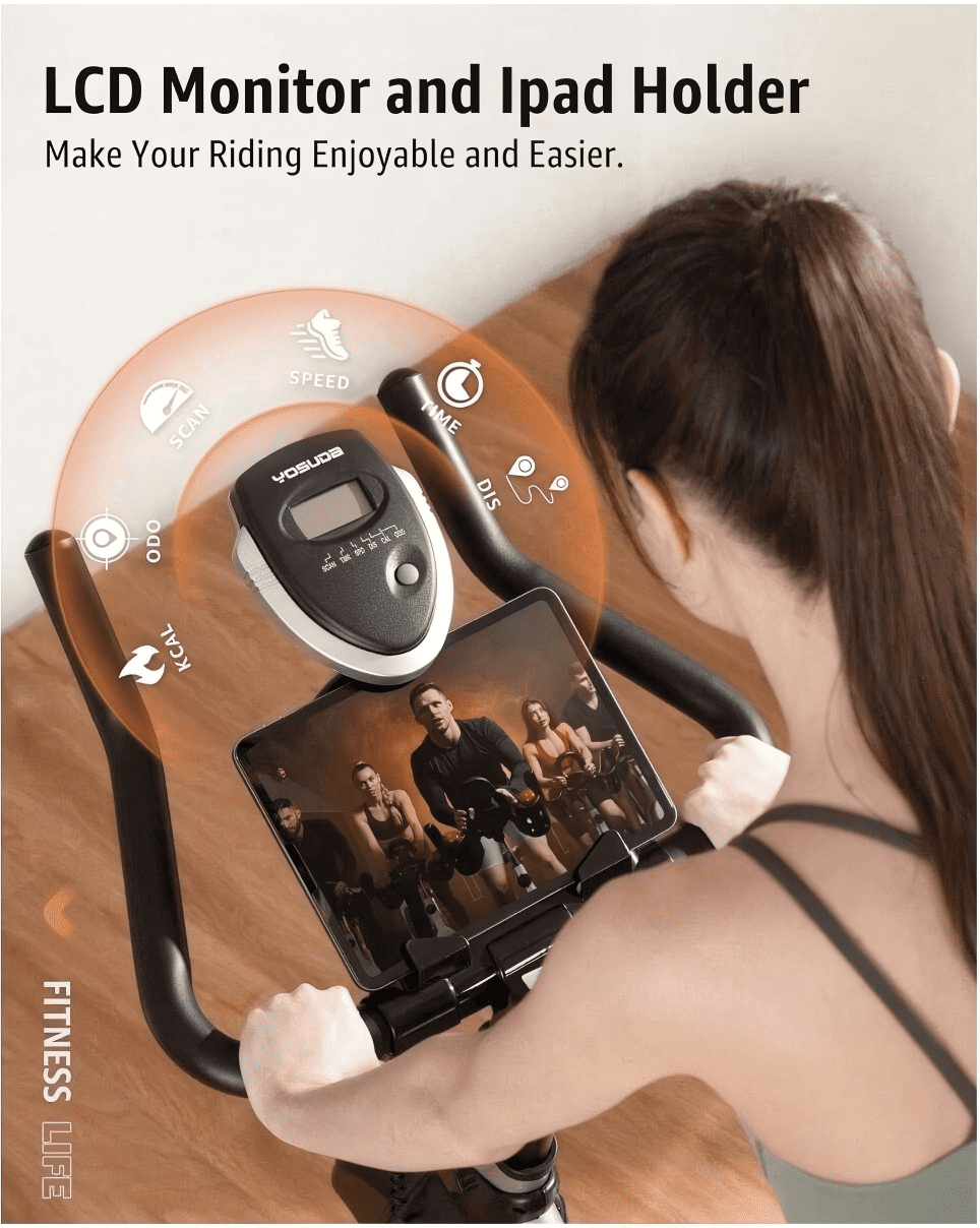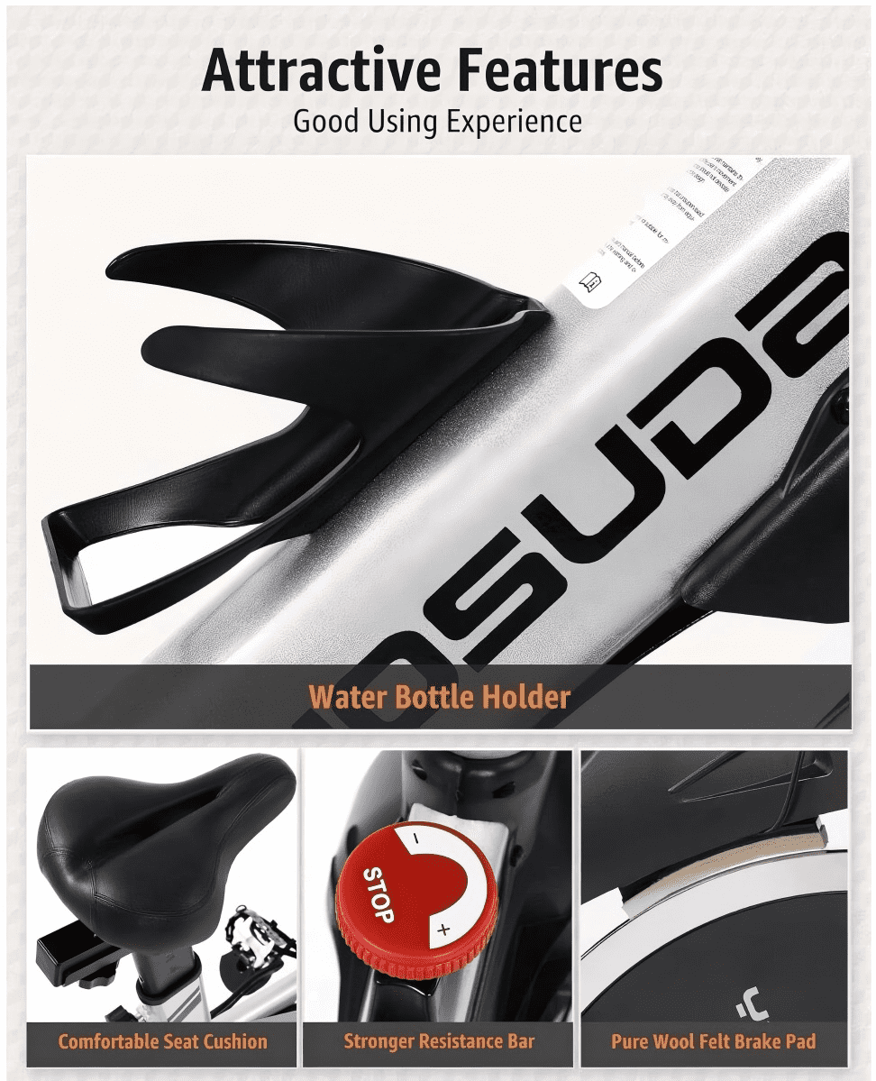 UPGO Indoor Cycling Bike Stationary Bike with 270lb Max Weight Exercise Bicycle with Ipad Mount & Comfortable Seat Cushion for Home Cardio Workout Description: UPGO, UPDATED BRAND FOR YOSUDA , UPGO indoor cycling bicycle is a smooth, durable and easy to maintain bike designed to enable cyclists to exceed preset limits. In addition to its sturdy steel frame and nearly silent belt drive, the UPGO cycling bike features many customizable settings. It is decked out with a 35 lbs flywheel, LCD monitor and water bottle holder. 2-ways adjustable handbar and 4-ways seat provide cyclists feel comfortable riding. Transportation wheels make it easy to move. Maximum user weight: 270 lbs. Flywheel 35lbs Drive System Belt Drive Adjustable Seat Up/down and Front/ back Resistance Friction resistance, adjustable Horizontal Adjustment Knobs ✓ Inseam Height 25″-35″ Assembled Dimensions 40 x 22 x 45 inches (L x W x H); 68LBS Max User Weight 270LBS