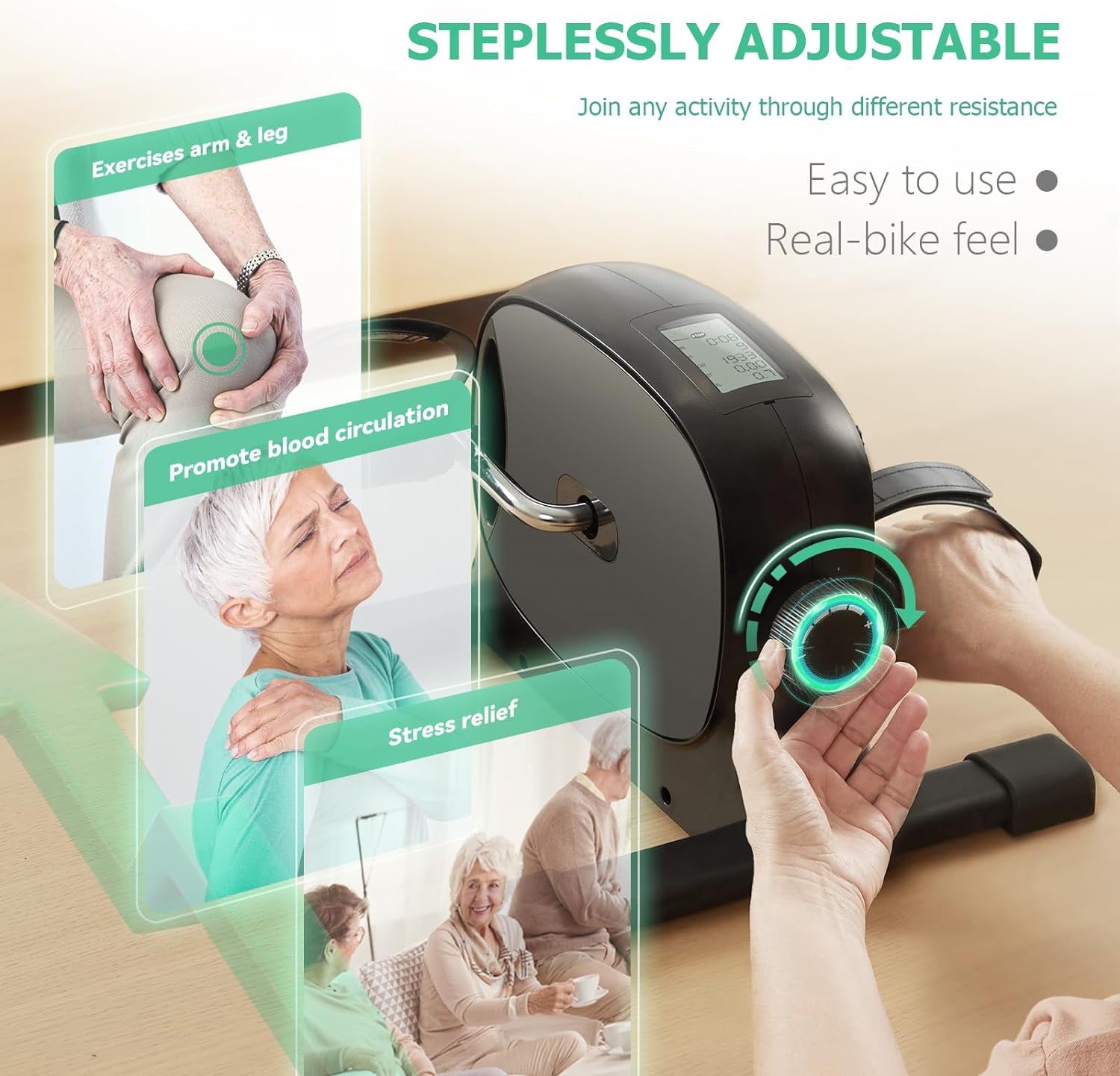【Hyper Quiet and Smooth】Thanks to the latest flywheel technology, upgo under desk bike has a much smoother system and less noise during exercise, only about 10 dB; There were no lags and it ran smoothly from start to finish; This could be used to improve physical therapy for people in rehab, as well as to improve the lack of blood circulation caused by a sedentary lifestyle and to restore and maintain motor function. 【Infinitely Adjustable Resistance】UPGO under desk bike is equipped with adjustable resistance knob, using the latest damping technology, even if you increase the resistance will not produce the feeling of “miss one’s step”, the completely smooth resistance from small to large to meet the needs of different groups of people, to bring a personalized experience. 【Clear and Easy to Read】UPGO mini exerciser bik with a large 1.7*3 inch LCD screen, you can simultaneously and accurately record speed, time, count, distance, total count and calories on this oversized display. All data at a glance and no need to switch manually, and easily keep track of your workout progress. 【Better Fit for Legs】Adjustable velcro is used on the sides of the pedals to fit all sizes of foot and palm, allowing them to fit tightly and not come off during exercise. 【Rugged & Non-Slip】This pedal exercises bike is made from 3mm thick commercial steel tubing, and four large non-slip rubber pads keep the mini exercise bike from slipping even under maximum resistance, and it protects the floor from scratches very well. 【Portable and Easy to Store】Lightweight design, portable and easy to store. The portable handle function makes this under desk bike always ready. Product size: 15.75″ x 14.57″ x 10.63″. You can put it under the desk, beside the sofa or in the locker. Small size and space saving – can be used at home or office.