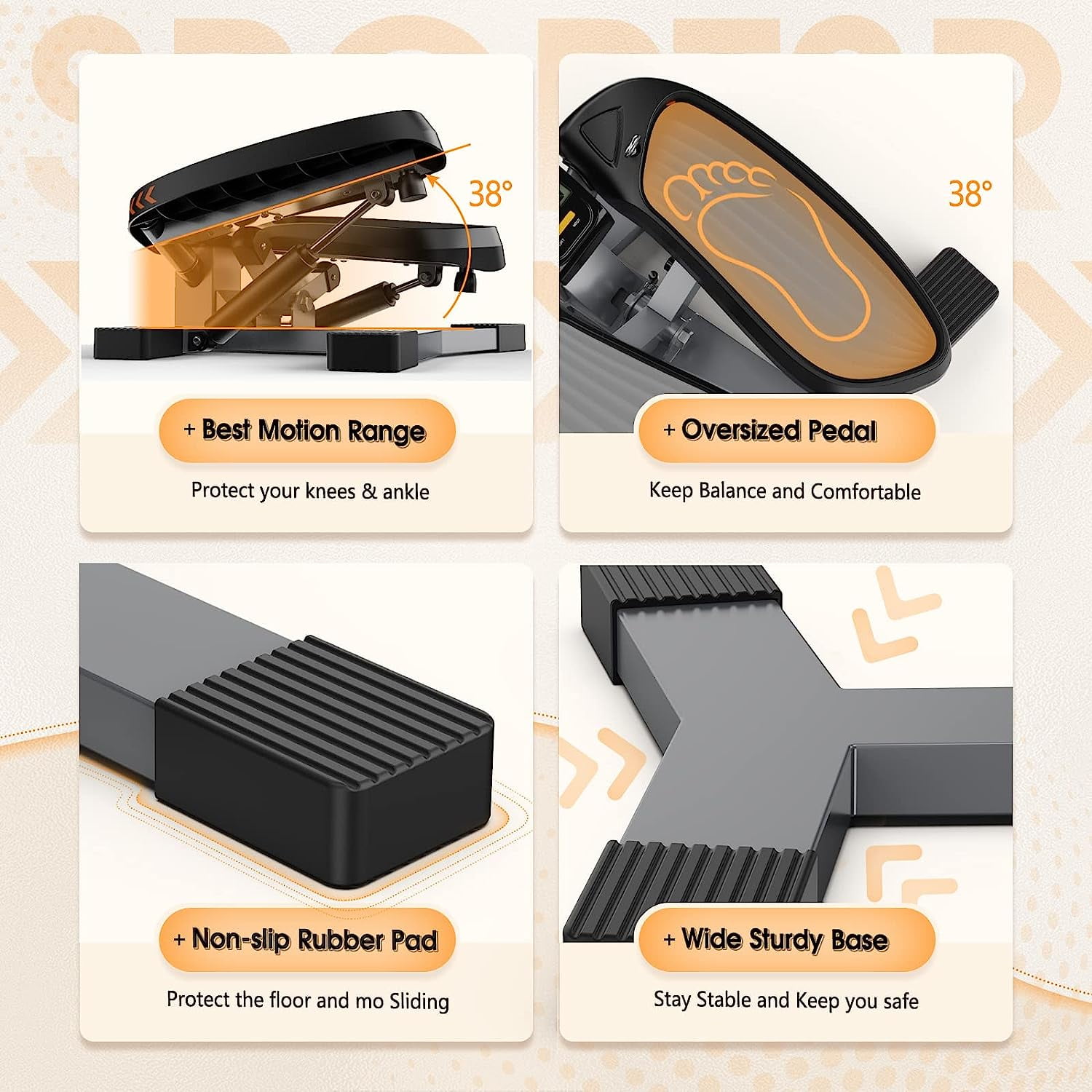 【Updated UPGO Portable Stair Stepper】Compared to the traditional cable-pully mini stepper, we used 2mm high quality steel and precision bearings.After thousands of tests,we make sure our step machine are safe and durable to support 330lbs. Size: 19.69x 18.11 x 9.84 inches 【Hydraulic Drive System】European standard hydraulic cylinder strengthen on the stair stepping fitness machine let you enjoy your stair stepping fitness in a quiet environment without disturbing others. The internal super-energy spring that protects the joints and provides a good cushioning effect. Pay attention that the hydraulic tube need rest after 20-minutes exercises. 【Twist Stepper with Resistance Bands】Twist action helps you tone thighs and buttocks, while achieving a challenging cardiovascular workout. Resistance Bands work arms, chest, back, and shoulders for total body workout. Perfect for weight-loss, body-shape,and daily exercise. 【Digital monitor】The LED monitor on the mini stepper can clearly record exercise time, count, calories burned total count,and distance in mile. The screen on the monitor is twice as big as that of other fitness stepper exercises equipments. It is convenient for you to know your exercise situation and make your next exercise plan. 【Wide Non-slip Pedals】Our mini stair steppers use oversized pedals with silicone anti-skid pad as well as the skid-resistant floor protectors to keep your balance when you exercise. Rubber shock-absorb cushions keep mini step machine quite. 【Fully assembled】This portable stair stepper is fully assembled and space-saving. It only takes 0.23 SquareMeters of space. No worry, we provide lifetime customer service and support!