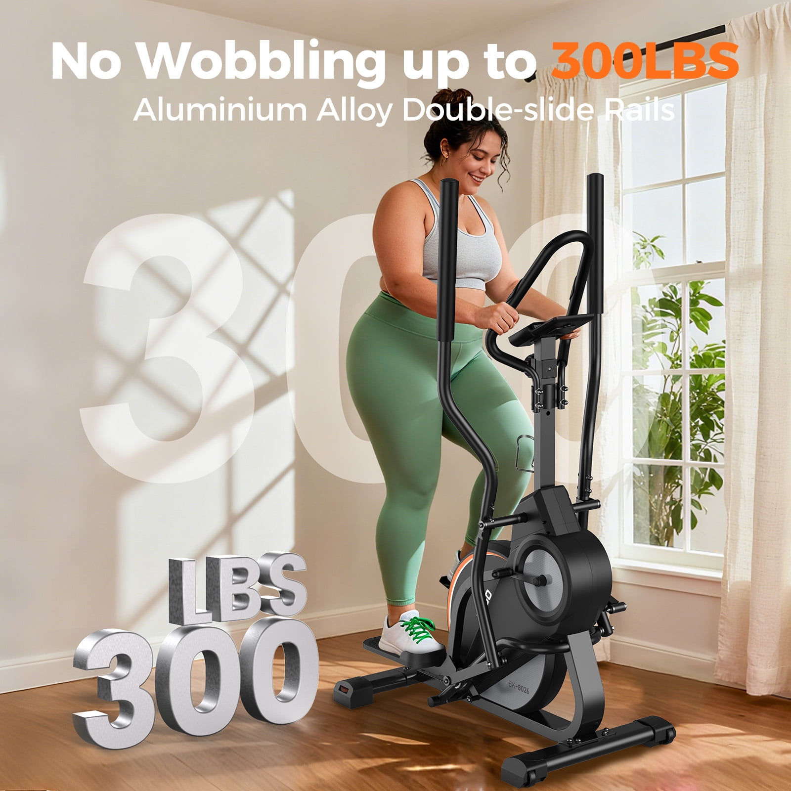 【18LB Flywheel with 16 Resistance Control】This exercise elliptical cross trainer climber comes with 18LB heavy flywheel, 16 resistance levels and 45° climbing stride motion, effectively improves the exercise efficiency than the traditional elliptical machine and makes the exercise more sweaty. No electrical source needed. All stages exerciser can get efficient exercise, no matter you are beginner or fanatic 【Solid Build】Confidently enjoy long-lasting climbing and striding sessions thanks to the 15mm thickened frame tube and updated 300lbs max user weight. Heavy-duty front and rear stabilizers contribute outstanding stability, keep the climber machine stable, provide you a safe climbing without any wobble 【Hyper-Quiet and Smooth Operation】Perfect for shared spaces. We developed the latest technology magnetic system and eliminates noise, also control the sound at 26DB even after millions of times workout. The aluminium alloy double-slide rails provide smooth climb and stride, protecting your knees 【Exactly Calculated Data】Advanced monitor stays on track of your CALORIES, TIME, SPEED, DISTANCE, ODOMETER and PULSE. All datas are dual-calibrated by serious algorithms, motivate you by visualizing your exercise effect, help set more exact targets to achieve your exercise goals 【Space Saving】With the most compact design in the class that fits almost any space in your home, apartment, or fitness room. Only 38x21x62inch, save 20% space at least than other cardio machines. Equipped with front rollers for easy relocation anywhere 【Long-life Service Promise】We promise to provide a life-long service to UPGO cardio climber. We pay for all of the replacement costs if customers need replacements. We have set a professional online service team, your concerns are answered within 24 hours. 100% satisfied customer service!