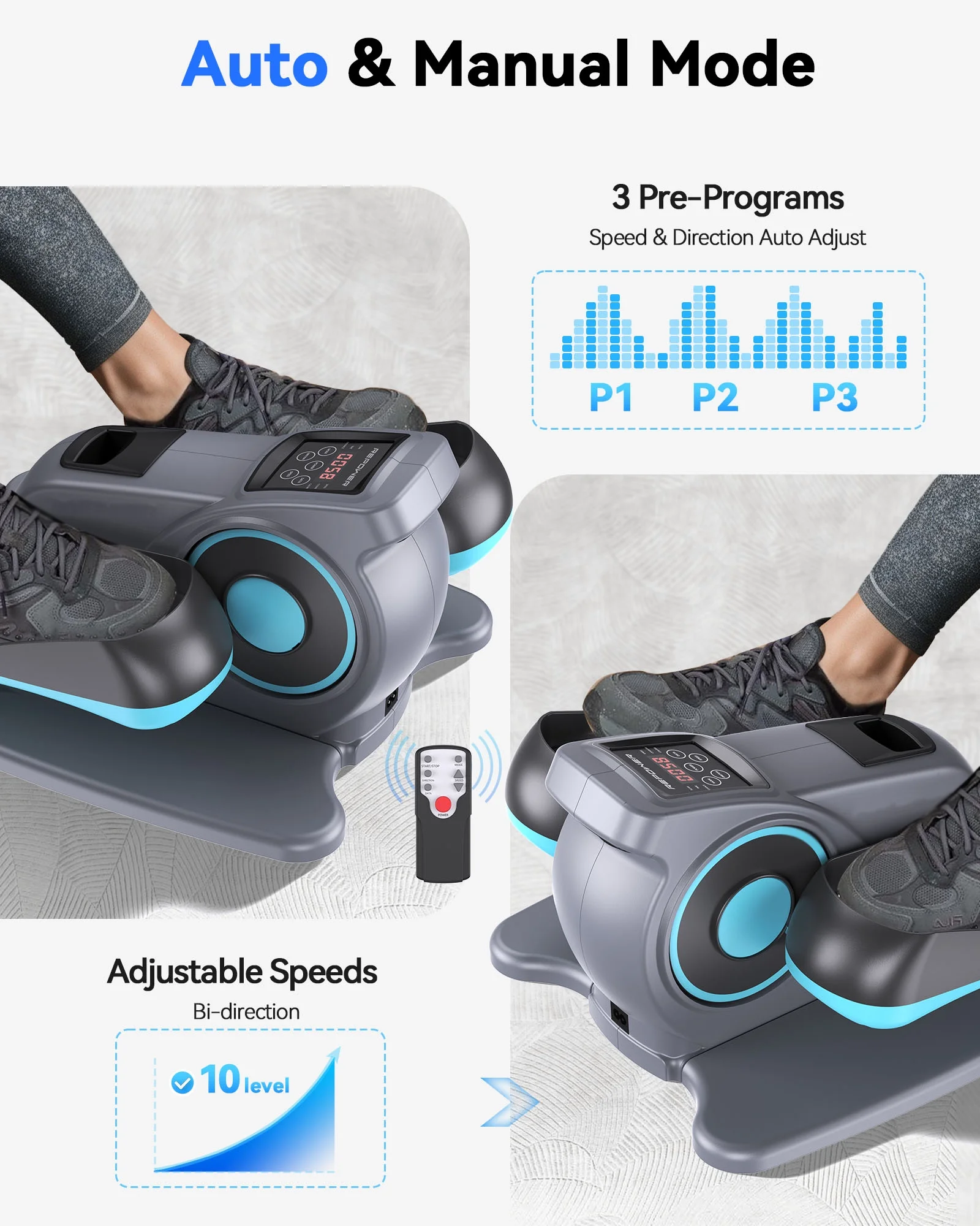 Electric Under Desk Elliptical Machine: UPGO Under Desk Elliptical provides a gentle, low-impact workout. It helps improve circulation, strengthen muscles, and boost energy levels, making it perfect for seniors, office workers, people who need leg rehabilitation and anyone looking to stay active throughout the day.
