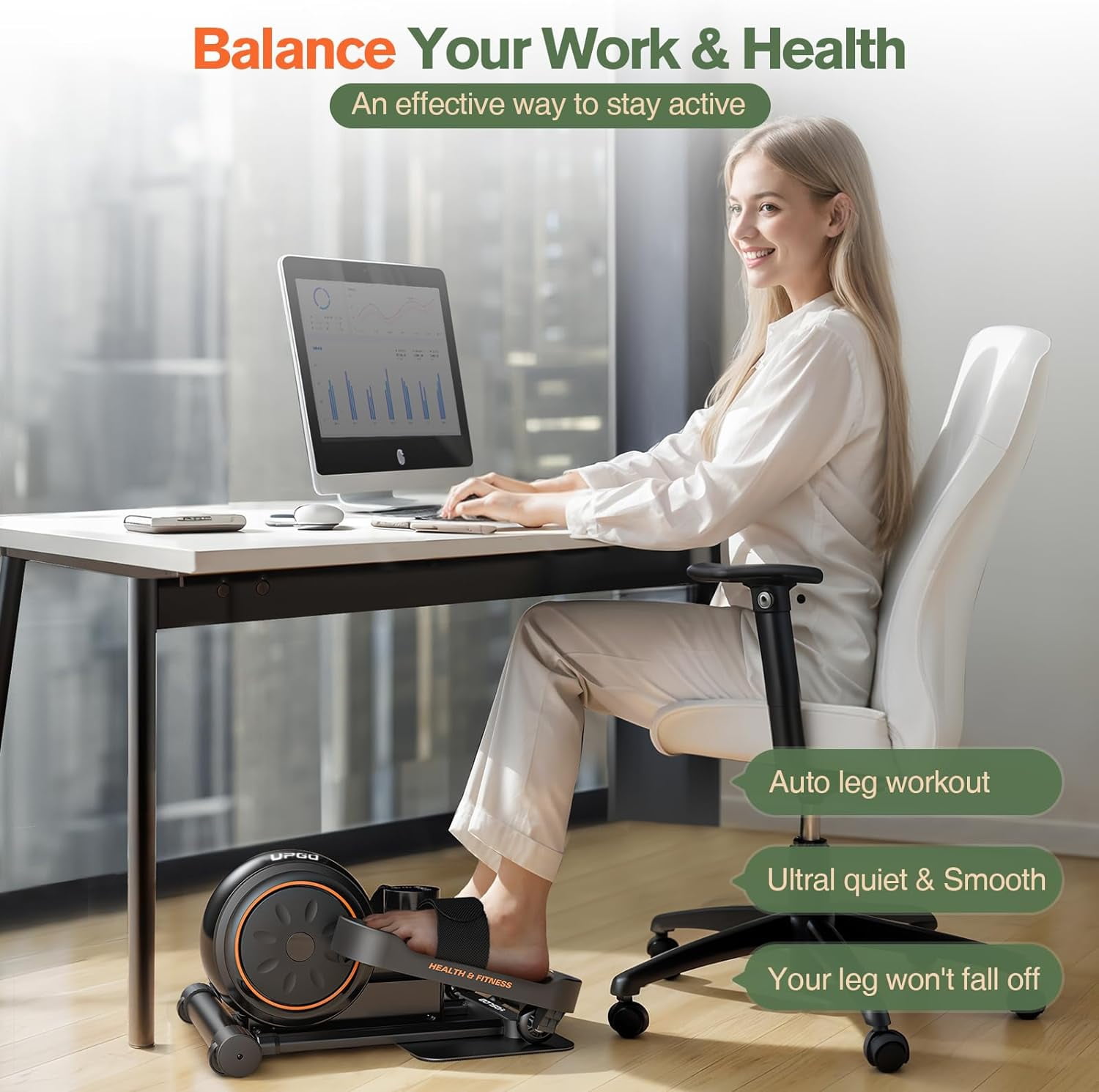【Upgraded Ellipse Leg Exerciser】UPGO seated auto leg exerciser is equipped with an efficient electric power assist system, providing you with strong power and unique low-impact exercise. It can not only help promote blood circulation and burn calories but also help the legs adapt and recover quickly. Effortless power-assisted movement frees your mind to enjoy your favorite seated activities! 【Super Easy on your Joints】We created this Ellipse leg exerciser with a 20cm Rotational Diameter, longer than others, this provides more exercise and range of motion that’s also super Low Impact and ultra Smooth! 【Resistance & Speed: Meet Every Workout Need】This under desk elliptical adopts the latest motor system. The two power-assist modes ensure that you can adjust the exercise speed (1-10 levels) and exercise intensity (10 resistance levels) according to your physical condition and recovery needs, ensuring that your training gets the best results. Forward & reverse movement to work different muscle groups. Great for many forms of rehabilitation! 【Exercise Anytime & Anywhere】UPGO under desk elliptical’s unique tie rod and roller design make it easier to move. The compact size fits seamlessly under the desk. We add a strap to keep your feet on the pedal, so your feet don’t slip during exercise. This motorized seated elliptical is suitable for various scenarios, whether you are at home or in the office, you can exercise and stay active! 【Quiet and Smooth】UPGO seated ellipse leg exerciser adopts an innovative motor and noiseless friction pads to ensure smooth and quiet operation, no worry about disturbing your family or colleagues while working, watching TV, or reading! We also pay attention to the user’s comfort. The large non-slip pedals and anti-slip straps are ergonomically designed to ensure a more comfortable and safer exercise experience! 【Easy to Use & Senior Friendly】The operation interface is simple, intuitive, and easy to use. There are no complicated programs or settings to navigate. Simply press the button on the remote control and easily start, stop, and change speed, resistance, and direction, saving you the trouble of bending down. You can also connect to the mobile app via Bluetooth to monitor your exercise. 【Ultimate Health Gift】We choose strong and durable materials for the UPGO upgraded ellipse leg exerciser. They have undergone strict quality control and testing to withstand long-term use. UPGO electric under desk elliptical can improve the health problems caused by prolonged sitting, work efficiency, and quality of life. It is an ideal gift for relatives and friends! 【Choose UPGO 】20 years of excellent home fitness equipment brand, trusted by more than 1 million families. No need to worry about after-sales issues, we provide 30-day free replacement and permanent warranty services. UPGO professional customer service team is available to answer your questions anytime!