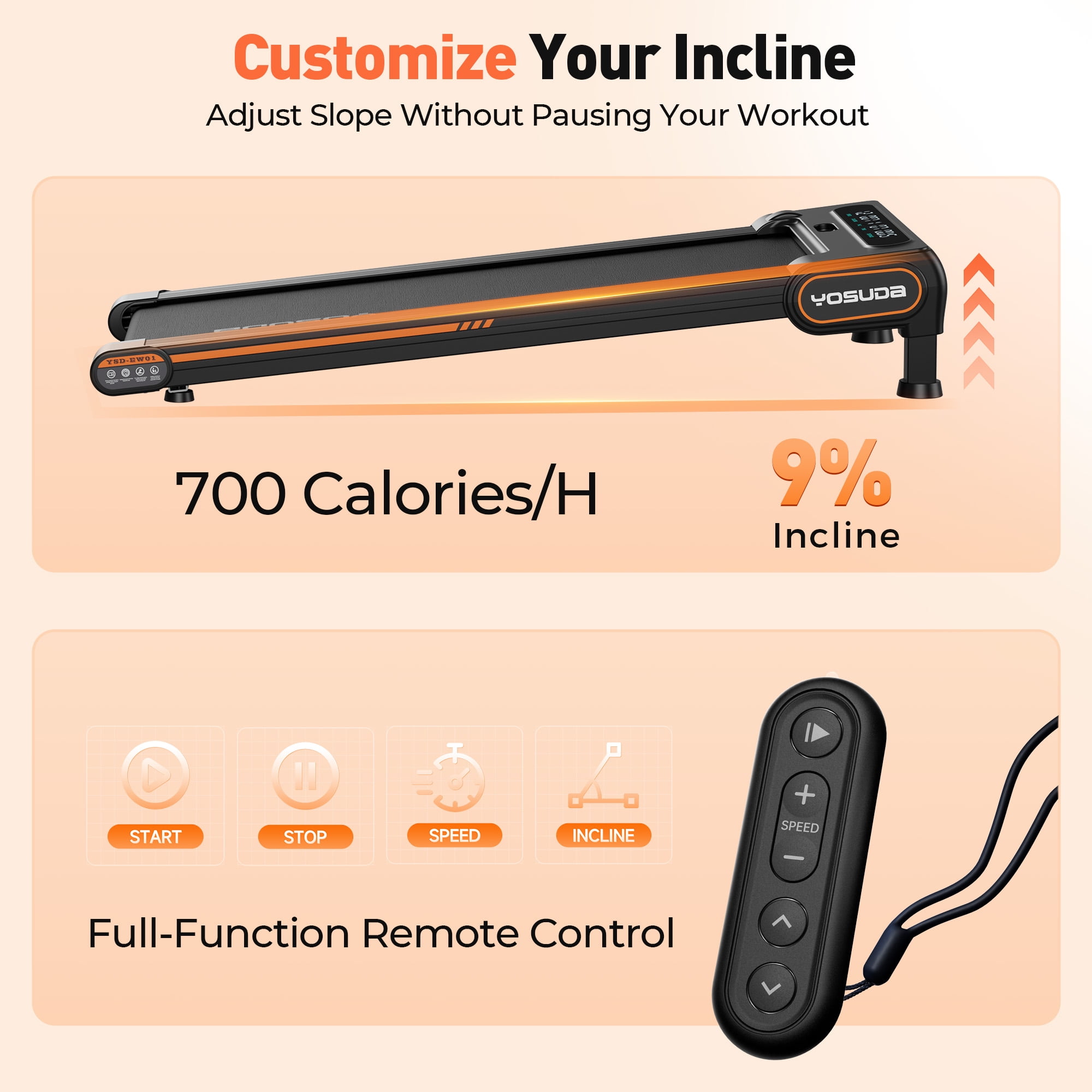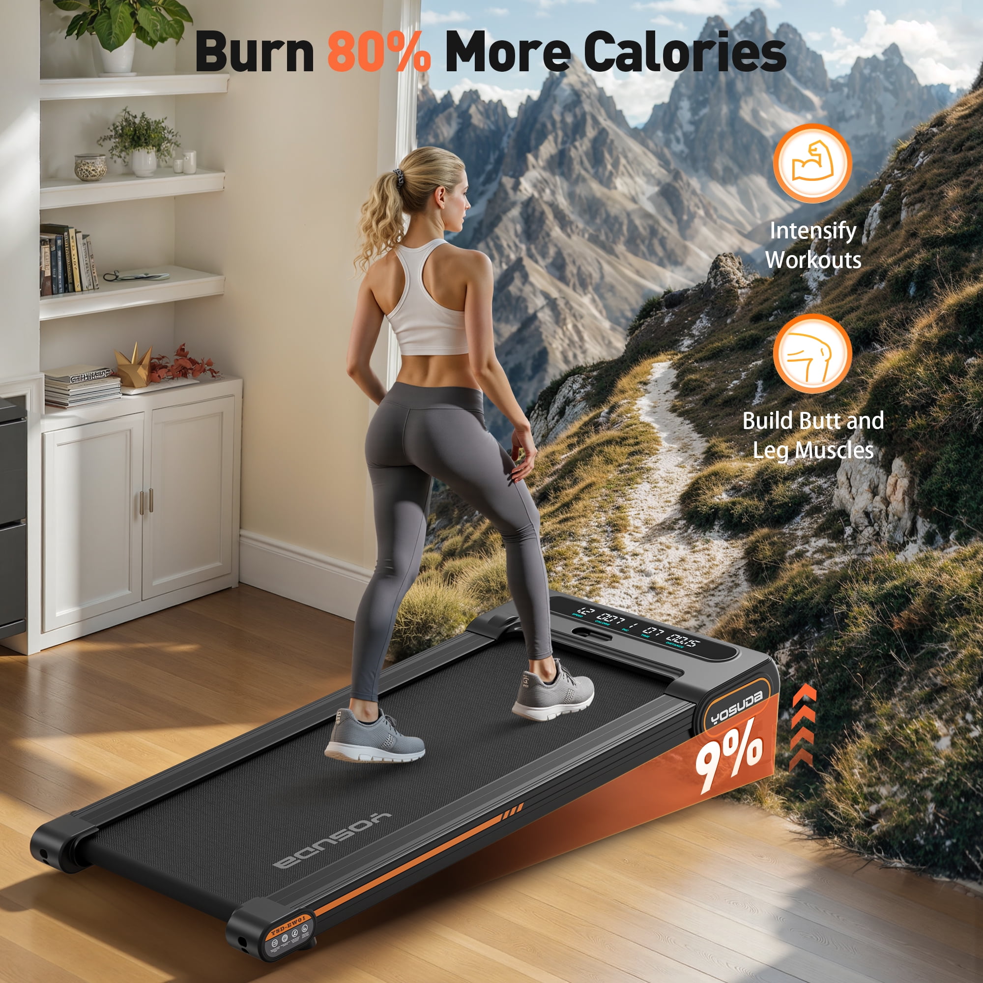 UPGO Walking Pad with Auto Incline up to 9%, Under Desk Treadmills with 350LBS Weight Capacity, 3-Slope Incline and Large LED Display Description: Experience double the fat burning with UPGO walking pads, featuring an incline of up to 9%. Elevate your workout efficiency effortlessly and achieve your fitness goals faster. Upgrade your treadmill routine with our 3-stage incline, easily adjusted via remote. No pausing or stepping off—just a button press for a gradual, safe slope shift. Convenience meets safety, keeping your focus on the workout.