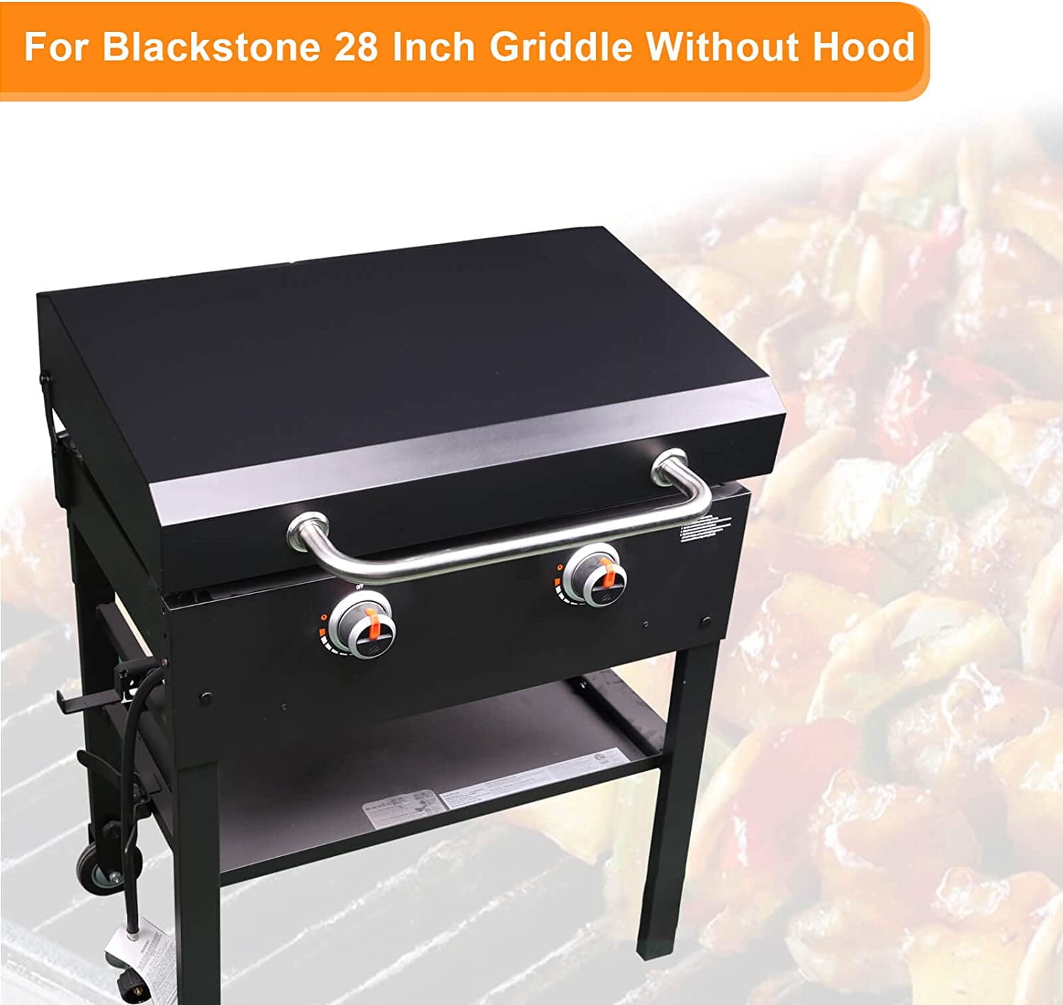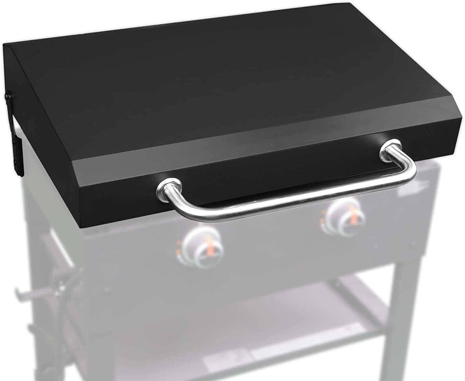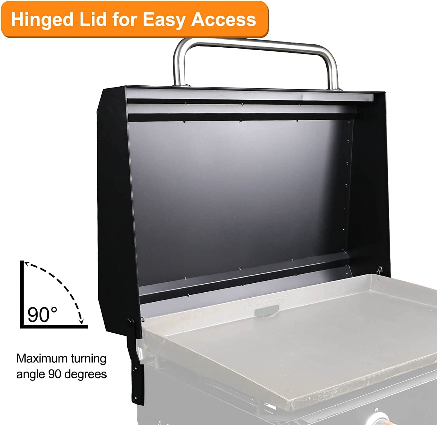 Perfect Fit: Hinged lid For Blackstone 28-inch griddle without lid. Griddle lid for Blackstone 28-inch flat top grill, such as model 1517,1853,1605,1803,1839,1856,1885,1924,1983,2094,2145 Material: This lid is made of high-quality steel to ensure long-lasting use and sprayed with high-temperature resistant black powder coating, generous and beautiful while ensuring durable performance Protection: Protect the griddle surface from rain, dust, dead leaves, and other bad influences Retains Heat: Cover and retain heat during cooking for faster cooking times. Covering the hinged lid also prevents grease splatter Act As a Wind Guard: When fully open, ideal for blocking the wind blowing towards the griddle area to prevent heat loss Hinged Lid: Lid with hinges for easier opening and closing. The maximum opening angle can be up to 90 degrees, which will not affect your grill at all Durable Handle: This comes with a handle for easy lifting and closing. Easy to access your griddle surface. Package: 1 x Griddle Lid, 1 x Handle, 2 x Support Brackets, and a set of screws
