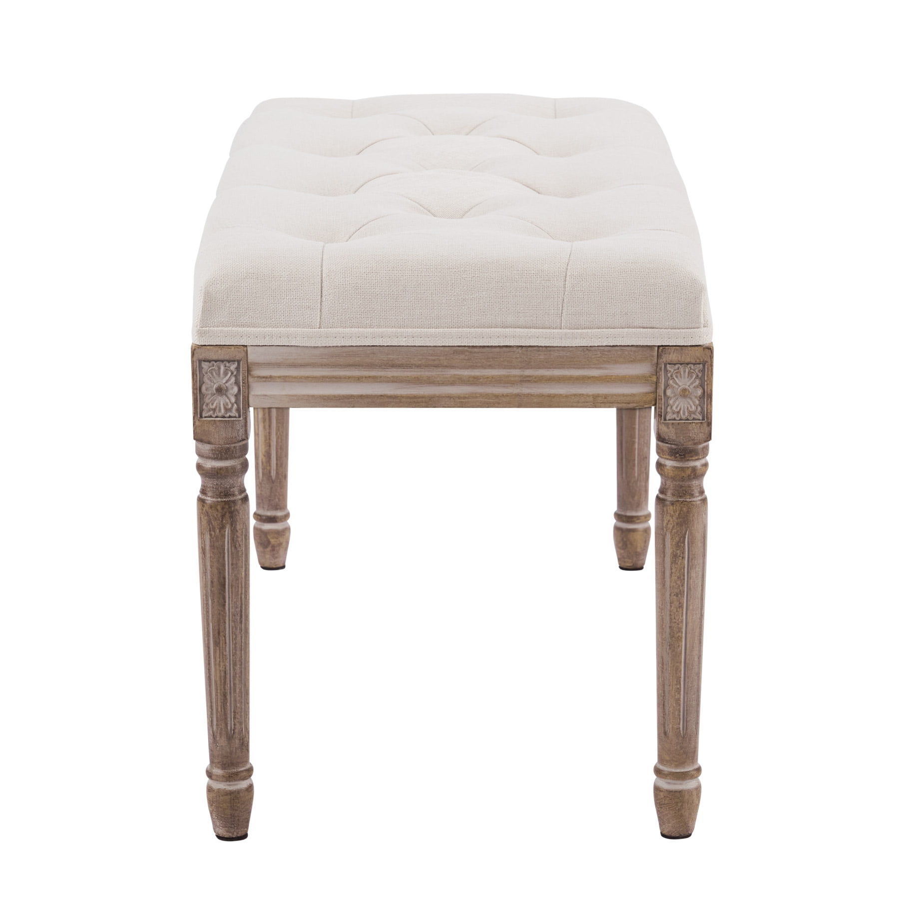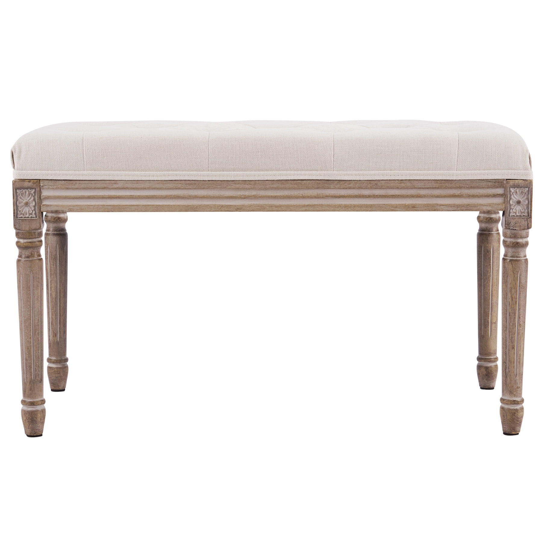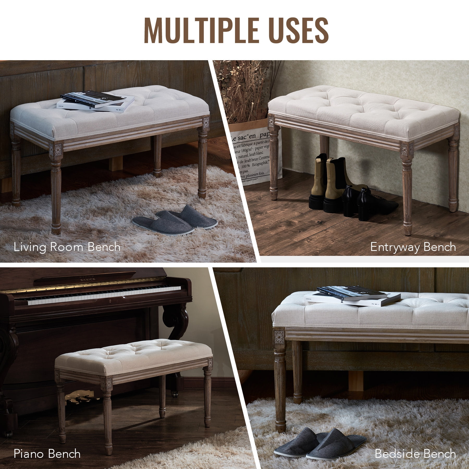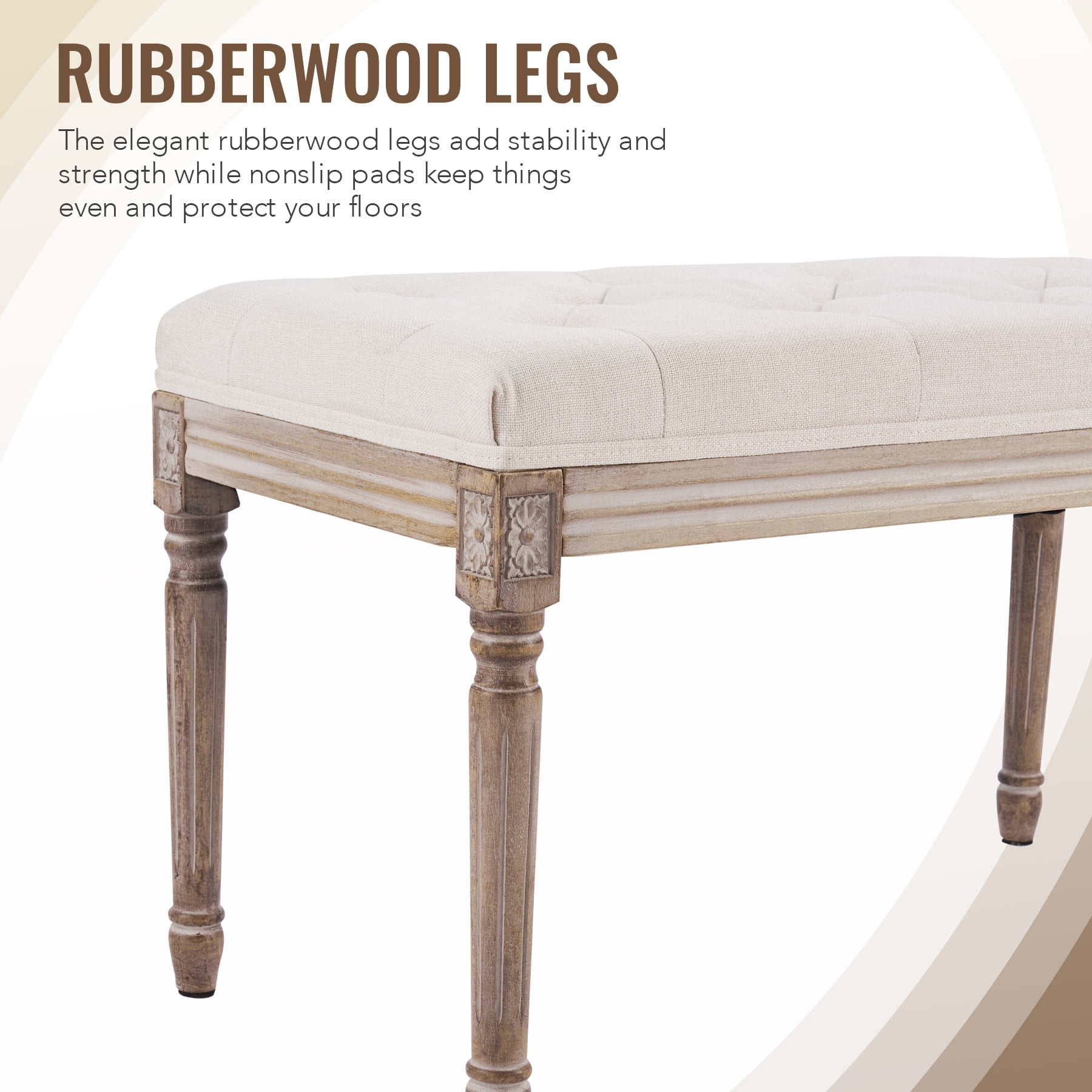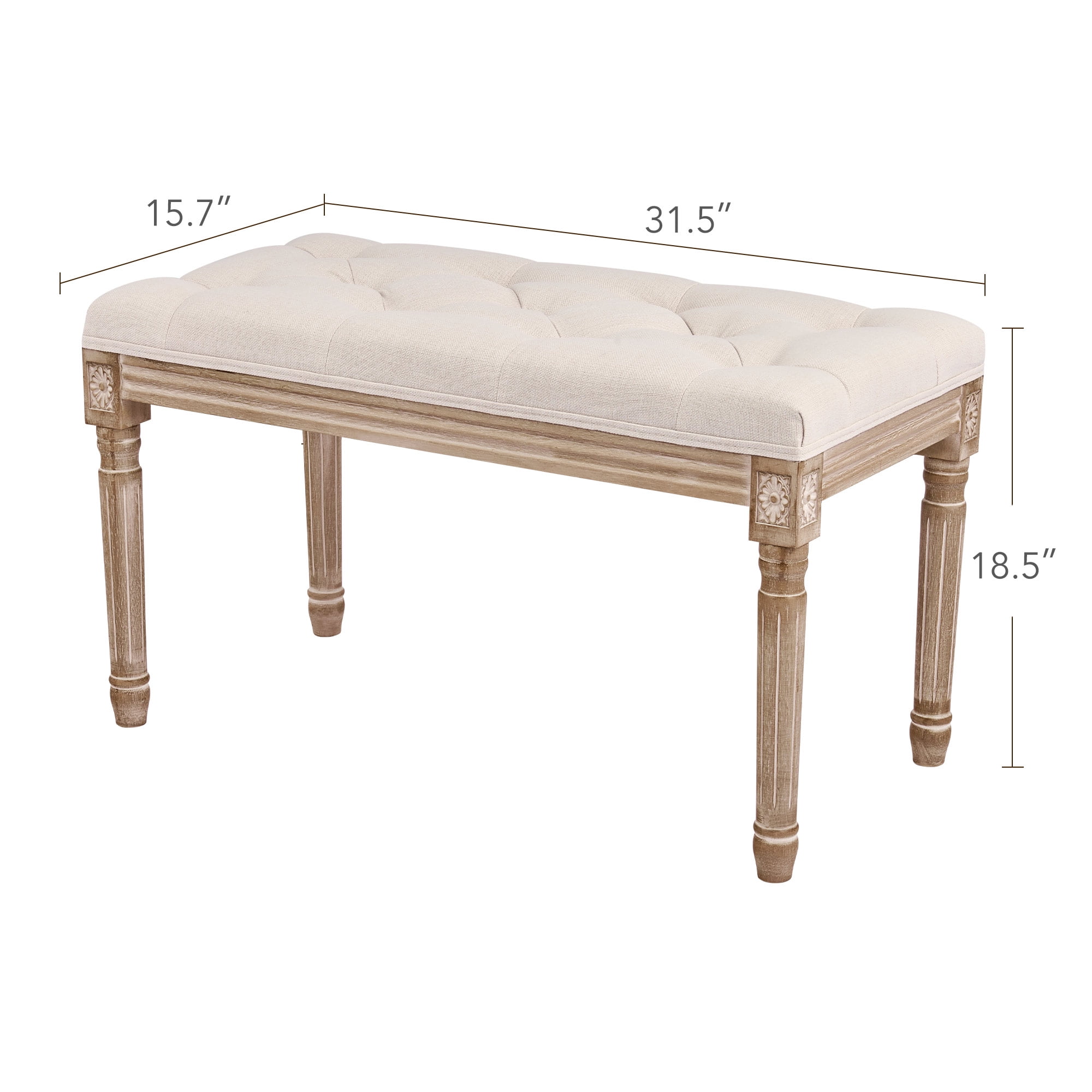 FUNCTIONAL ART: Enjoy all the panache of vintage French furniture with none of the discomfort or worry! This beautiful, comfortable, and versatile upholstered bench combines classic Old World style with modern materials and comfort easily suits any home decor. SUPERIOR QUALITY: Our vintage bench’s birch frame and rubberwood legs come with a pleasing weathered finish but are themselves highly durable, boasting a 330 pound weight capacity and family-friendly upholstery. The floor-friendly rubber pads hold but protect any surface. GRACEFUL ACCENTS: The thick foam padding of this 31.5×16.5 inch bench incorporates diamond tufting, while the solid wooden legs are delicately carved with vintage patterns. HIGHLY VERSATILE: An easy fit in any space, this multipurpose bench works great in foyers and entryways but is just as suitable as a comfortable piano bench, as a handy bedroom bench, or as extra seating in your dining or living room. ASSEMBLES QUICKLY, LASTS YEARS: Pre-drilled holes beneath the cushion guide quick and easy assembly, with all necessary tools included. You’ll be done in minutes: just align the legs, tighten their bolts, and enjoy! Want to enjoy classic Old World charm without sacrificing American strength or functionality? Our plushly upholstered bench is here for you! Styled after vintage French furniture, this stylish hallway or entryway bench has traditional carved ornamentation but offers modern comfort with its thick foam padding. The birch frame and rubberwood legs are weathered to an attractively lived-in look but will give you 330 pounds of capacity and years of dependable service. Functional pomo art with classic taste, this bench works in any space and decor from traditional farmhouse to contemporary minimalist. Whether cozied up to a piano or used as an end of bed bench, this excellent modern seating is sure to brighten your room and your life. Start enjoying a more comfortable and stylish life today with this graceful vintage furniture! Specifications Materials: Birch, Rubberwood, Linen, Cotton Foam Color: Beige Dimensions: 31.5 x 16.5 x 18.5 in. (80x42x47 cm) Weight Capacity: 330 lb. (150 kg) Net Weight: 11.5 lb. (5.2 kg) Package List 1 x Upholstered Entryway Bench 1 x Instruction Manual