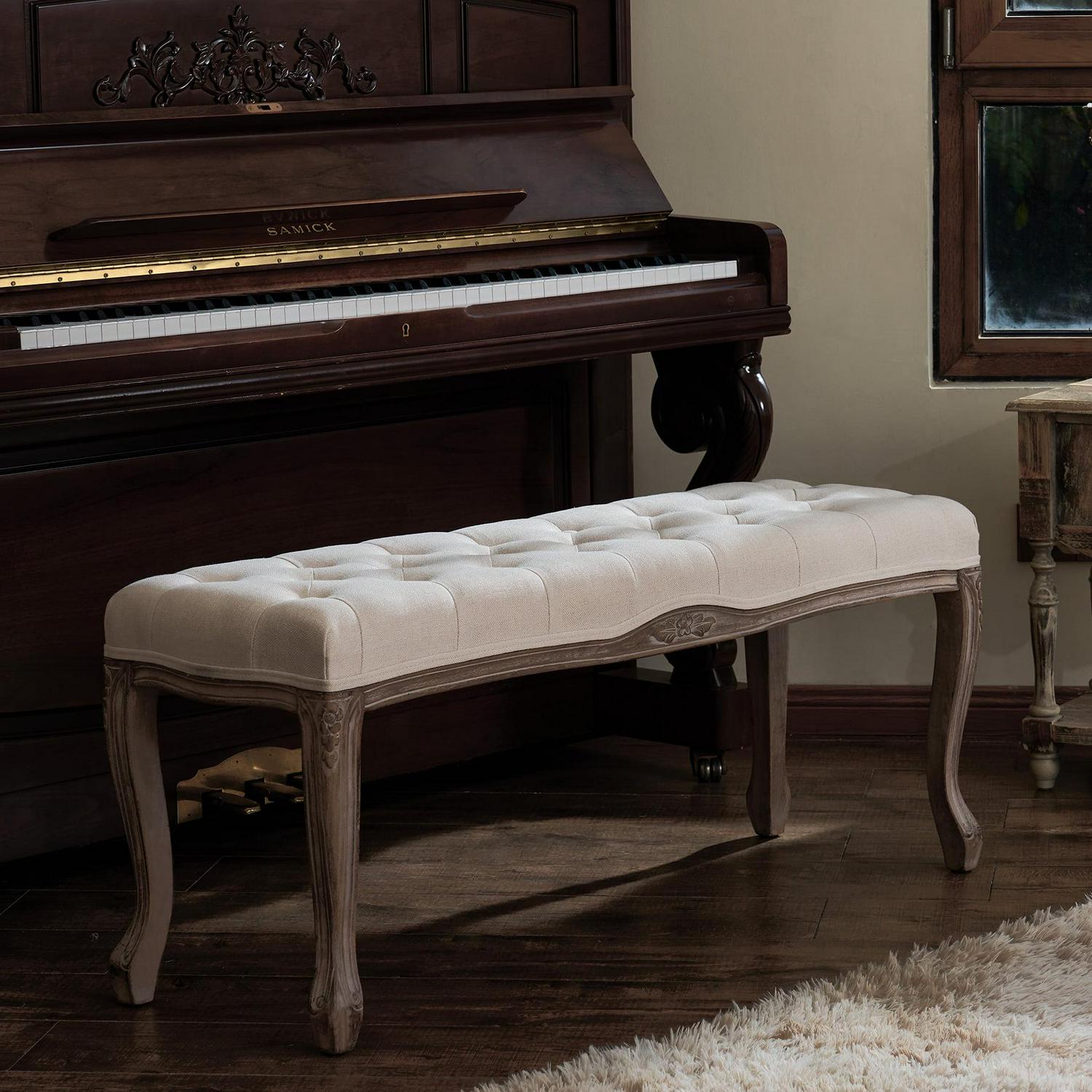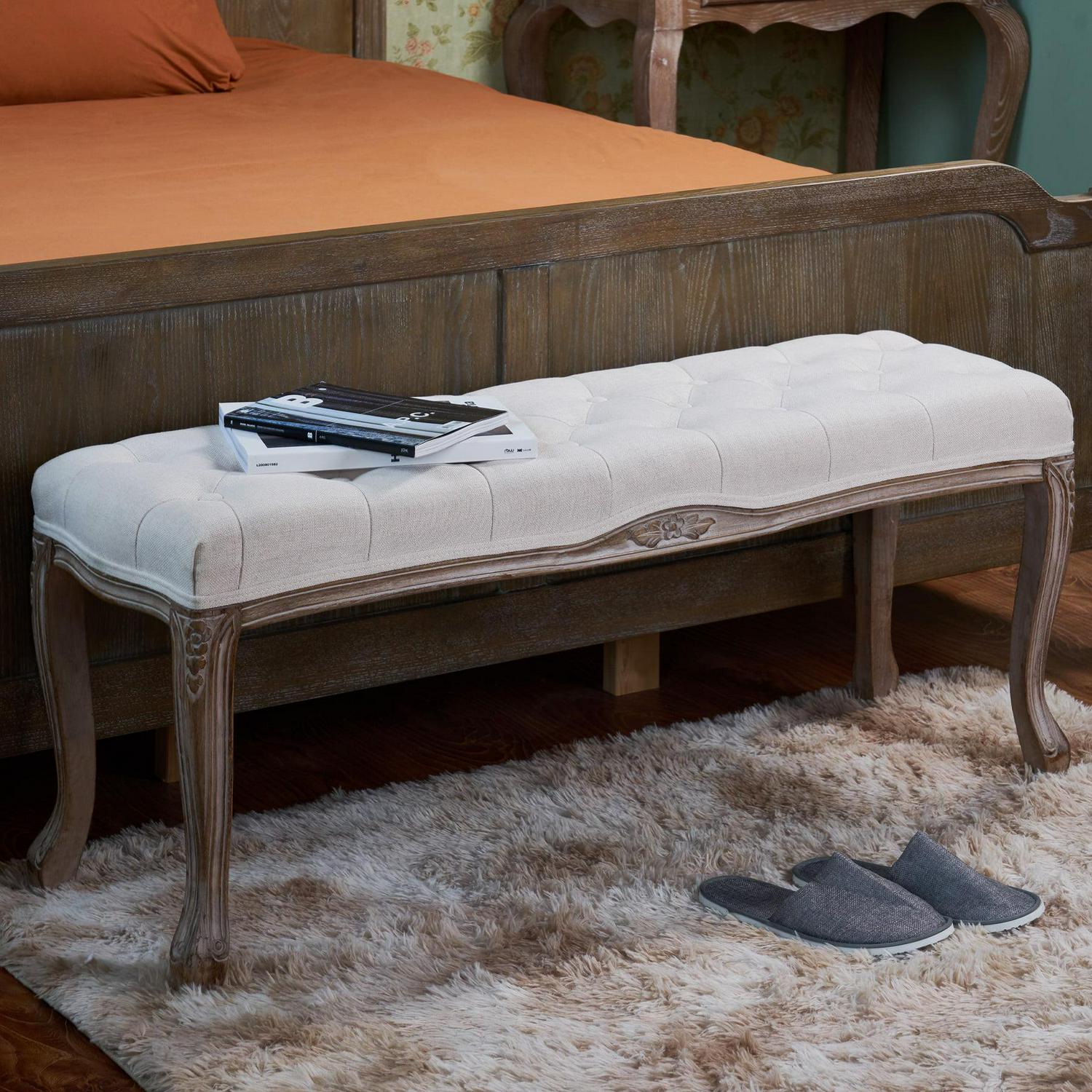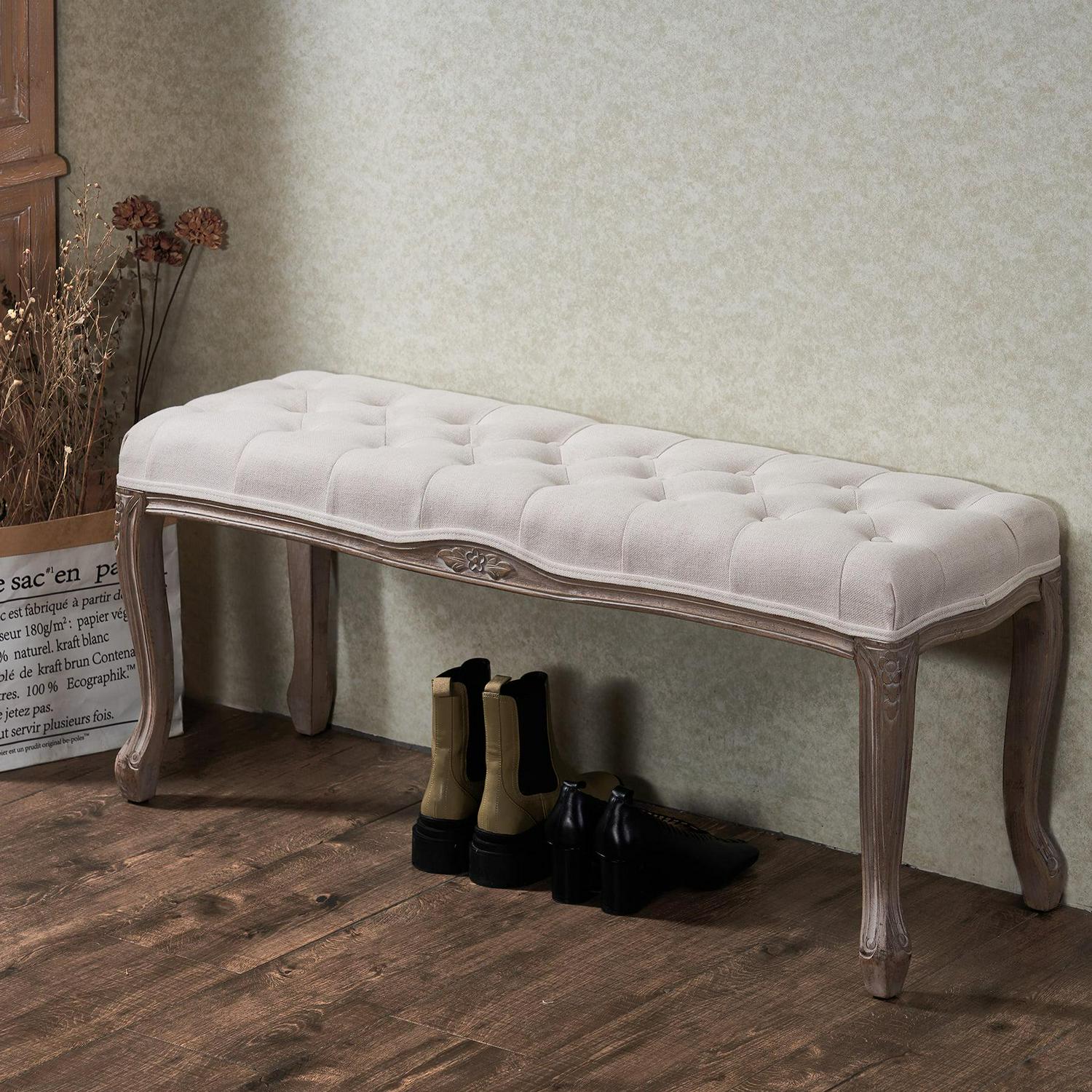 – VINTAGE FRENCH STYLE: Weathered wood legs with delicate patterns carved onto them make this bench elegant. Birchwood paired with natural linen adds something fresh and attractive to it.