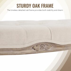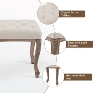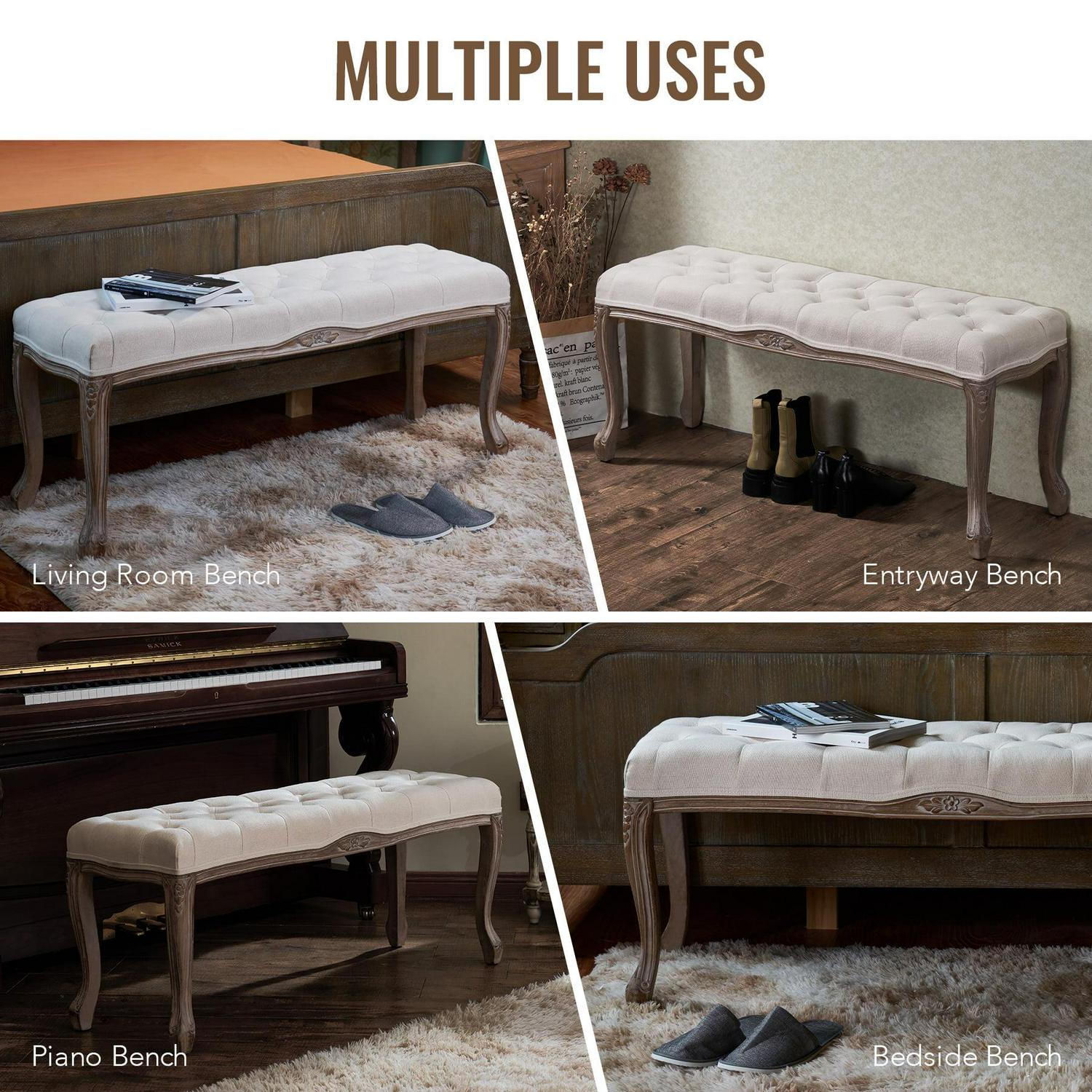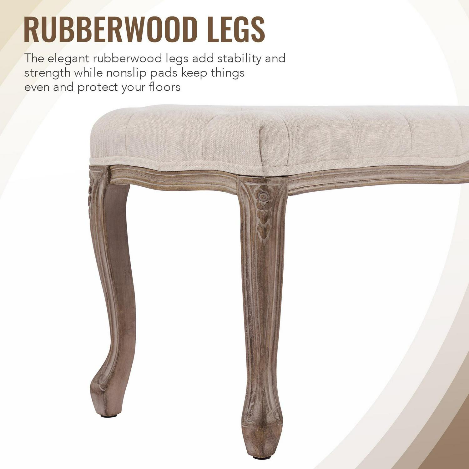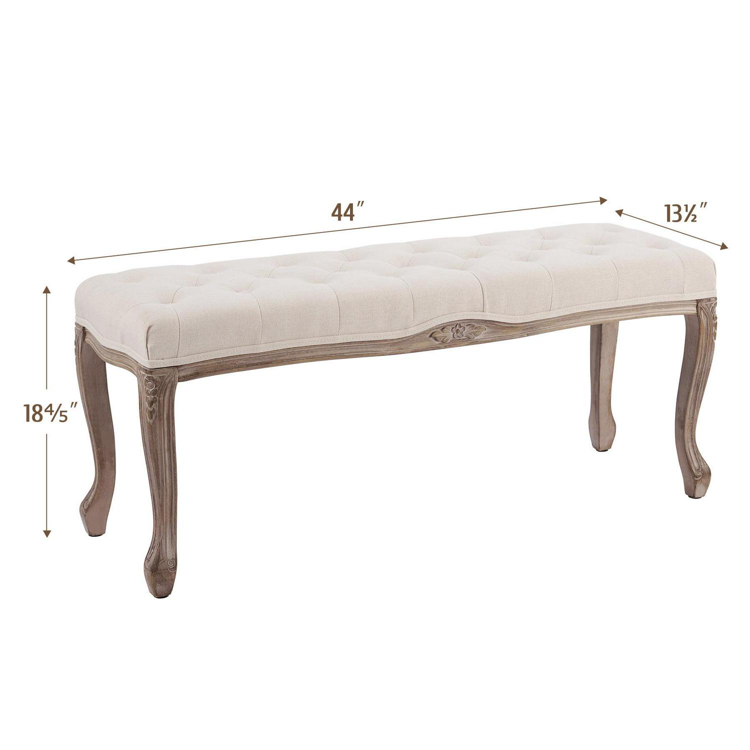 – VINTAGE FRENCH STYLE: Weathered wood legs with delicate patterns carved onto them make this bench elegant. Birchwood paired with natural linen adds something fresh and attractive to it.