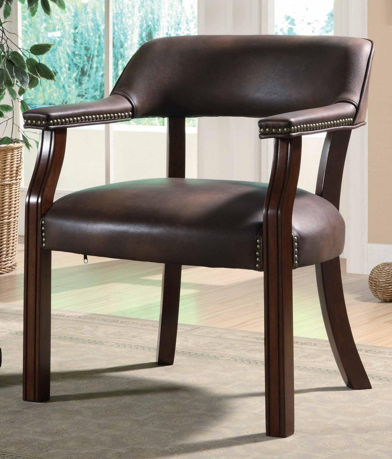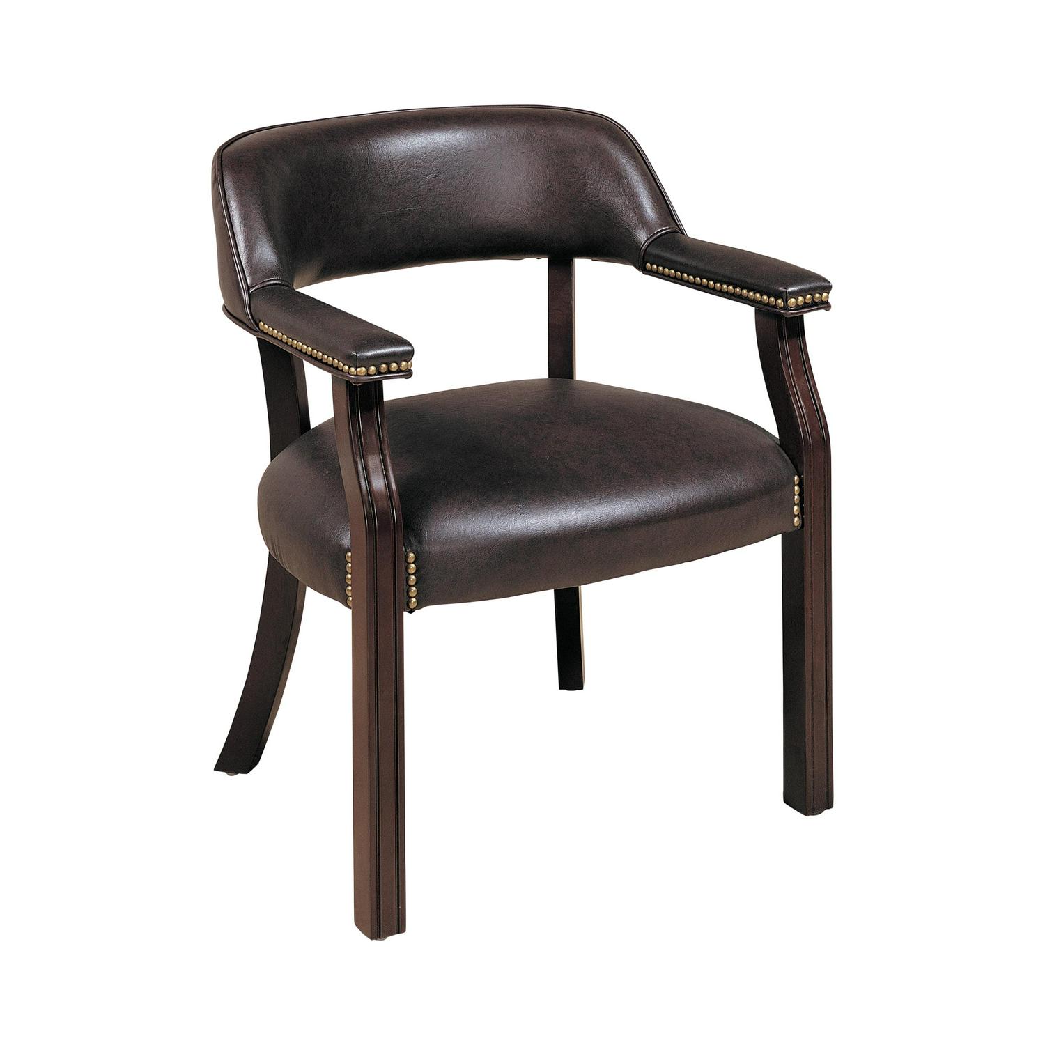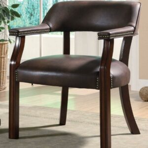 Designed for a traditional office, this burgundy office chair features clean legs and plush cushioning. Sewn details adorn the red toned leatherette fabric and complement classic design. The dark and smooth wooden legs in a cappuccino finish feature straight lines and curved back legs for a modern touch. Warm up a richly hued space with the softness of the open and curved back. This piece looks great behind a big wooden desk or in a home library.