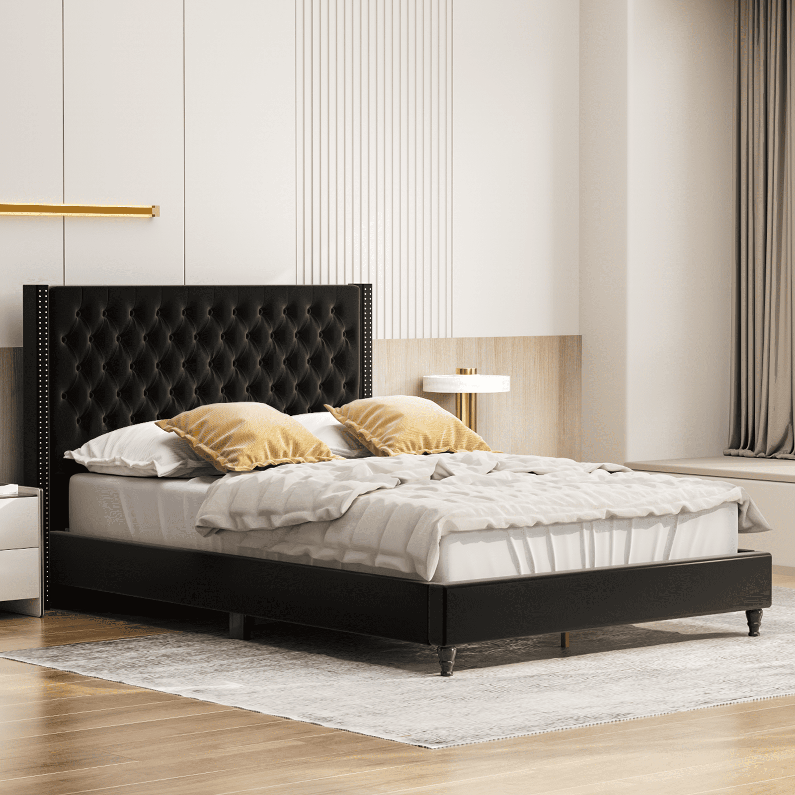 Sturdy & Stable: The upholstered bed is made of natural poplar wood, no glue, no special smell. Strong support wooden bunkie slats can load up the weight of 4 average-sized adults. Modern Design: The design of the upholstered bed frame is button diamond and a wingback headboard with vintage nailhead trim, which is suitable for all kinds of people and will be a better blend in the bedroom. Noise Free: The low Profile Platform Beds and box spring design allow children, pets, and people with limited mobility to easily go to bed and spend a good time.The upgraded locking system can prevent the generation of noise to the greatest extent. A certain amount of clearance is provided between the bed slats and the bed frame, reducing friction for a quiet and comfortable sleep. Packages and Assembly: The package includes 2 packages with the bed frame, instruction manual, and Assembly tools. The installation time is about 20-30min.Please tighten all the screws after building all the frames to ensure the balance and stability of the bed frame installation. It is recommended to use it on flat ground to achieve the purpose of prolonging the service life of the product. 8″-15″ mattress is recommended. Romantic Headboard Design: The tufted bed frame adopts button diamond and wing headboard design, which will be a more romantic feel to the room. The High resilience and high-density sponge headboard gives strong support to the head and back so that you don’t feel tired when your lumbar work for a long time.