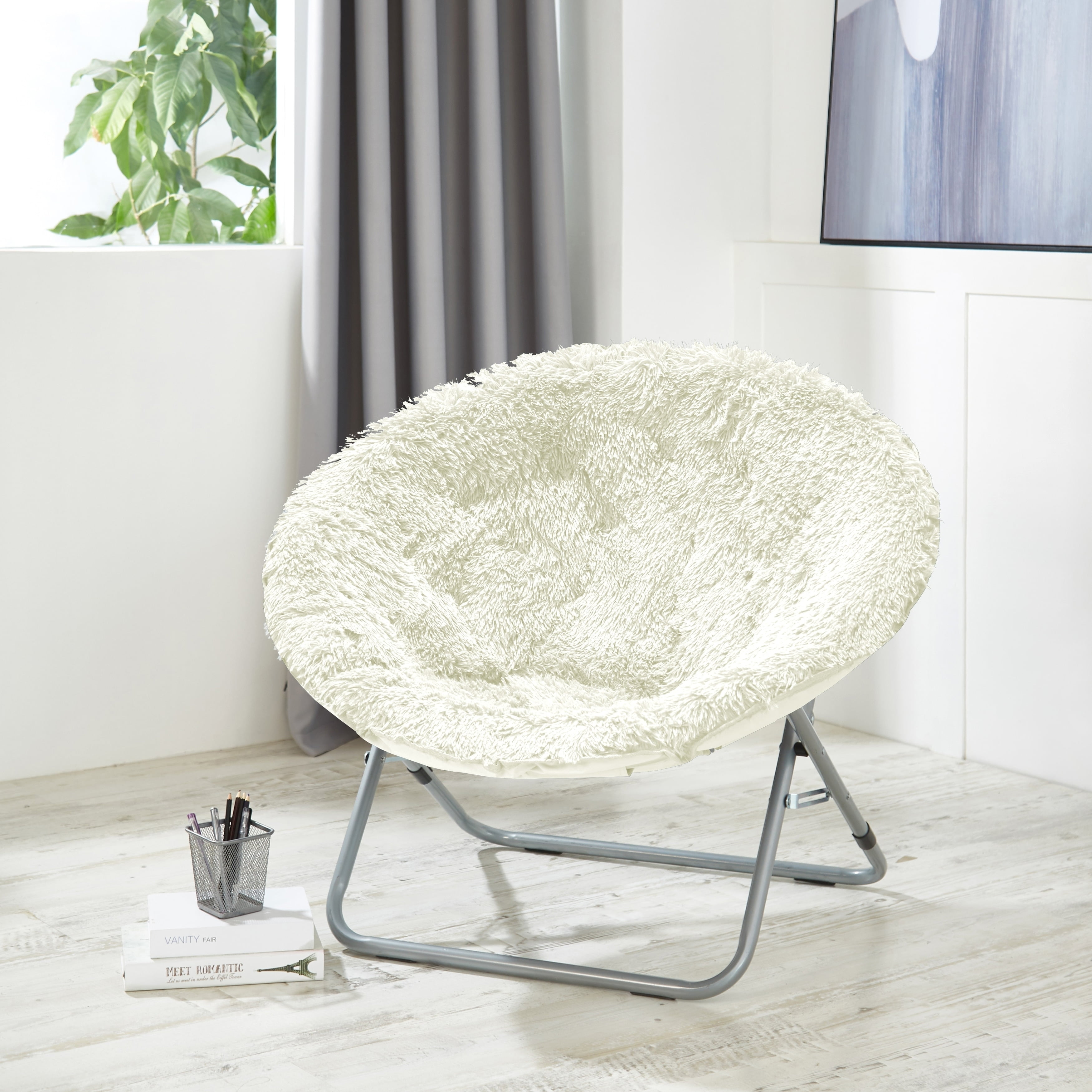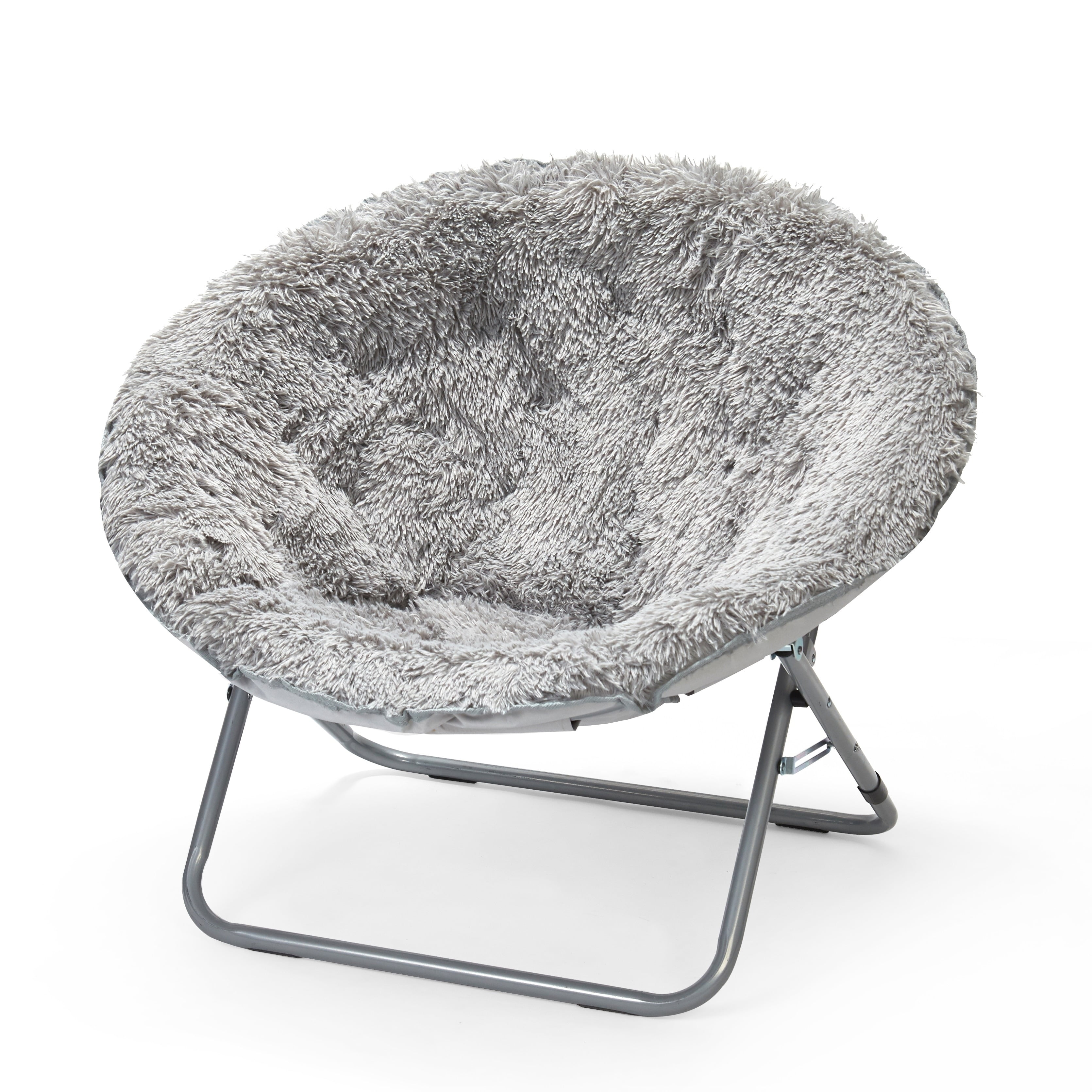 Give your home or office a fresh new look with the addition of this Urban Shop Mongolian faux fur oversized moon chair. This model features a wide design and is made of 100 percent polyester fabric for a comfortable place to study, relax or watch TV after a long day. This indoor moon chair has a durable steel frame that can be folded, making it easy to store or transport. It is suited for use in dorm rooms, apartments, bedrooms, dens, receiving areas, and more. The chair’s fun aesthetic adds a pop of color to any space. This Urban Shop Mongolian faux fur oversized moon chair can easily become anybody’s favorite spot to sit or lounge. It will even make a stylish complement to your entertainment area, playroom, or gaming room. This folding moon chair can accommodate up to 225 lbs.Perfect addition to any teen room!