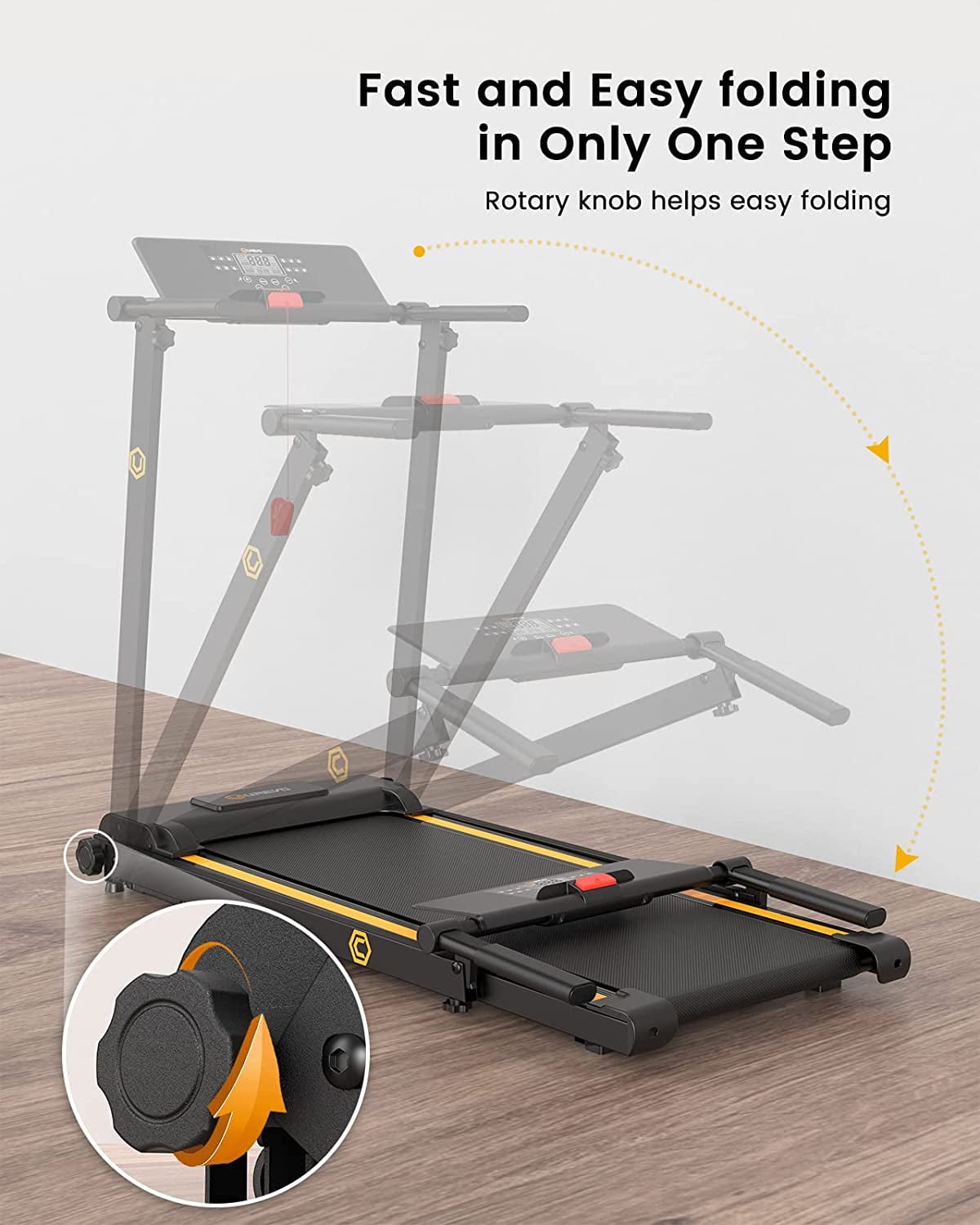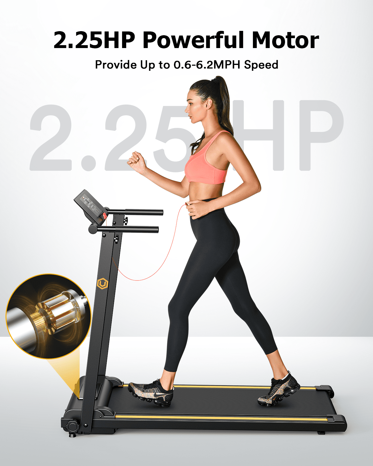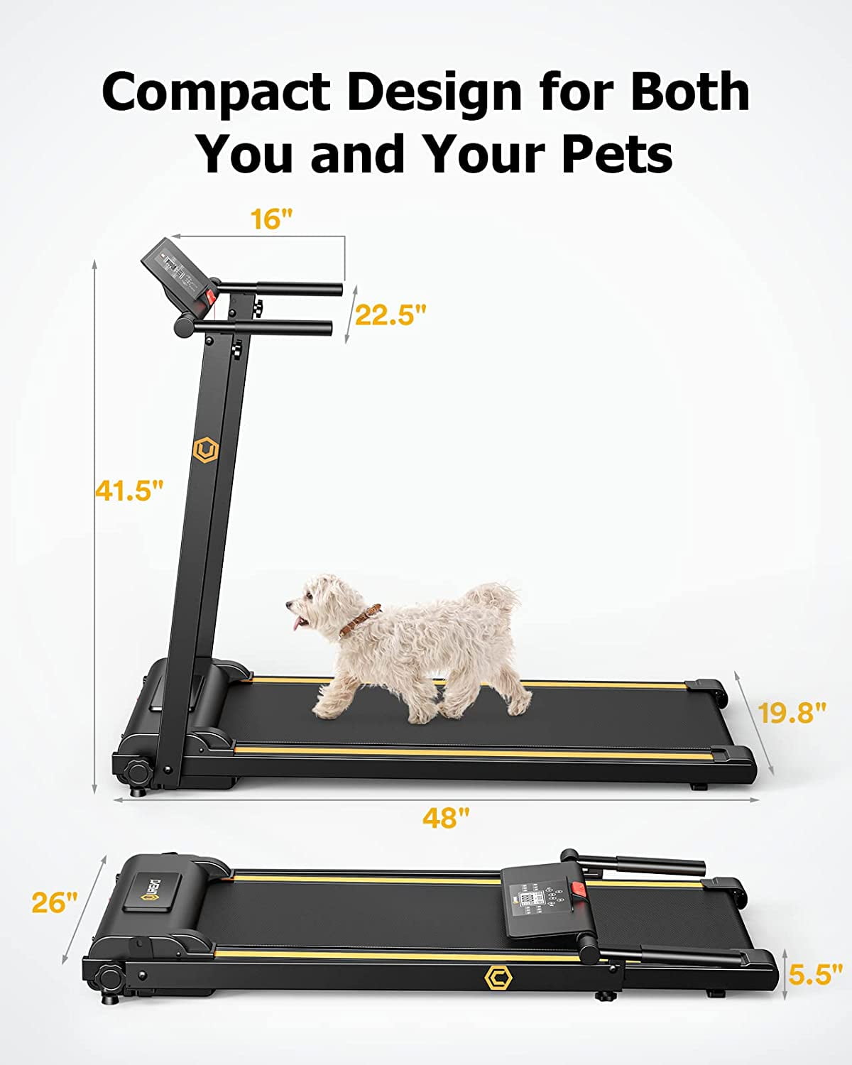 UREVO Folding Treadmill, 2.25HP Portable Mini Treadmills for Home Office, Compact Threadmill with 12 HIIT Modes, LCD Display, 265 lbs Capacity ABOUT BRAND: UREVO is a well-known brand in the fitness industry, with its treadmills at the forefront. UREVO is dedicated to researching and manufacturing high-quality, durable, user-friendly, and space-efficient treadmills, enabling our customers to effortlessly enjoy the pleasure of exercise at home/office. ● 12 Types of HIIT – Globally Acknowledged as the Most Effective Fat Loss Method This folding treadmill brings you the ultimate in fat reduction with our 12 specialized HIIT running settings. HIIT is globally recognized as the fat-blasting powerhouse and the core of this treadmill. These carefully crafted presets provide you with a variety of training plans to choose from, ensuring you can customize your workout to meet your specific needs. Additionally, our adjustable LCD display keeps you in the know about key workout metrics such as speed, time, distance, and calorie burn at any time. ● Convenient, Space-Saving Folding Design The one-step folding feature offers unparalleled convenience. Our foldable treadmill effortlessly shrinks into a compact package measuring 48x26x5.5 inches (L x W x H). This stylish design allows you to effortlessly stow it under your bed, sofa, or against the wall. The latest mini treadmill is now more compact and user-friendly than ever, weighing only 22.5 kg. ● Enhanced Performance for an Authentic Outdoor Experience Our walking treadmill has 2.25 HP motor delivers an authentic outdoor running experience. With a speed range from 0.6 to 6.2 MPH, it ensures stable operation even with a maximum weight of 265 pounds. What’s more, the motor runs quietly, so it won’t disturb those around you. The five-layer anti-slip running belt is not only durable but exceptionally quiet. Thanks to our integrated compression technology, the belt offers a seamless and smooth experience. ● Spacious Running Area for the Whole Family and Pets to Enjoy Our running treadmill features a spacious 16-inch non-slip running belt, ensuring a safer and more comfortable running experience. It’s not just your under desks treadmill; it’s a walking pad for the whole family, including your beloved pets. This means you, your family, and your furry friends can embark on a fitness journey together, easily achieving your fitness goals on the running machine. ● Easy To Assemble Quipped with our best technology, UREVO Portable Folding treadmill is designed to be sturdy, and it has a compact Treadmill, so the flat treadmill can be used in a small space. And the hand rail can be folded up, and is very simple to be stored up, the wheels help you move anywhere with ease, and fit size saves your limited space.