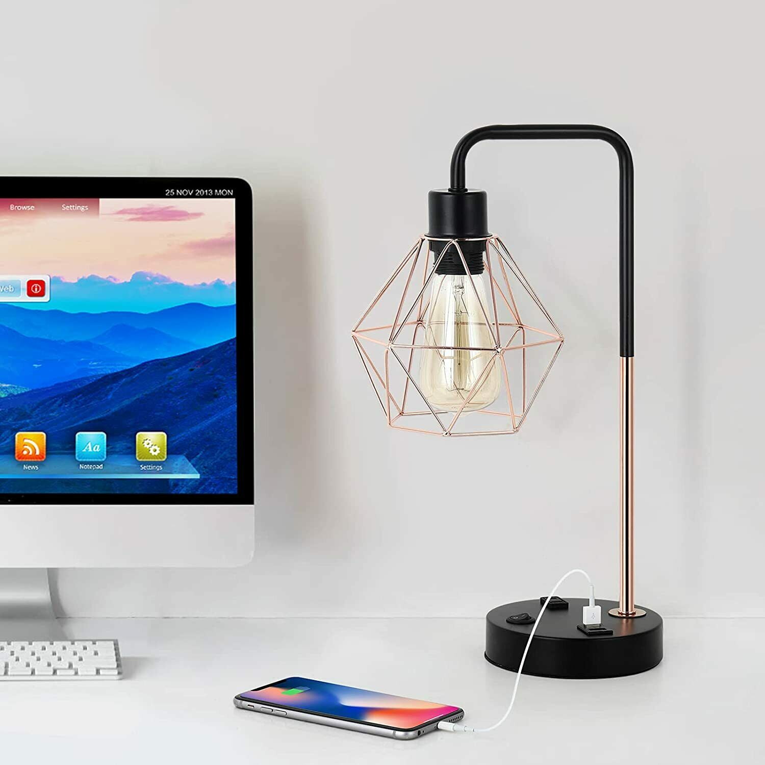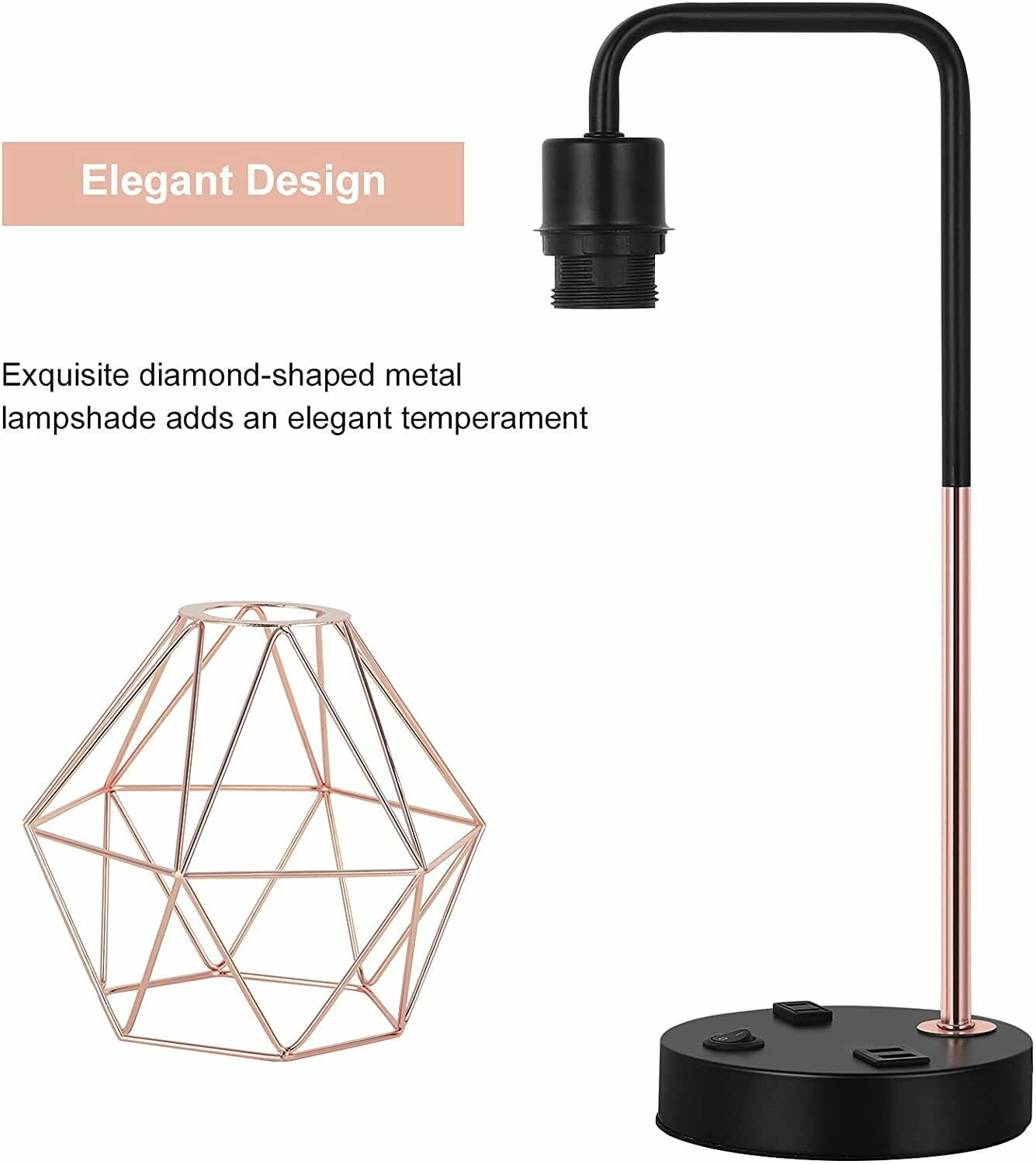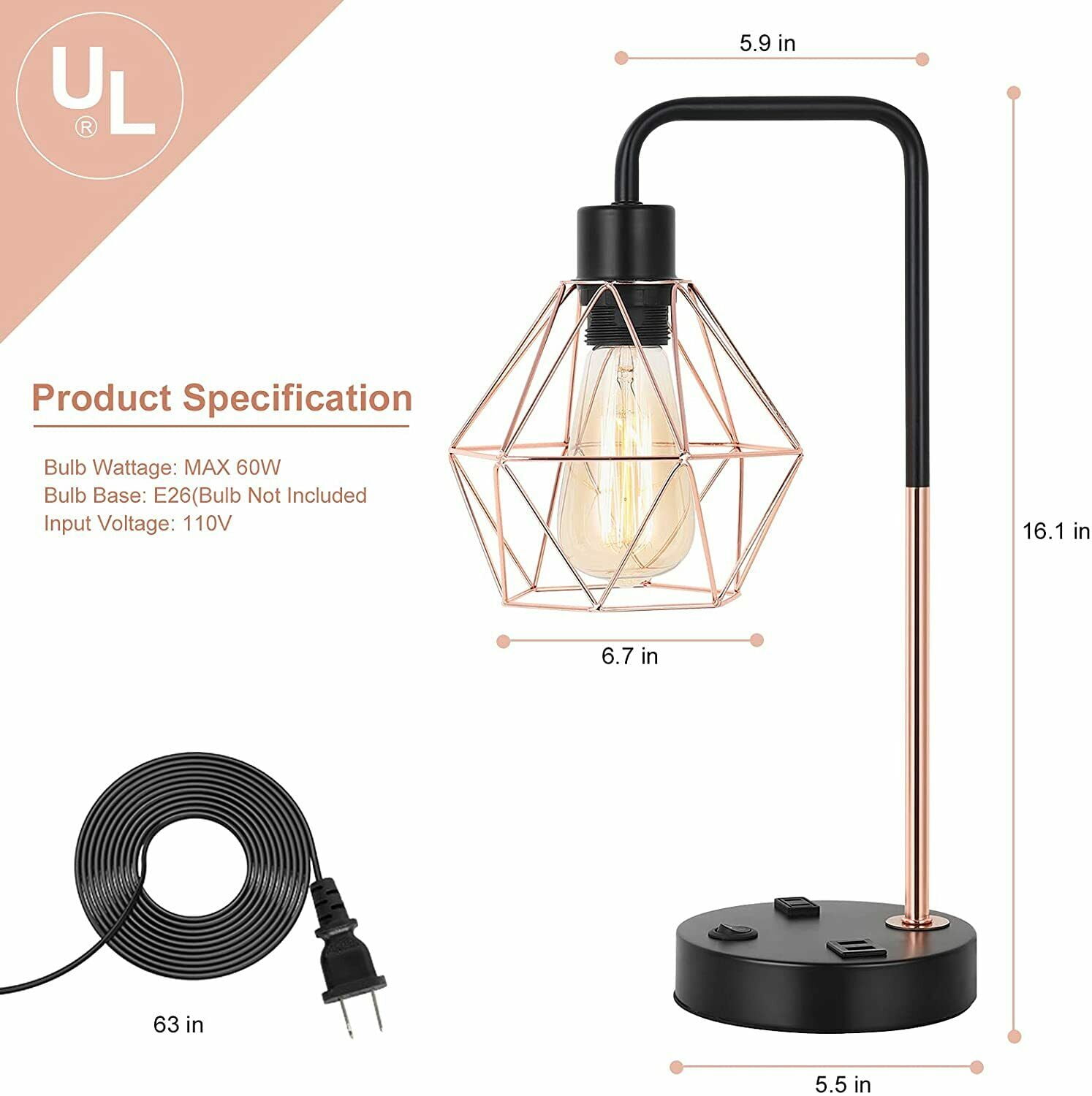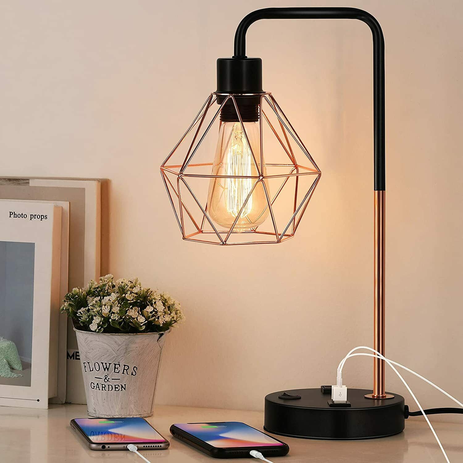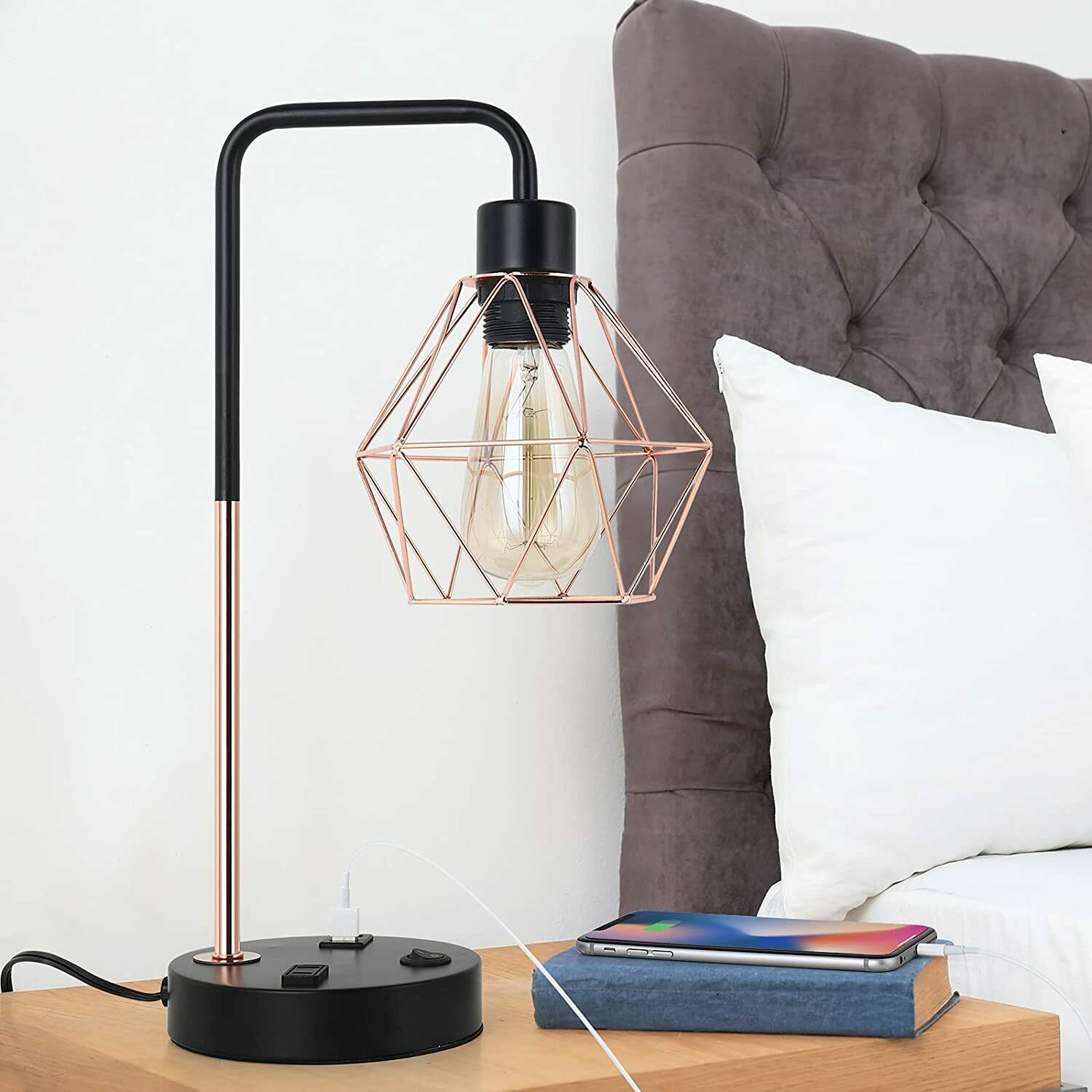 [Industrial and Modern Design Side Table Lamps] The USB nightstand light mix the modern with the classical vintage industrial style, the rose gold hollow out geometric lampshade and black base create a romantic atmosphere. No matter you put it in the bedroom or living room it can elevate the aesthetics. It brings a warm and comfortable feeling to your house, making your house much more stylish! [Ideal for home decor] This is a good choice whatever for your sleeping or reading. With elegant appearance and exquisite workmanship, this distinctive stylish Edison end table lamp meets your practical needs for lighting or household decoration. [Best Choice for a Gift] A perfect present on Thanksgiving Day, Christmas, Birthday, or any other anniversary; it’s an ideal gift for your family and friends! [E26 Standard Bulb Base] The bedside lamps are required an E26 universal standard light bulb, Max 60 watts. (Bulb not included)