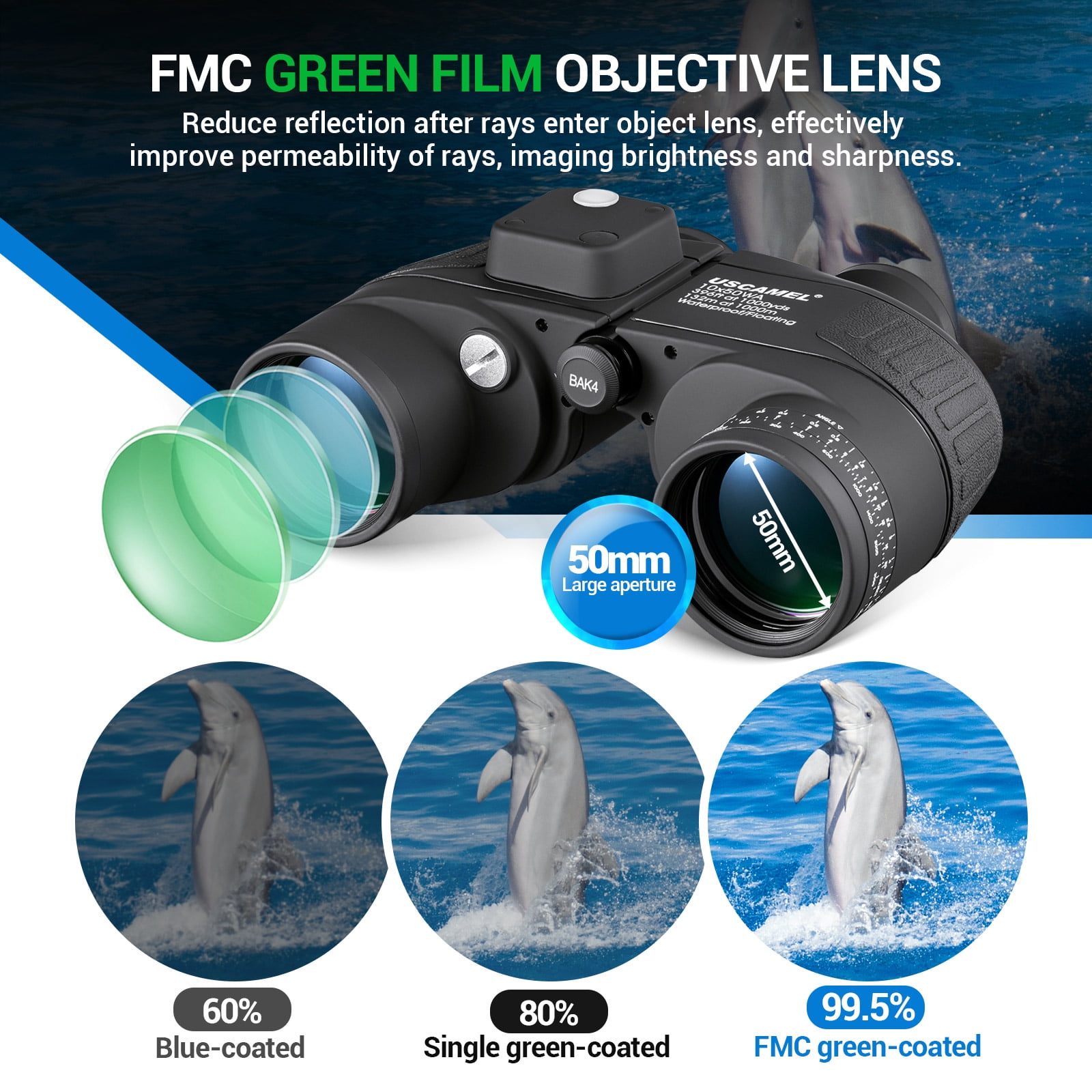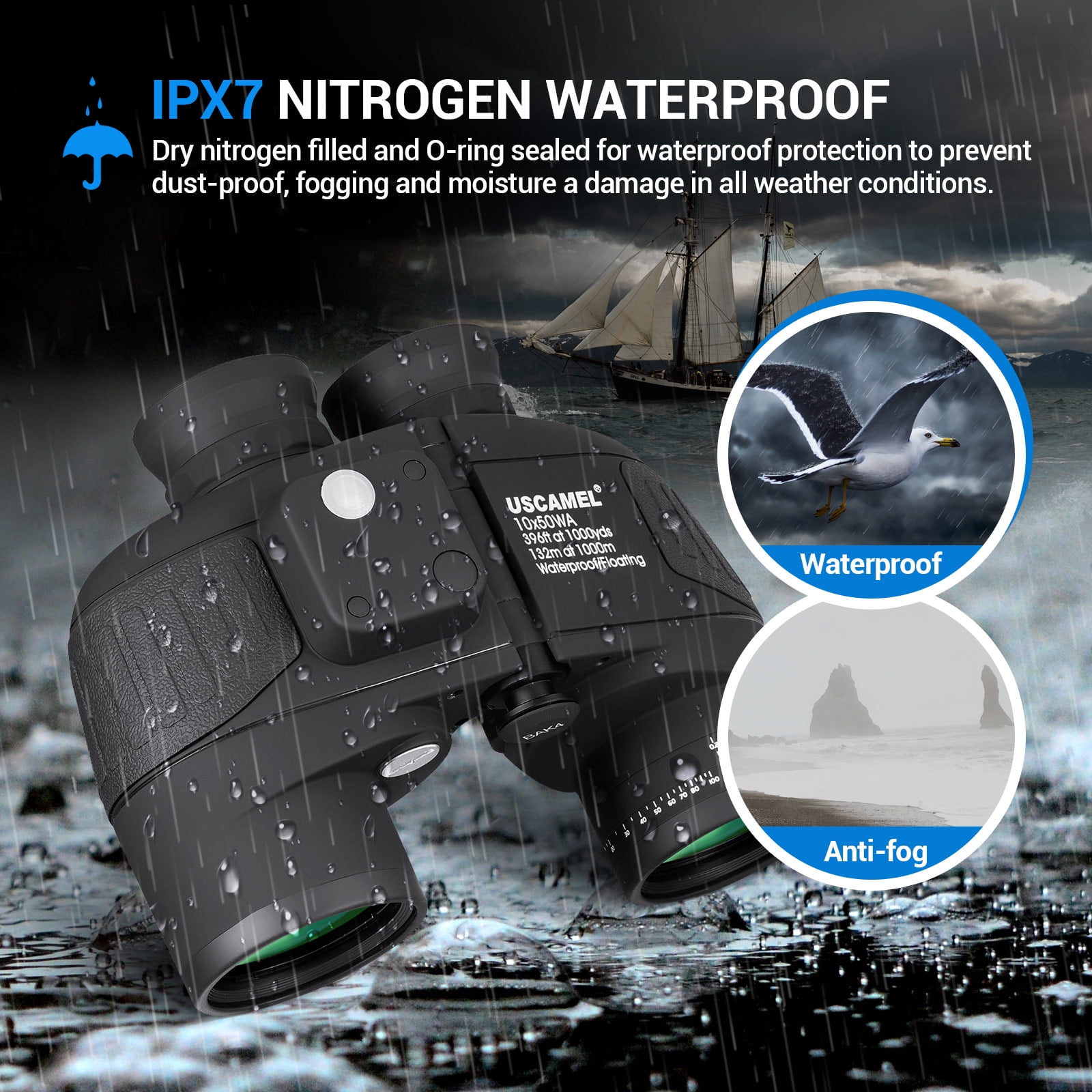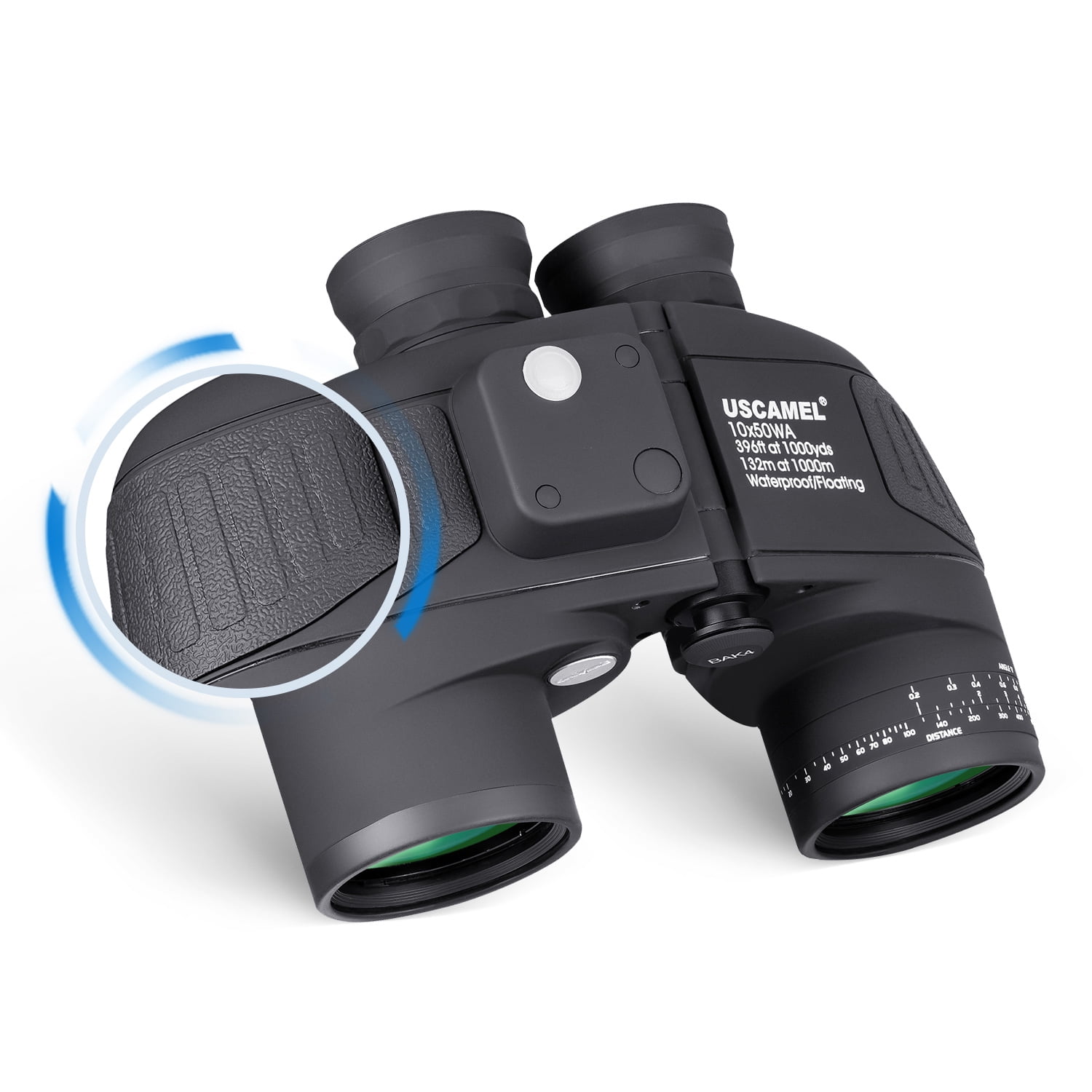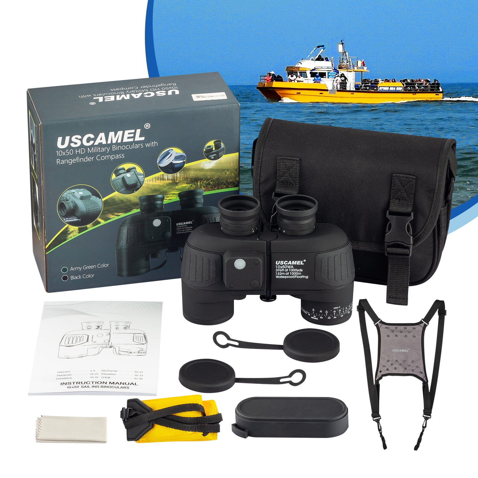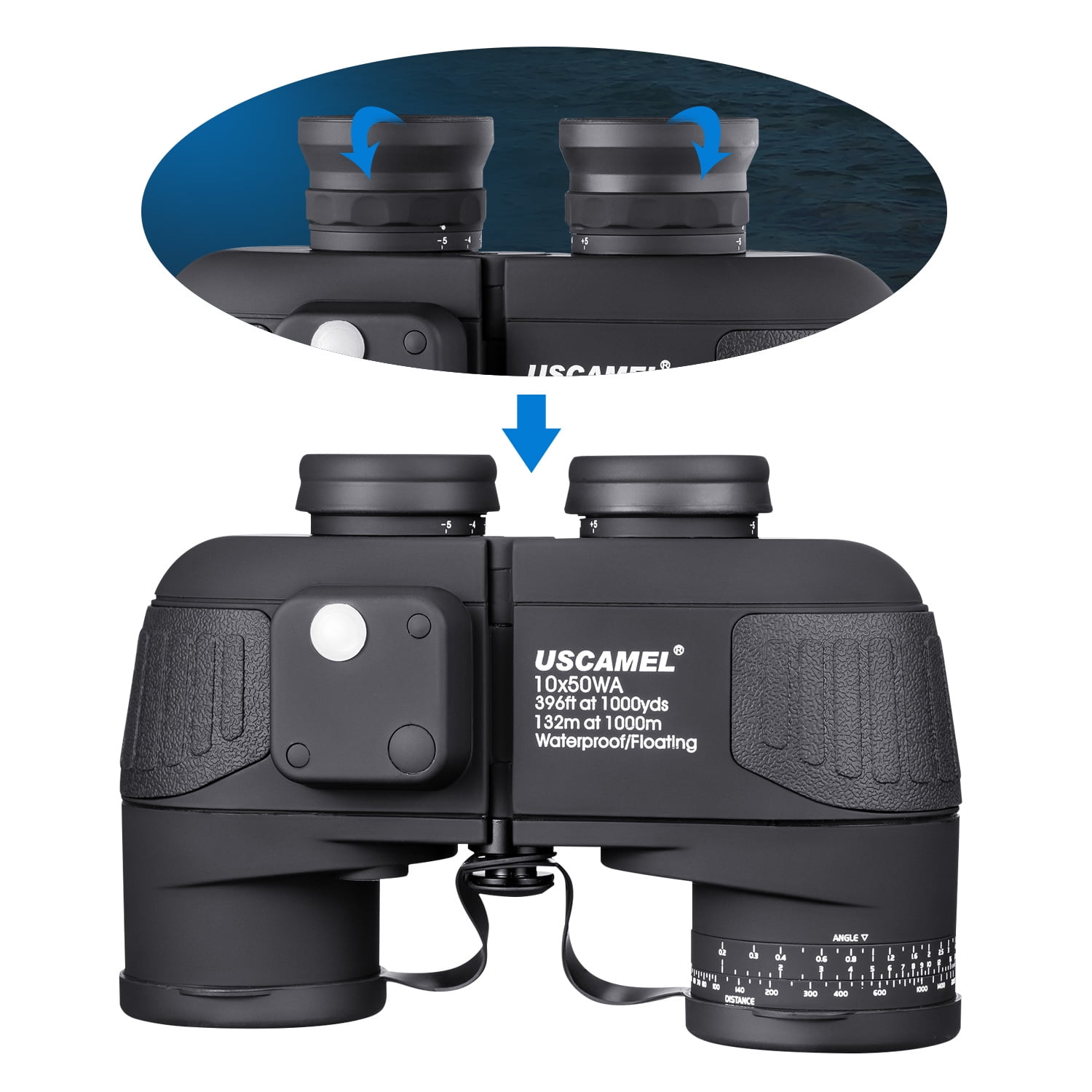 USCAMEL Marine binoculars for adults, with 10x magnification and 50mm objective lens, and field of view is 396 feet at 1000 yards. FMC multi-coated optical lenses, BAK4 prism, which allow you to get large and clear vision due to the high penetration of the lens and its high light collection. The military binoculars with two left and right diopter adjustment rings can adjust the sharp optics to meet the different requirements based on your individual eyesight. The adult binoculars also use an individual focus system to provide the freedom to focus accurately at long distances. The eyecups can be easily folded down for eyeglass wearers. Internal rangefinder scale and built-in compass for measurement and orientation. By turning the calculator dial on the left objective, you can directly calculate the distance or size of objects. Binoculars with rangefinder and compass scale are illuminated by a light on/off switch. Low light vision binoculars can provide better brightness of images as long as there is light or in low-light situations like lamplight, dawn, twilight (not completely dark). These waterproof binoculars for adults are designed for marine and terrestrial observation. IPX7 waterproof, can work normally in heavy rainy day. Durable rubber armored coating digital binoculars is comfortable to hold and rugged enough to stand up to any condition.