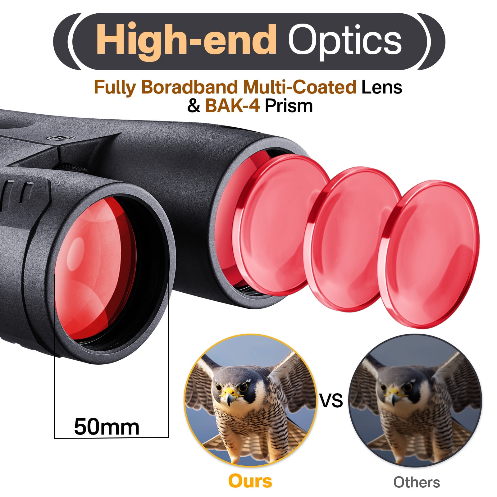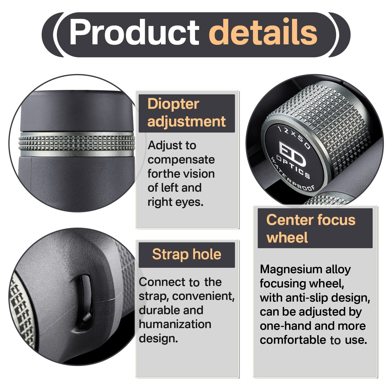 The USCAMEL 12×50 ED Binoculars offer outstanding long-distance viewing with rich detail, making them a high-value choice well under the price of most professional ED binoculars. Each lens features three Extra Low Dispersion (ED) Glass Elements, significantly reducing chromatic aberration for true-to-life color and sharp imagery. Compact yet powerful, these upgraded optics boast a wider field of view, longer Eye Relief, and a closer minimum focus distance.