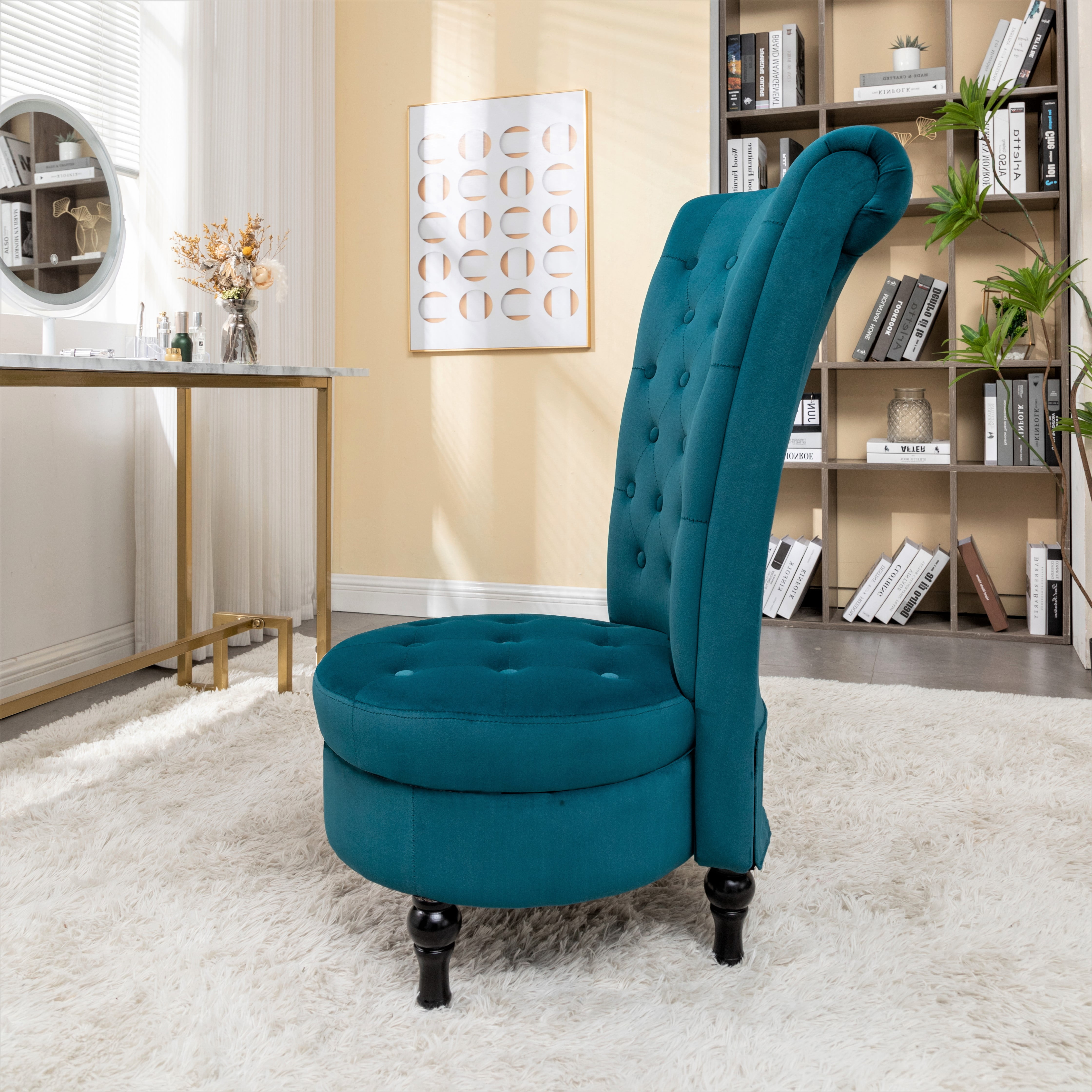 This living room chair adopts a retro style, this royal high-back velveteen tufted chair and the high-back design provides a more unique decoration, stylish sitting, while colorful velveteen upholstery gives this chair a stunning, unique appearance that is sure to stand out in all the right ways, which complements your modern room. It is an excellent choice for any family. This chair with a storage space under the seat has been offered to store your essentials, such as styling electricals, books, and some secret items, very suitable for living room. Dressing room, bedroom, lounge, office. No matter how busy your life is, it will provide you with a comfortable and practical private space to make your life more refined.
