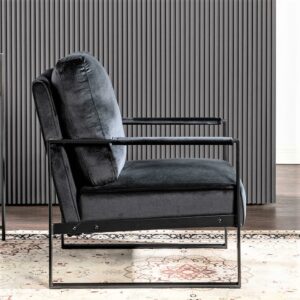 This armchair brings mid-century modern glam to your living room and lends a handy spare spot to sit. It’s built on a metal frame with a brushed black finish and features open square armrests for a minimalist silhouette. The seat and back cushion is wrapped in your choice of fabric and filled with foam for just the right amount of giving as you sit.