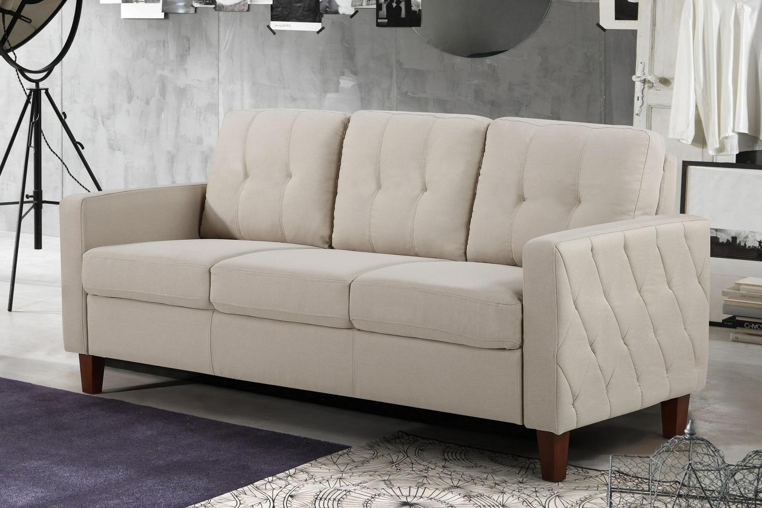 Anchor your transitional seating space in versatile style with this Rossetti Mid Century Tufted Sofa foam-filled linen-upholstered sofa, showcasing piped details and square arms. This loveseat’s tufted details add a refined touch to your decor, while its gray hue lets you lean into both monochromatic and vibrant palettes. Play up this sofa’s versatility by adding it to a contemporary seating space alongside a mid-century sofa and complementing arm chairs for mod-inspired seating space.