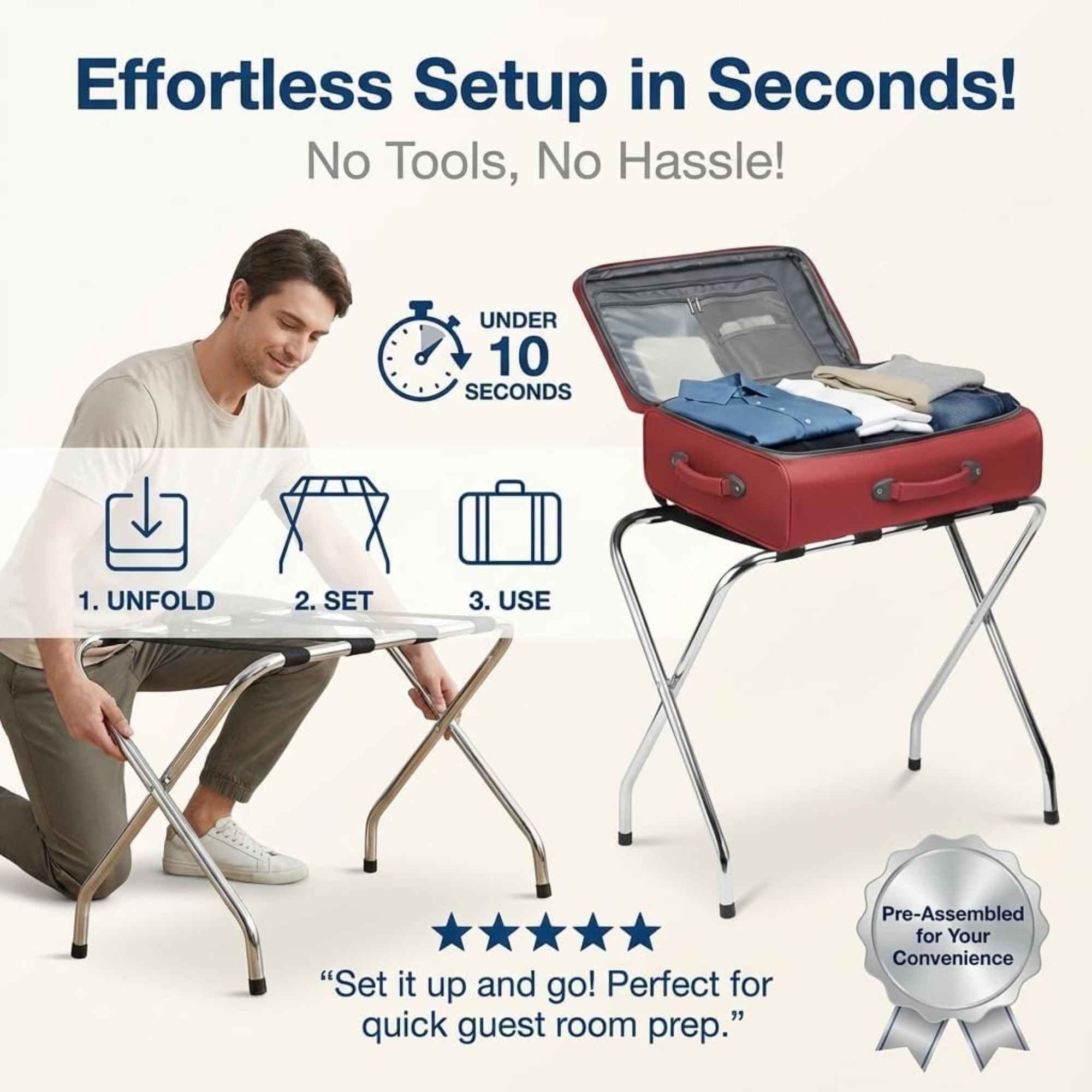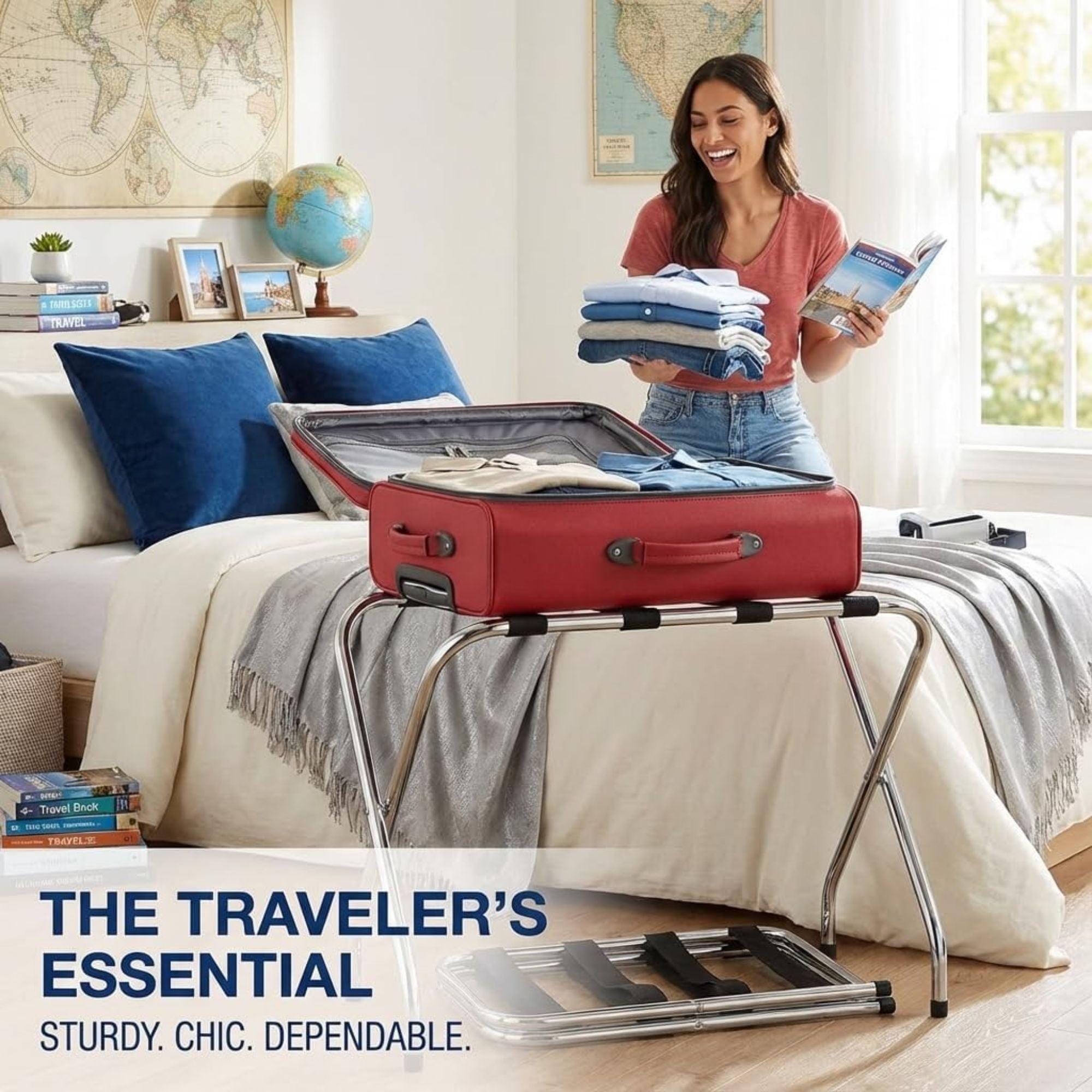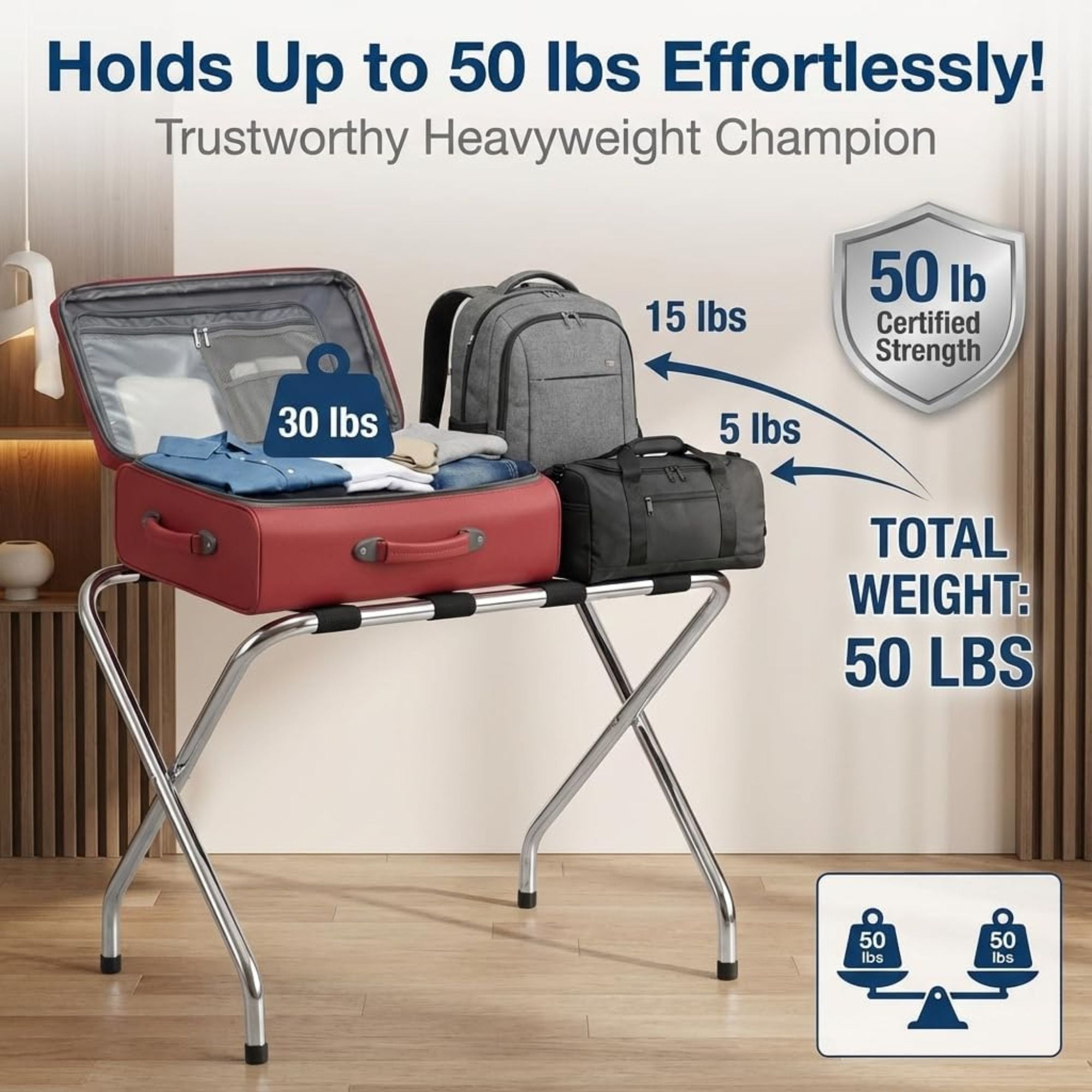 Introducing the USTECH 2-Tier High Back Chrome Folding Luggage Rack! It offers a convenient spot for guests to store their luggage, shoes, bags, and more. With an extra shelf for added storage without disturbing items on top, it ensures valuables stay off the floor. The high back design provides stability against the wall, while its durable steel construction and sleek chrome finish add a touch of modern elegance to any space. Featuring rubber feet for floor protection and four sturdy nylon straps for added support, this rack is both secure and stable. Plus, it requires no assembly and folds flat for effortless storage when not in use.