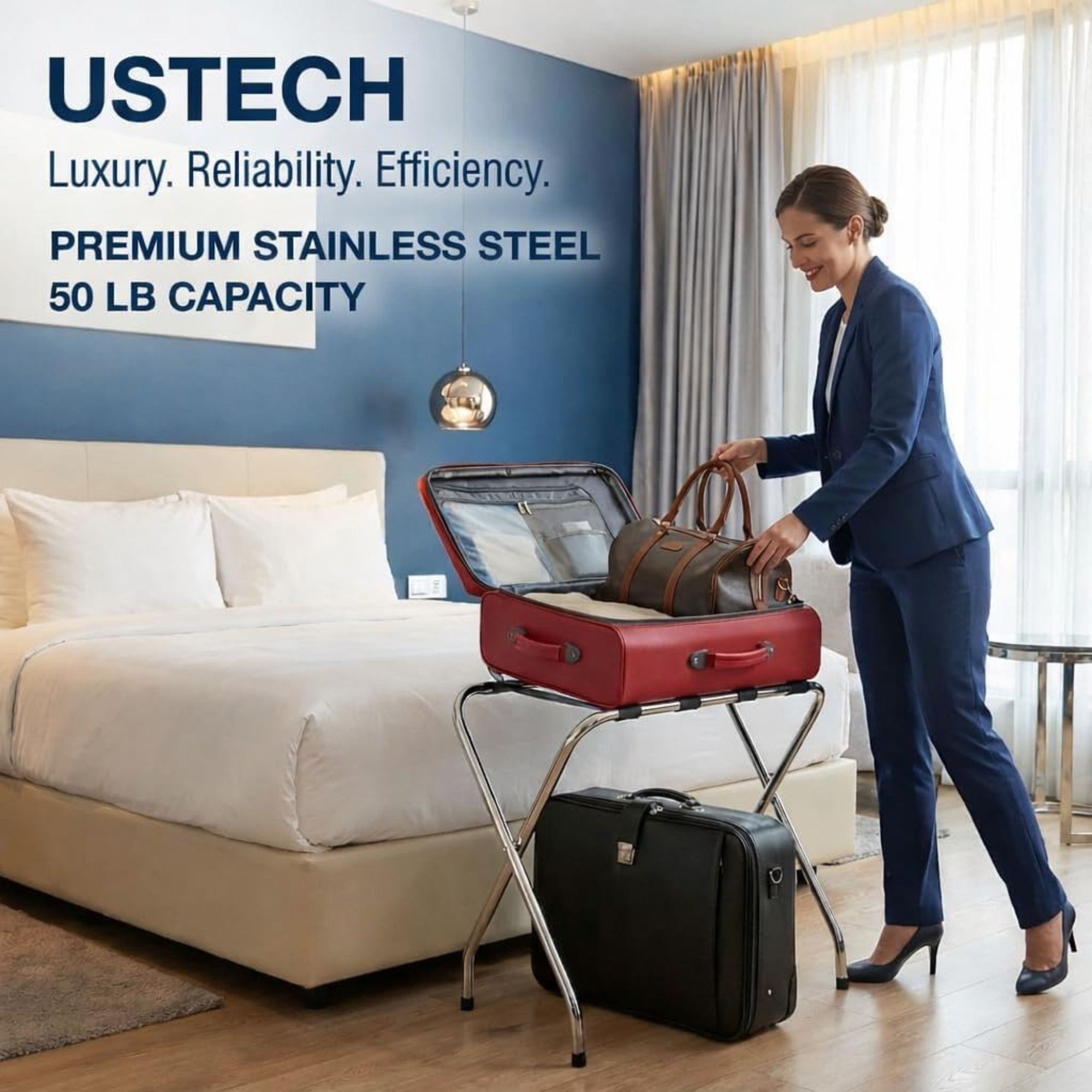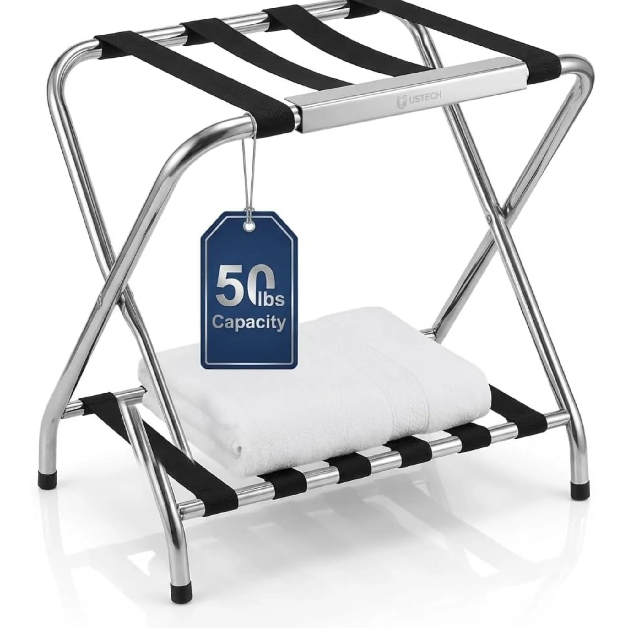 The patent pending USTECH 2-Tier High Back Chrome Folding Luggage Rack is the perfect place for your guests to store their luggage, suitcases, shoes, purses, briefcases, bags and more. The additional shelf on the bottom of the rack allows your guest to keep their valuables off the floor without having to worry about removing luggage from the top shelf. Built with a high back to rest against the wall and have the added security that your luggage and rack will not fall over. Made of durable high-quality steel with an attractive chrome finish which will provide an upscale modern look that matches any décor. High quality rubber feet keep it secure and prevents damage to your floors. Four nylon straps that can handle heavy luggage and add additional support and stability. No assembly required and folds flat for easy and efficient storage.