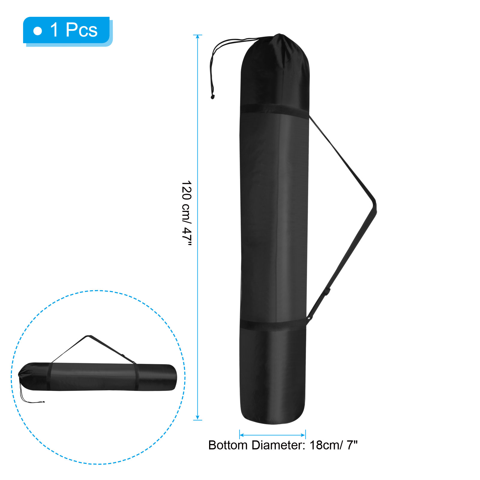 The folding chair storage bag is suitable for small folding chairs, yoga mats, blankets, umbrellas, tripods, monopods, flash light stands, etc., which are smaller than its size after being folded. It is widely used in camping, traveling, hiking, outdoors, etc.. Advantage The chair carrying bag is made of durable and waterproof 210D Oxford cloth, which will protect your folding chair from dust and scratches when not in use. The round bottom design can realize three-dimensional storage. Drawstring closure allows for quick and smooth storage of the foldable chair. Adjustable shoulder strap design, more convenient to carry. Instruction Put the appropriate size folding chair into the camping bag then zip it up. NOTE: Please check the size of the folding chair before ordering to ensure that the diameter can be put into the storage bag.