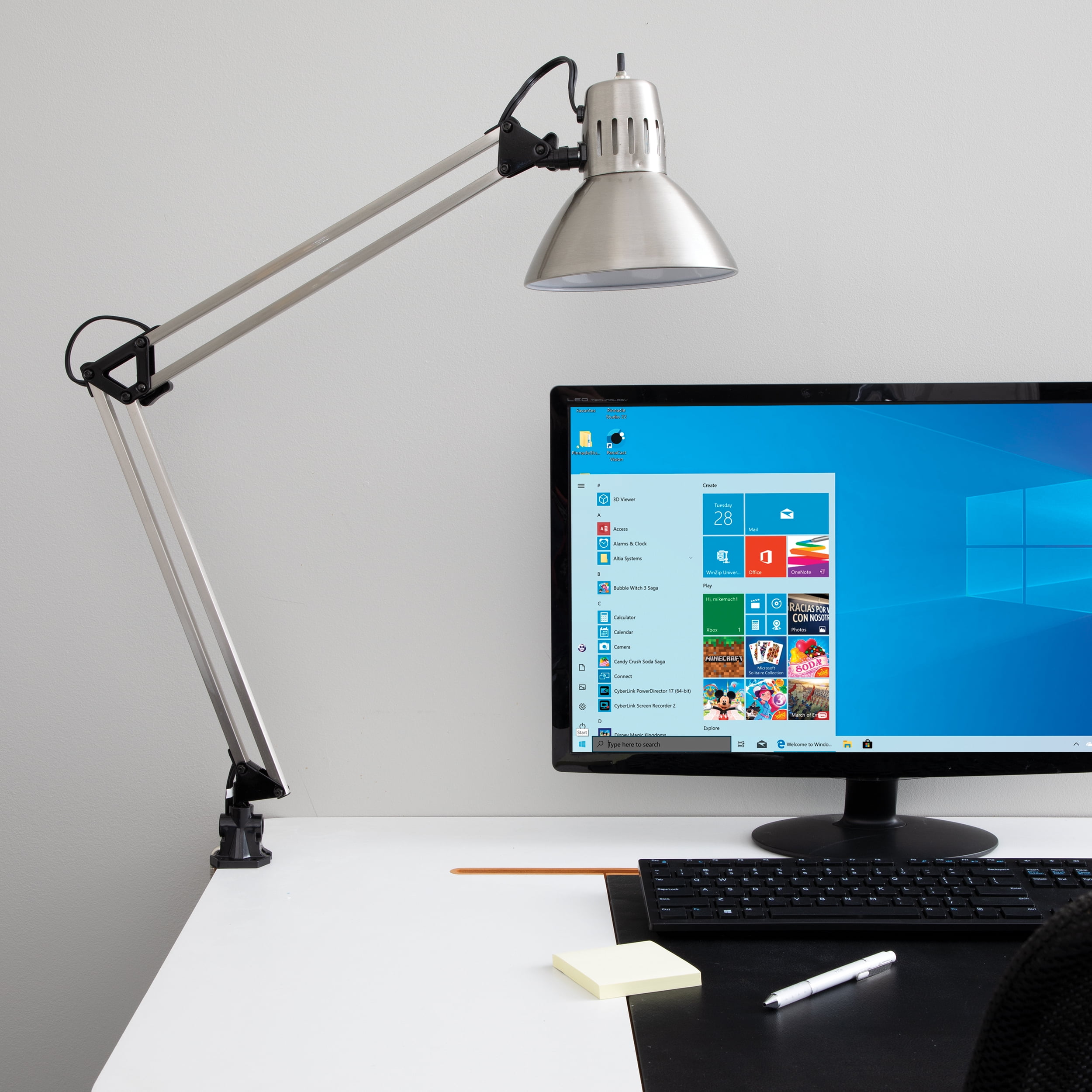 Functional task lighting made possible with adjustable arm and shade 3-point adjustable architect style arms Clamp-on mounting attaches to most work surfaces