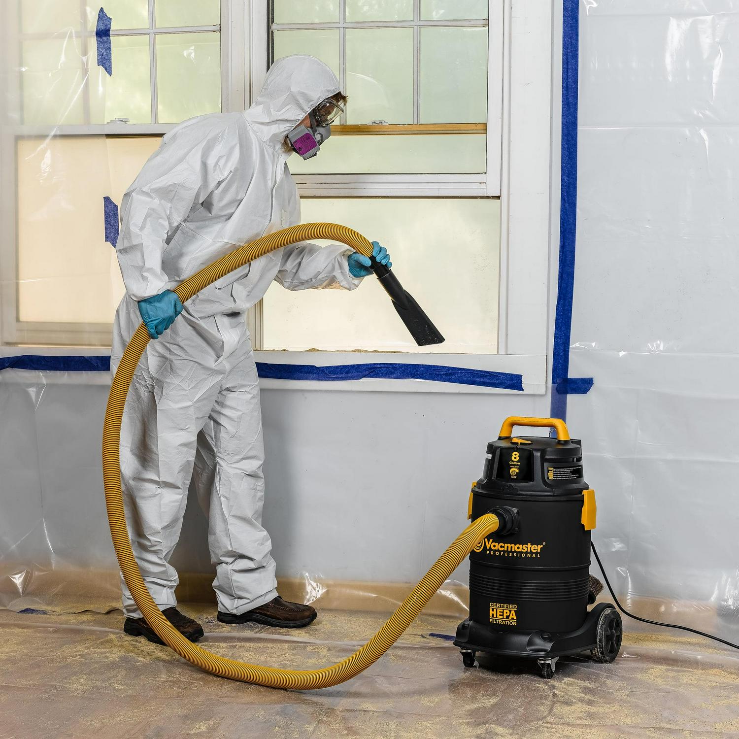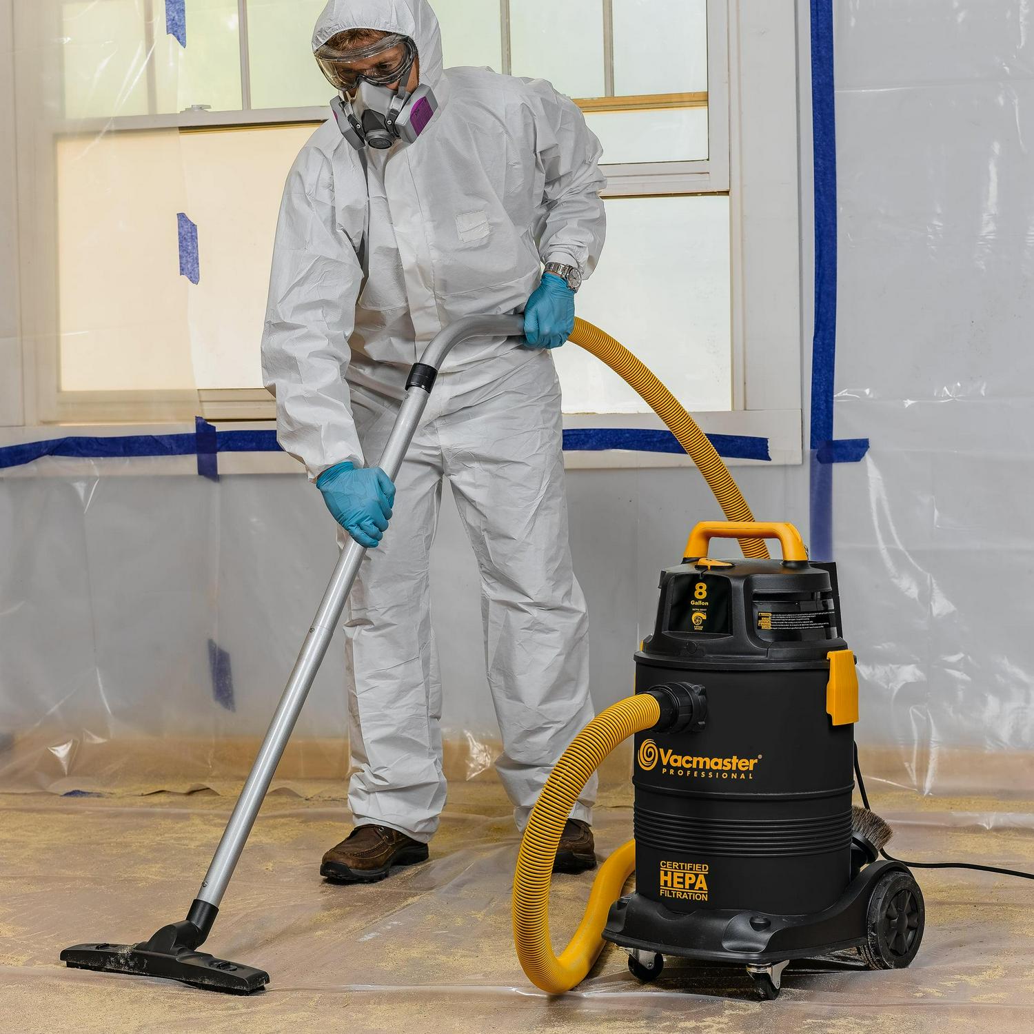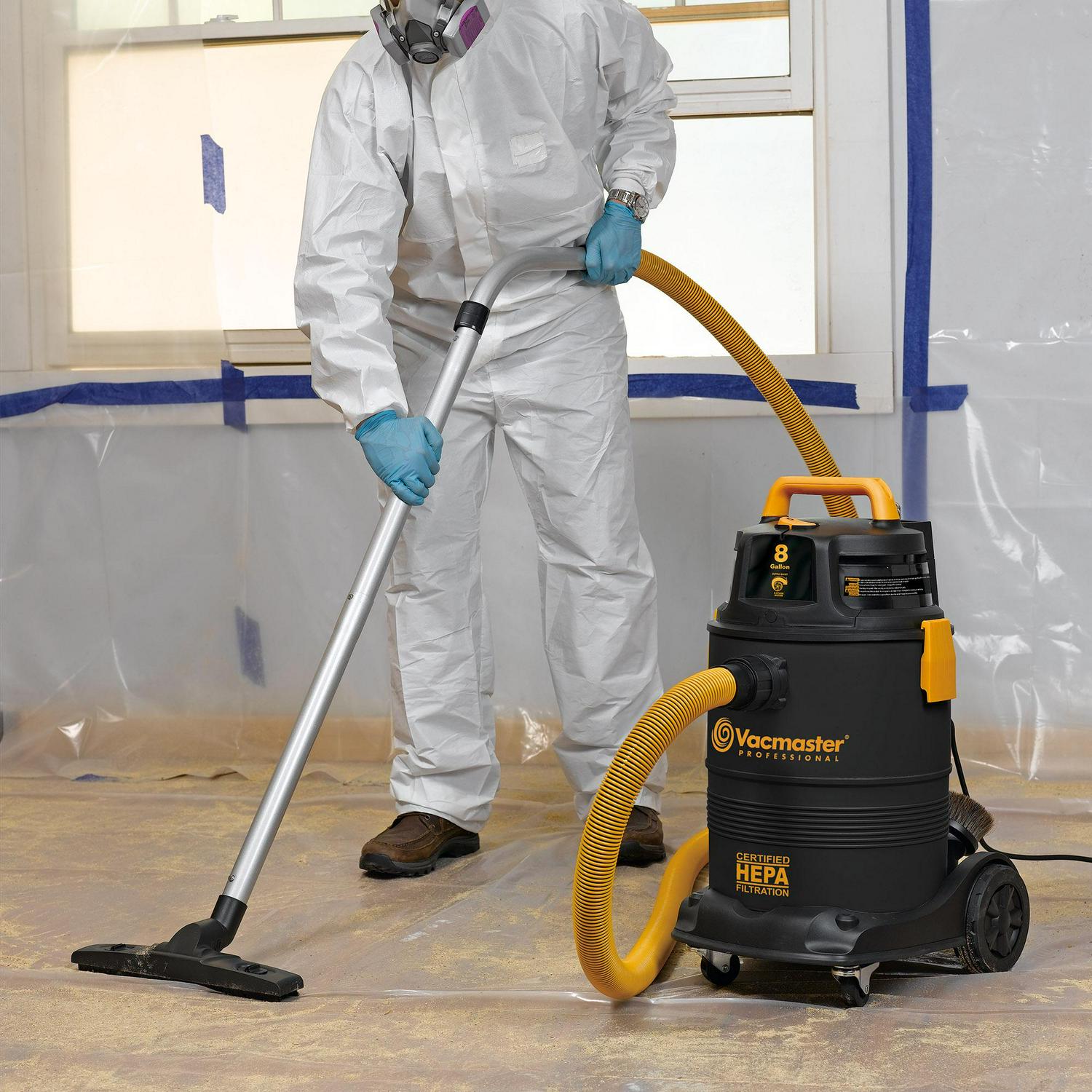 The Vacmaster Professional 8-gallon wet/dry vac is a certified HEPA system and is equipped with a powerful, quiet 2-stage industrial motor. It features 4 levels of filtration for HEPA compliance. To qualify as a HEPA system, a unit must capture and retain 99.97% of all contaminants down to 0.3 micron in particle size. In independent tests, the Vacmaster Professional VK811PH showed an efficiency of 99.996% in the 0.3 micron particle size range, meeting and exceeding the HEPA efficiency requirements set by the United States Environmental Protection Agency (EPA) and required under the Renovation, Repair, and Painting (RRP) Program. This commercial vac also comes with a lighted plug, crushproof industrial hose, and foam wet filter for picking-up liquid materials.