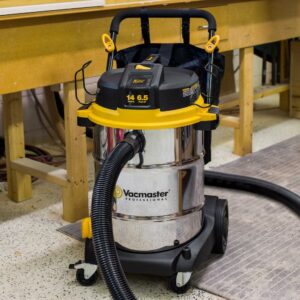 This VACMASTER PROFESSIONAL beast series 14 Gallon 6.5 peak HP stainless steel tank Wet/Dry Vac is a powerful high-performance Vac designed to tackle the toughest cleanup projects the job site, around the shop, or in the garage. On-board hose, accessory, and power cord storage eliminates unneeded hassle and minimizes total storage space. A unique flat power head design allows you to conveniently store tools on top of the vacuum so they are easily accessible when needed. The cart design allows for ultimate control and balance when dealing with larger messes, and also provides storage for tools or accessories in a pouch that attaches to the foam-cushioned handle. The generous 20 Ft. power cord allows you to reach farther and freely maneuver the unit without unplugging the unit. Quickly control the power with the large dust sealed on/off switch. A locking front wheel keeps the Wet/Dry Vac in place and improves mobility on most surfaces. The beast series Wet/Dry vacuum also includes 10 accessories for nearly any task: 7 ft. x 2-1/2 in. kink resistant premium hose, utility nozzle, floor nozzle, professional floor brush, crevice tool, (2) extension wands, fine dust cartridge filter, foam wet filter, accessory bag, and air noise diffuser.