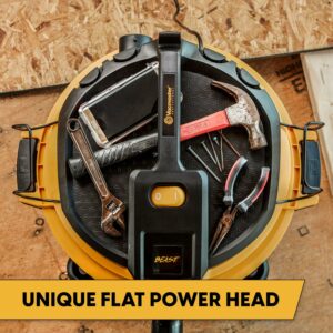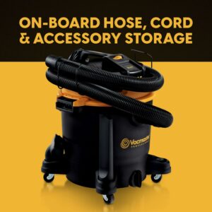 Get ready to tackle the toughest messes with the full-sized Vacmaster Professional Beast Series 12-gallon* wet/dry vacuum! With a powerful 5.5 Peak HP motor, this vac can handle anything from sawdust to drywall. The unique flat power head design conveniently stores your tools for easy access, while the on-board hose, power cord, and storage keep all your attachments in one place. Equipped with 10 accessories and a 27-foot cleaning reach, this vac has everything you need for quick and efficient cleaning. With wide-set casters and a balanced top handle, transporting it from one place to the next is a breeze. Turning this vac into a blower to remove debris from your yard or workspace could not be easier – all it takes is a simple conversion. And when you’re done, effortlessly empty your tank of liquid with the extra-large drain port, and for dry messes, use the high-efficiency dust bag to make cleaning easy. Don’t miss out on this must-have tool for your home, shop, or jobsite!