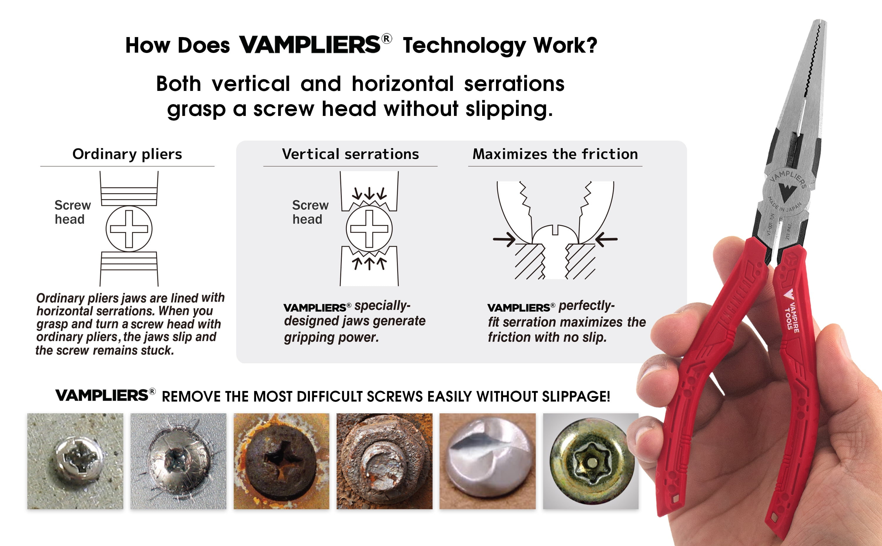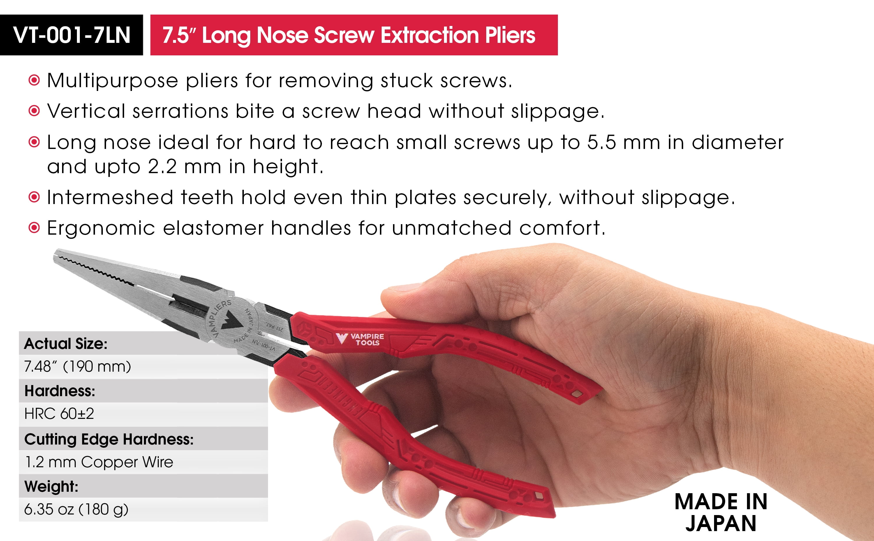 Best Seller High Quality Long Nose Pliers / Screw Extractor Pliers, Made In Japan, VamPLIERS VT-001-7LN By Vampire Tools Inc. High-quality specialty pliers to extract stripped or stuck screws or rounded nuts or bolts. Remove stripped, rusted, corroded, stuck, one-side, Torx screws, nuts, and bolts. Designed with patented VAMPLIERS® Technology. Long Nose pliers is ideal for hard-to-reach screws up to 5.5mm in diameter and 2.2mm in height. Wire cutters hardened to HRC60±2 (Rockwell standard) to handle tough screws. Serrations in between grips are used as wire-pullers. Top teeth are intermeshed for a non-slip grip. Ergonomic elastomer handles for unmatched comfort. T-shaped forged handles prevent the grip covers from twisting or slipping off. VT-001-7LN Long Nose Pliers are perfect gift for any occasion, gift tool, gifts for her, gifts for him, gifts for men, gifts for mom, gifts for dad. RoHS compliant for use in various industries. These long nose pliers are made in Japan from high quality carbon steel Automatic 4-Year Warranty | 5-Year Warranty with Vampire Tools Product Registration
