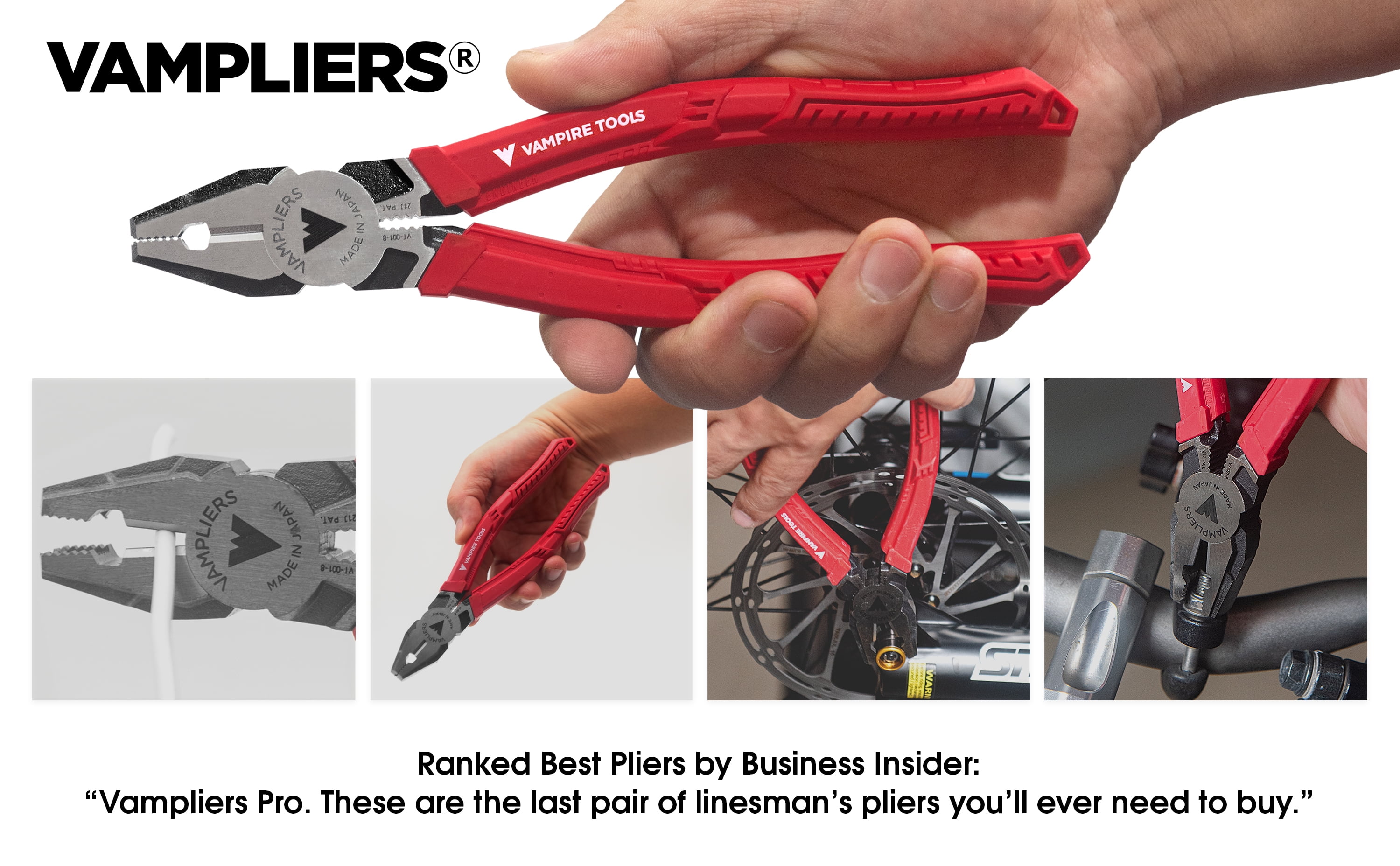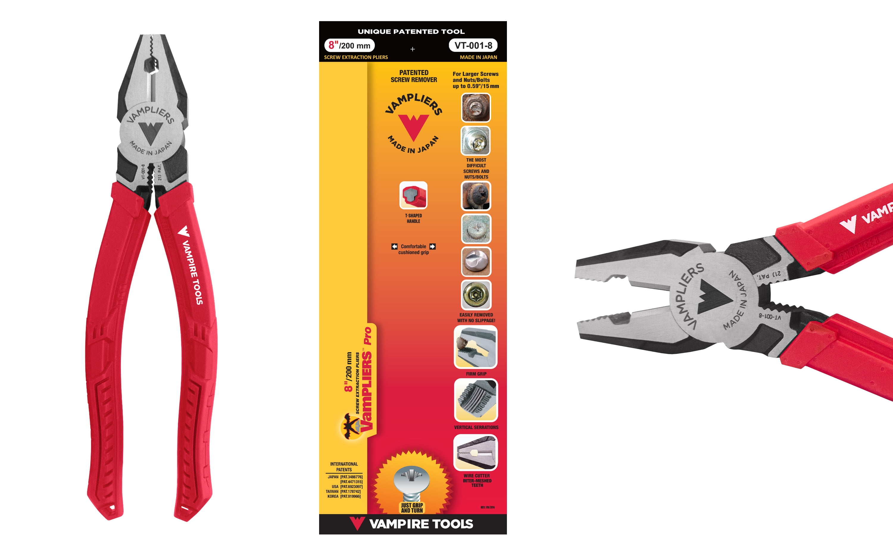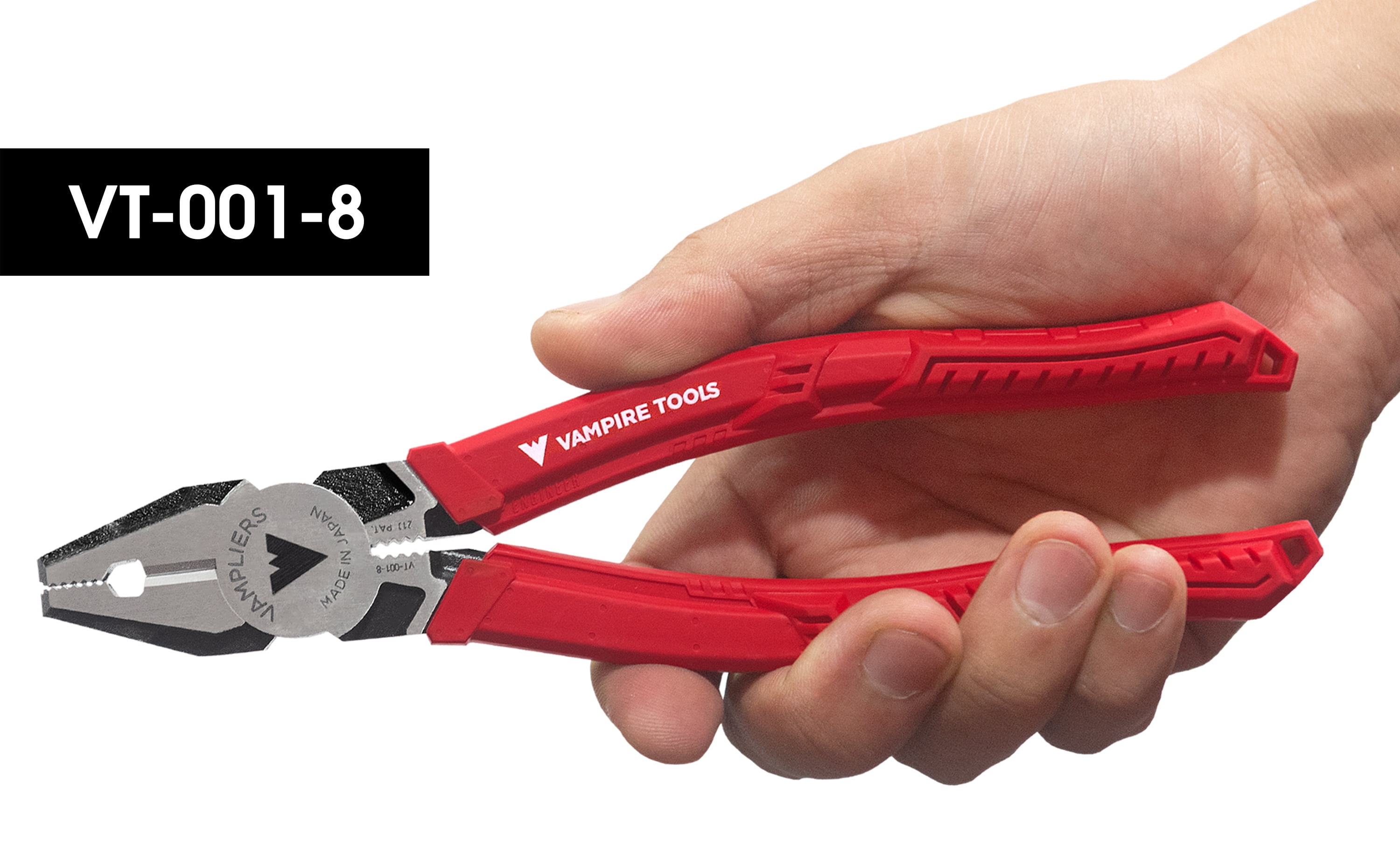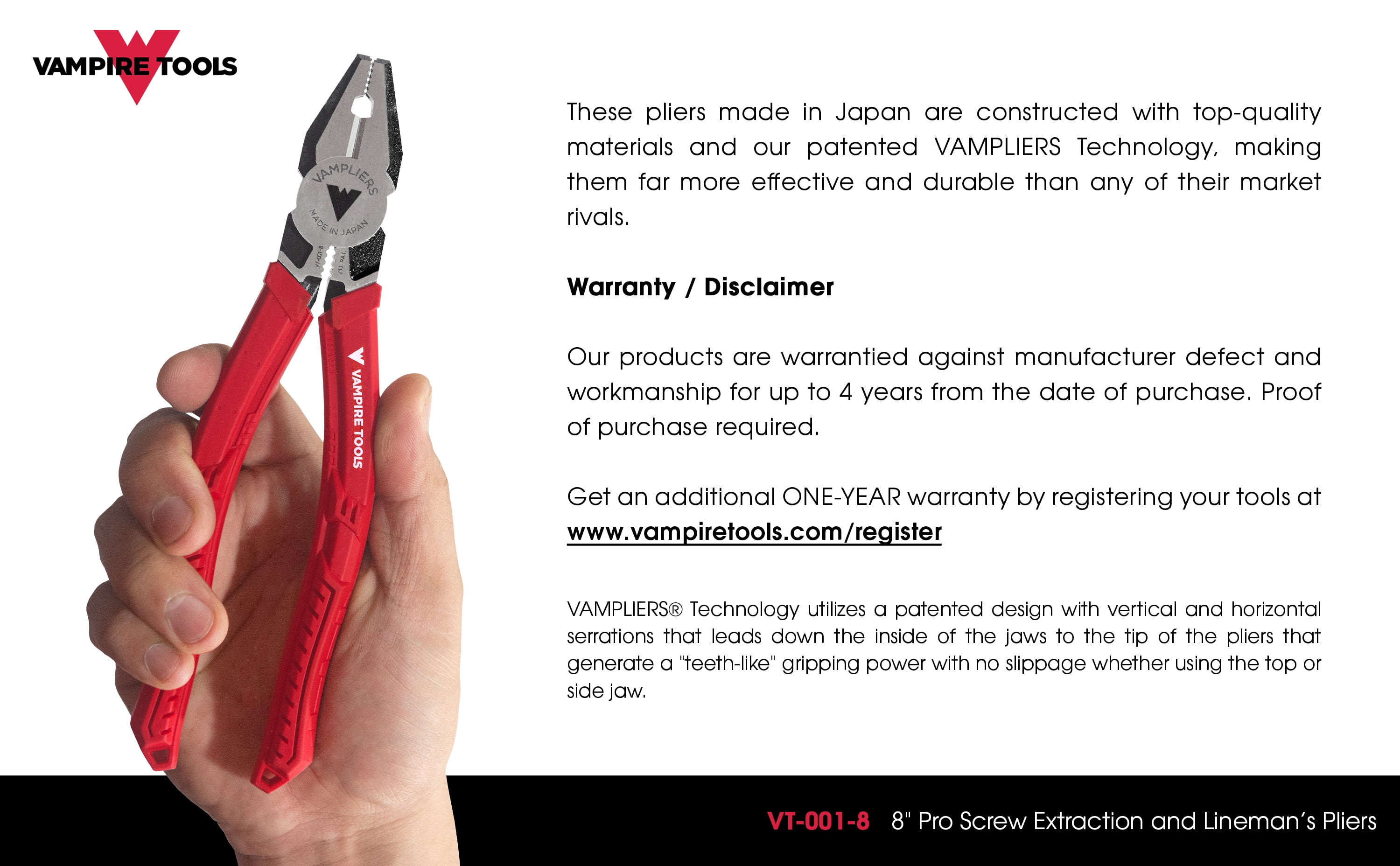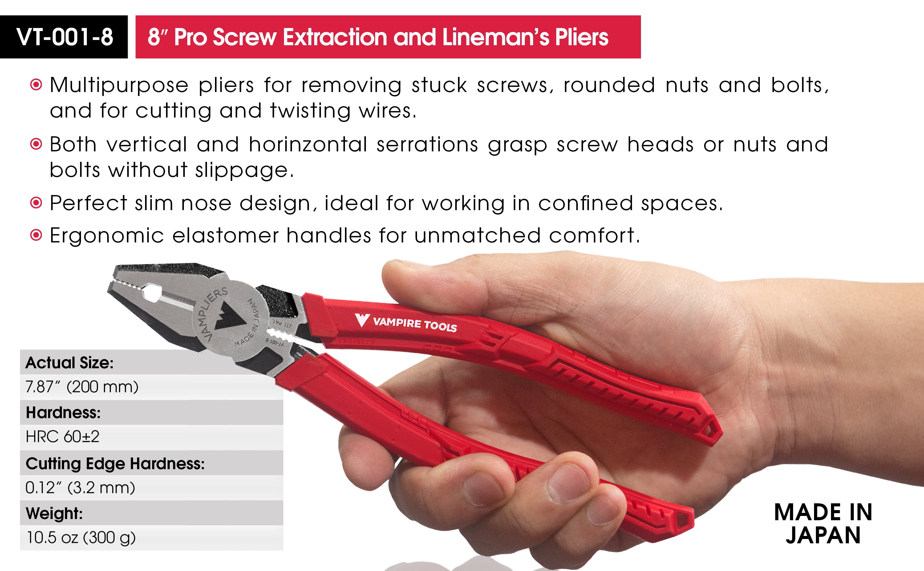 Best Seller High-Quality Linesman Pliers, Stripped Screw Extractor Made In Japan, With Wire Cutter, World’s Best Pliers, VAMPLIERS VT-001-8. 8″ PRO Linesman Pliers, Screw Extractor Pliers to Remove Rusted/Damage/Specialty Screws nuts and Bolts. Professional grade linesman pliers for screw extraction. Remove stripped, rusted, corroded, stuck, one-side, Torx screws, nuts and bolts Designed with VamPLIERS® Technology Target screws can be extracted using top jaw or side jaw Perfect slim nose for access confined spaces Ergonomic elastomer handles for unmatched comfort Wire cutters hardened to HRC60±2 (Rockwell standard) RoHS Compliant for use in various industries Made in Japan from high quality carbon steel Best Linesman Pliers Automatic 4-Year Warranty | 5-Year Warranty with Vampire Tools Product Registration