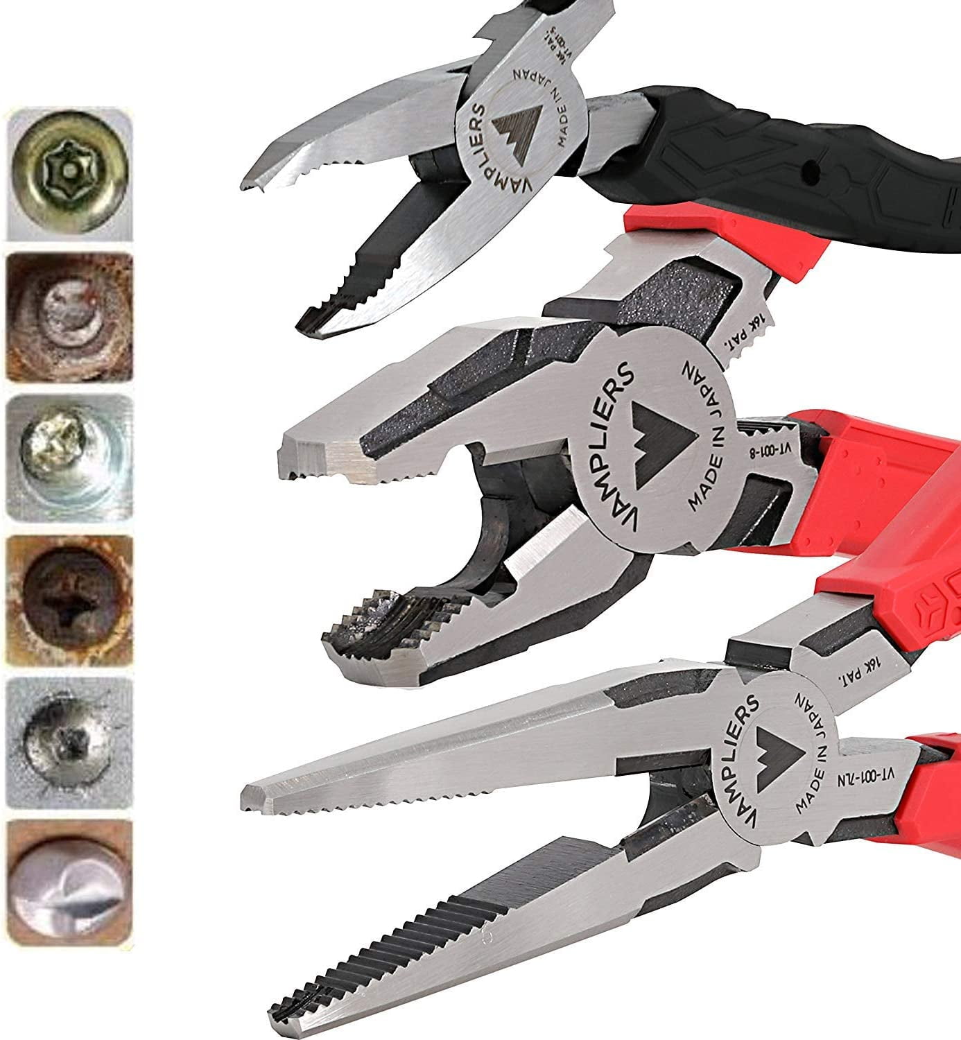 Best Seller High Quality Pliers Set Made In Japan VAMPLIERS VT-001-S5BP by Vampire Tools, Pliers for Rusted / Damage / Security Screw Extractor Pliers Best Gift Ideal for Corporate/Friends and Family Gifts, 5-piece Set with Pouch. Includes 1x: 5” Mini (ESD Safe), 6.25”, 7” Slip Joint, 7.5” Long Nose, 8” PRO Lineman’s Screw Extractor Pliers VamPLIERS + Vampire Tools Handy Tool Organizer Pouch. This combination tool is perfect for the job that you never thought that you would need. Whether it’s a fast and easy way to take apart parts or cut screws, this set has it all. This pliers set works great on stripped screws, jammed nuts and bolts, and corroded fasteners. Designed with VamPLIERS Technology. Horizontal & vertical teeth in the concave jaw grip and extract stripped screws, nuts, or bolts using the top jaw or the side jaw. The ideal gift for that person who loves screws! Perfect holiday gift ideas!
