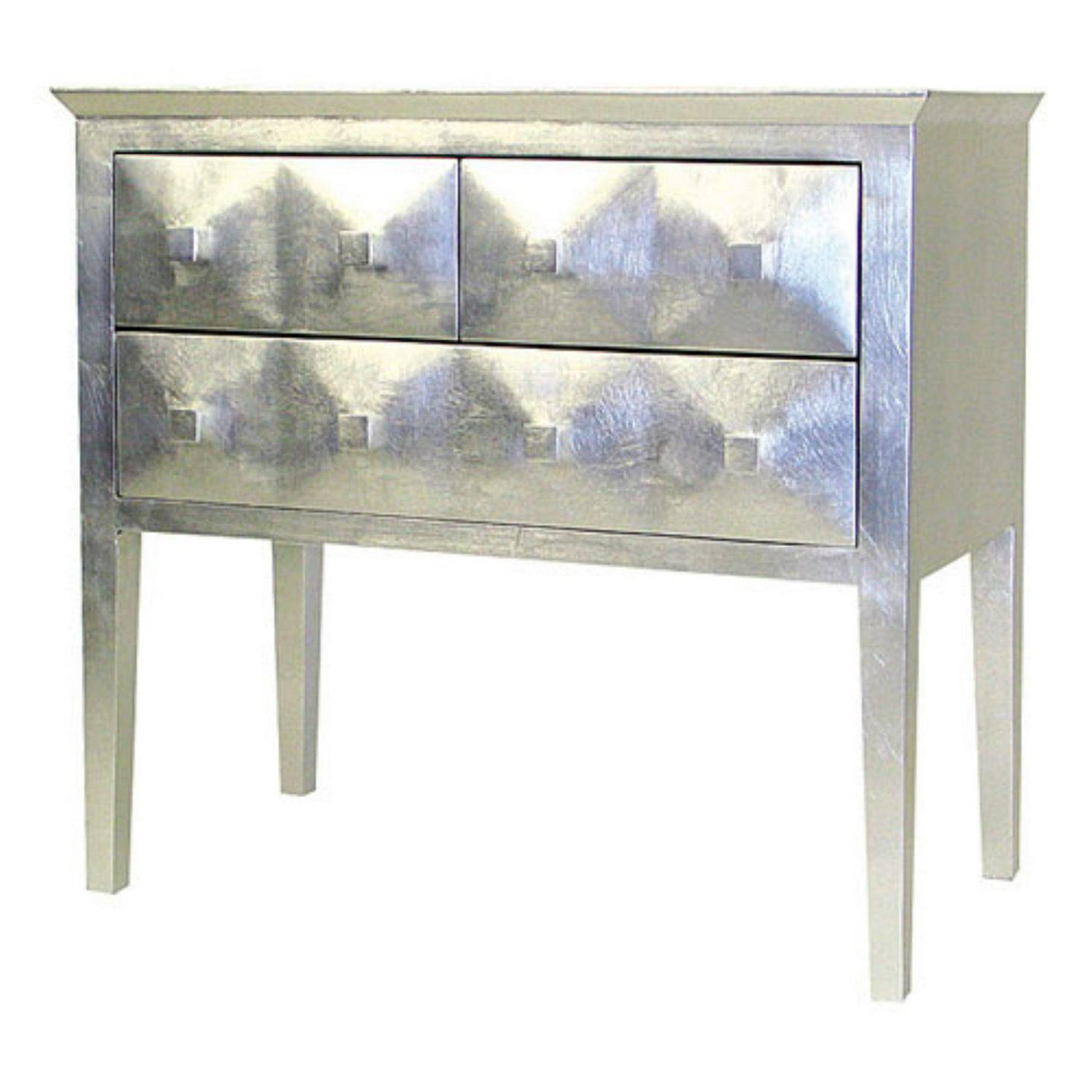 The Vanderbilt 3-Drawer Chest comes in an eye-catching silver finish and is the perfect accent to any home decor. This functional, small dresser or console is constructed with a wood veneer and features three-drawer construction with one larger bottom drawer and two top drawers, all with metal pull knobs. The attractive, contemporary design of the chest is sleek, modern and stylish, and the square cut legs complete the attractive look. Dimensions: 31W x 16D x 29H inches.