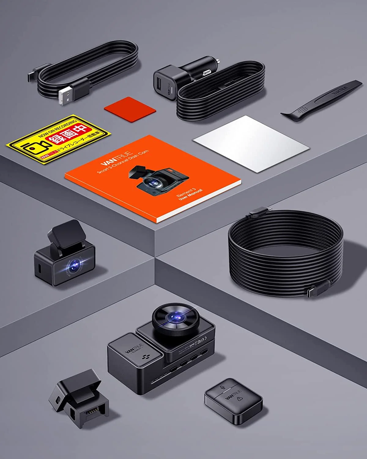 [3 Channel Dashcam with Wide Viewing Angle] With the 3 cameras to record front, cabin/interior and rear at 1944P+1080P+1080P with a nearly 360° wide viewing angle(Front 160°, cabin 165°, rear 160°), the Vantrue E3 is able to capture more details of car front, cabin and rear, which to provide full coverage of the car. Giving you peace of mind. [Voice Control and Wireless Remote Control] Vantrue E3 supports voice control to free your hands while driving. Tell the dashcam “Take Photo”, “Turn on Screen” “Turn on WiFi”, and “Turn off Audio” and it will do you so. Which is really handy. Vantrue also packs a wireless remote controller (so call hotkey), there are 2 buttons, one is for locking the current recording/take photo, and the other is for turn on/off audio. [5G WiFi and Free APP] Vantrue E3 dashcam is built in 5GHz WiFi, with the “VANTRUE” APP, you can live preview, playback, edit videos and share videos on social medias. The 5G WiFi is 4X faster than 2.4Ghz WiFi. [Sony Starvis Night Vision and Low light night vision while parking] With Sony Starvis sensor, the dashcam is able to enhance the night vision to record more details in low light conditions. Low light night vision is work on parking mode. When the dashcam enters the parking mode, it will brighten up the image quality in dark situations. [Parking Mode: 15s Buffered Motion detection, Low Bitrate Recording, Time Lapse Recording, Collision Detection] To work on the parking mode, we need to buy a hardwire kit cable or an OBD cable to offer constant power when the car is off. There are 4 parking solutions: 15s Buffered Motion detection, Low Bitrate Recording, Time Lapse Recording(also called low frame rate recording), Collision Detection. [Built-in GPS and Adjustable G-sensor] There is a GPS module in the magnetic mount, so you don’t need to buy an extra GPS mount for the Vantrue E3. With the Vantrue GPS player, you can view the speed, location, and routine. The G-sensor will auto-lock the current recording if this is an accident, thus, to protect the important file is overwintered.