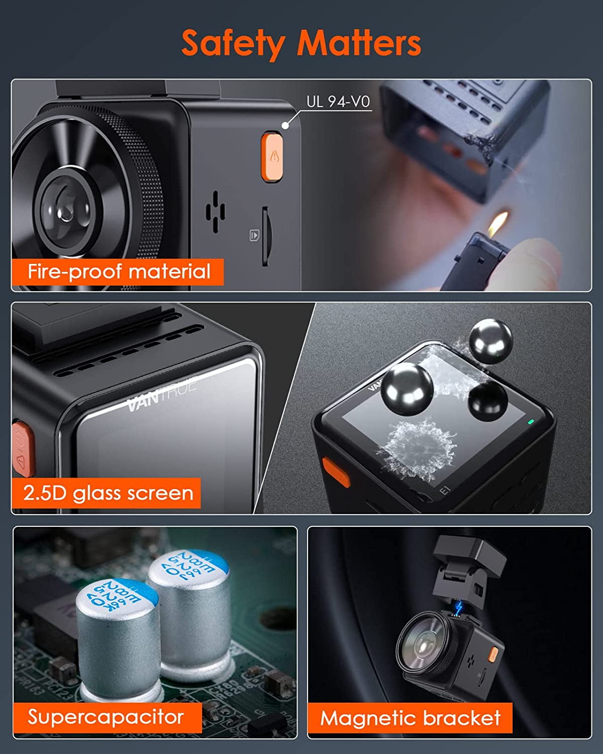 Mini But Powerful: The Vantrue E1 pocked-sized dash camera is equipped with a top-quality Sony CMOS sensor that’s capable of capturing crisp 2592 x 1944P footage. It utilizes HDR (High Dynamic Range) Technology, F1.8 wide aperture lens and super night vision to increase exposure automatically in dark situations, read license plates clearly or spot obscure details that could act as important evidence in the event of an accident Built-in 2.4G Wi-Fi and Mobile APP: This high-tech car camera connects to our free mobile APP via Wi-Fi on Android or iOS smartphones so you can view your camera live, download videos, track GPS data, change settings, edit and share footage. Videos can be shared to YouTube, Twitter, Facebook with the tap of a finger, allowing you to share dashcam footage of your journey to all of your friends Dash Cam with GPS and Speed Tracking: This vehicle dashboard cam can keep track and save your driving route, location and speed where the GPS data can be easily accessed via the phone APP or PC to be used as indisputable evidence in an insurance case Hands-Free Voice Control: The Voice control function lets you control the dashboard camera with spoken commands (English, Japanese, Russian and Chinese) so you can keep your hands on the wheel and focus on driving. Everything is easier and more convenient as you can simply speak to save video, take photo, start video, turn on/off audio, turn on /off Wi-Fi, turn on/off screen 24-Hour Parking Mode: This dashcam will automatically switch to Parking Mode while your car is parked and protect your vehicle if it is involved in a hit and run, if someone attempts to steal your vehicle, etc. Collision Detection and Buffered Motion Sensors will be triggered by the slightest impact or movement giving you the ultimate peace of mind. Must use a hardwire kit to activate Parking Mode 24-Hour Parking Mode: This dashcam will automatically switch to Parking Mode while your car is parked and protect your vehicle if it is involved in a hit and run, if someone attempts to steal your vehicle, etc. Collision Detection and Buffered Motion Sensors will be triggered by the slightest impact or movement giving you the ultimate peace of mind. Must use a hardwire kit to activate Parking Mode 18 Months Warranty: Enjoy a 1.54″ HD LCD screen on our very discrete camera to watch live footage, access settings, Advanced type-C USB port for transferring data conveniently, Built-in supercapacitor (-4°F to 158°F) for surviving extreme weather, Time-Lapse Recording, Loop Recording to automatically make room for new recordings and up to 512GB memory card (Sold Separately, Vantrue SD card recommended) and reliable 18 Month extended warranty