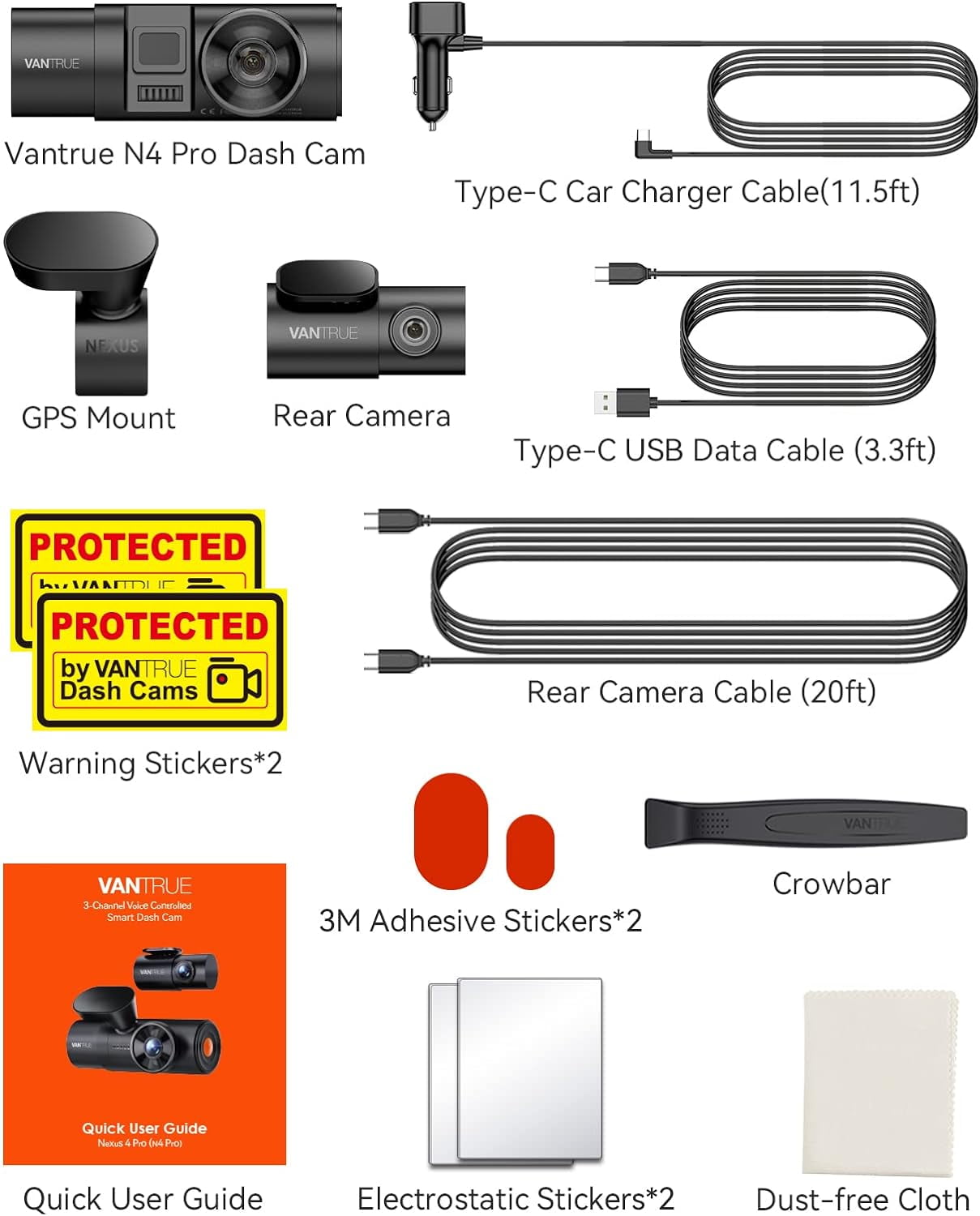 [ SONY STARVIS 2 True 4K 3-Channel Dash Cam ] Using the latest SONY STARVIS 2 IMX678 sensor, the N4 Pro’s front camera supports up to 4K 3840*2160 resolution in all 1CH/2CH/3CH options, delivering cinematic smooth 4K image quality that makes reading license plates a breeze, day or night. Monitor your car’s front, interior, and rear simultaneously in 4K+1080P+1080P resolution, providing valuable evidence for insurance claims or disputes. It is perfect for family trips and Uber/Lyft drivers. [ 4K HDR SONY STARVIS 2 Super Night Vision ] Adopting SONY STARVIS 2 image sensor, which can provides better low-light performance and clarity compared with STARVIS, enabling the N4 PRO dash cam to record images of moving vehicles more accurately and quickly, without blurring or chromatic aberration. Combined with 4K HDR technology to help adjust over- or under-exposed areas for balance lighting in the image, this allows the N4 PRO dash cam to restore 4K details for the best night shots. [OTA Firmware Update&Faster 5GHz Wi-Fi&GPS] Supports OTA upgrades on app to improve performance and updated features. With always-on 5GHz Wi-Fi, you can more easily access videos and photos recorded on your phone through “Vantrue” App, and share your travel scenery and moments to your family and friends on social media. Built-in GPS allows you to view your driving route and location on the app, and a speed stamp can be embedded in the video, which will provide additional evidence you may need. [ 4K+1080P 2-Channel Recording ] You can set it to Front and Rear 4K+1080P, or Front and Inside 4K+1080P dual channel mode according to your needs. The versatile rear camera can rotate 360° flexibly to help you record what’s going on behind your car, or you can turn the camera to the trunk to monitor your luggage (for SUVs and pickup). The cabin camera with F1.8 aperture, plus 4 IR LEDs, makes it possible to record the passenger activity inside the car clearly even in total darkness. [ 4 Parking Modes for 24/7 Protection ] The upgraded buffered motion detection allows you to manually adjust the recording area to avoid trivial videos caused by changes in sky light or falling leaves, etc., thus saving space on your SD card. This 3-channel dash cam will record the full event, saving the 10 seconds before and 30 seconds after motion is detected. Monitor your car’s safety 24/7 for peace of mind. To use parking mode, a hardwire kit (sold separately) is required. [ Smart Voice Control & Optional Anti-glare CPL ] Use 12 voice commands, such as: take photo, lock the video, turn on/off Wi-Fi, turn on/off screen, turn on/off audio, show the front/rear camera etc. It allows you to easily control your dash cam without taking your hands off the steering wheel for safe driving. The optional CPL (sold separately) effectively reduces glare and reflections, allowing the N4 PRO to produce optimal video quality even in hot sunny conditions. [ Reliable Features for Accident Recording ] When a collision is detected, the built-in G-sensor instantly locks and saves video, ensuring you don’t lose any critical evidence you might need. Dual capacitors are used as the power source, which allows the dash cam to withstand extreme temperatures from -14°F to 158°F without affecting performance, thus preventing the risk of overheating and making it more durable. [ Easy to Install & 18-Month Warranty] The Suction Cup Mount (sold separately) is available to mount the camera on a tilted or vertical windshield. Comes with a strong magnetic mount for easy installation. Support up to a 512GB memory card. If you need a longer rear camera cable (29.5ft), please email Vantrue’s support team to get it. For product questions or technical support, please email our support team and all emails will be answered within 24 hours.