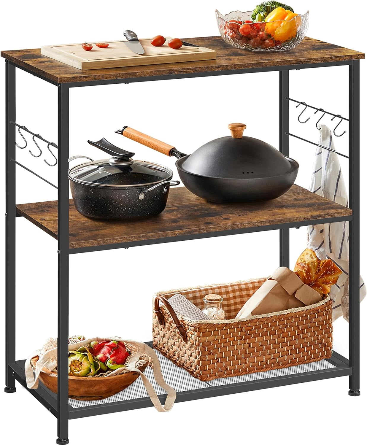 Bakers Rack, Kitchen Island Storage Shelf, Microwave Oven Stand, Metal Frame, Industrial, Rustic Brown and Black