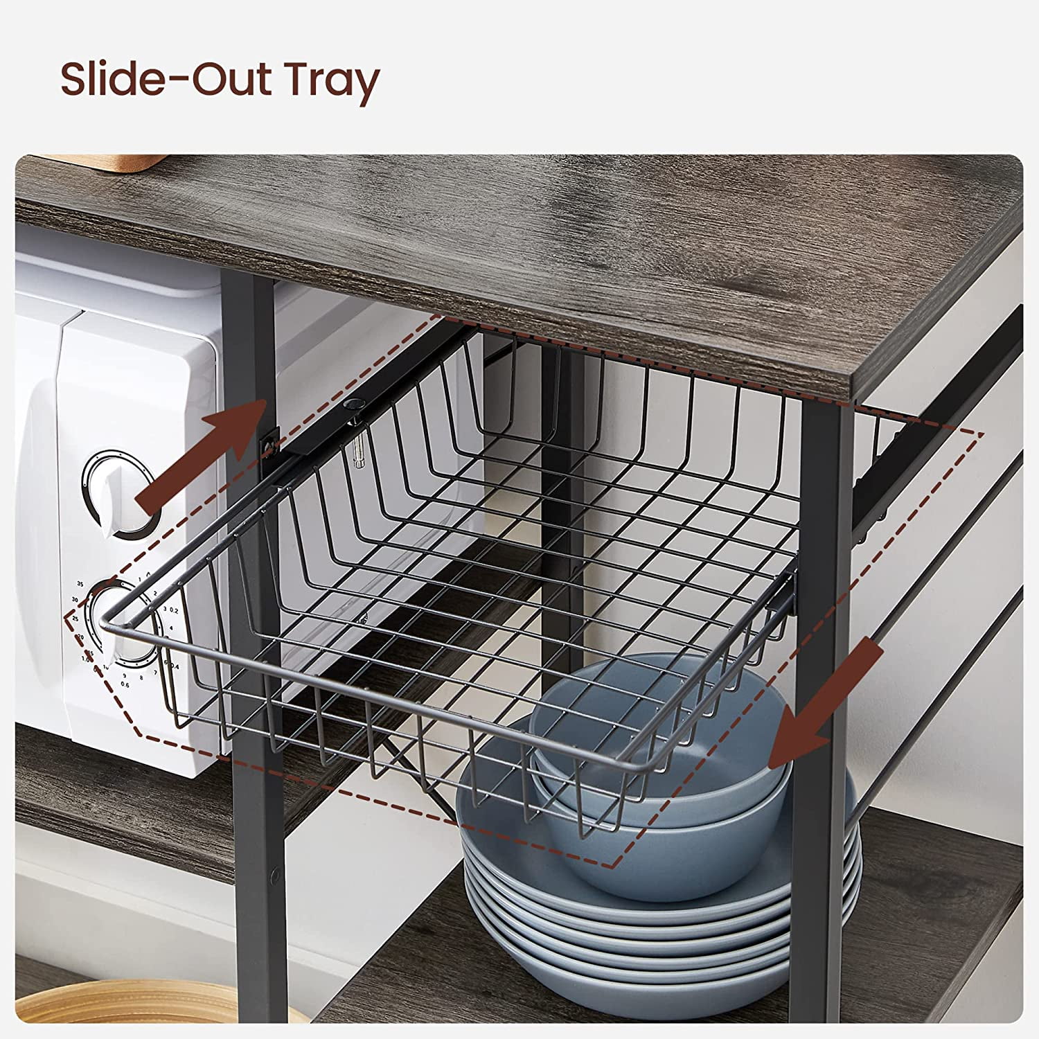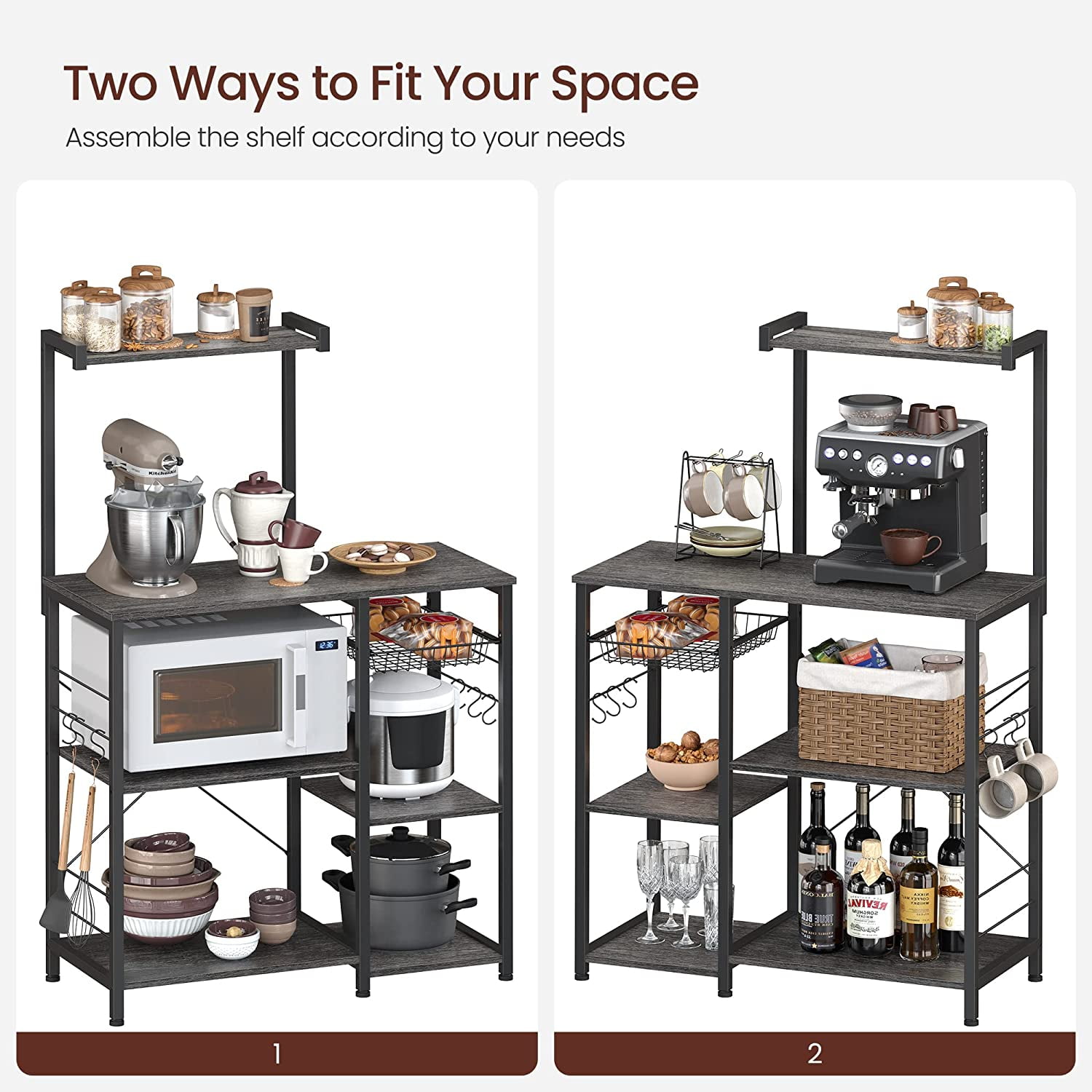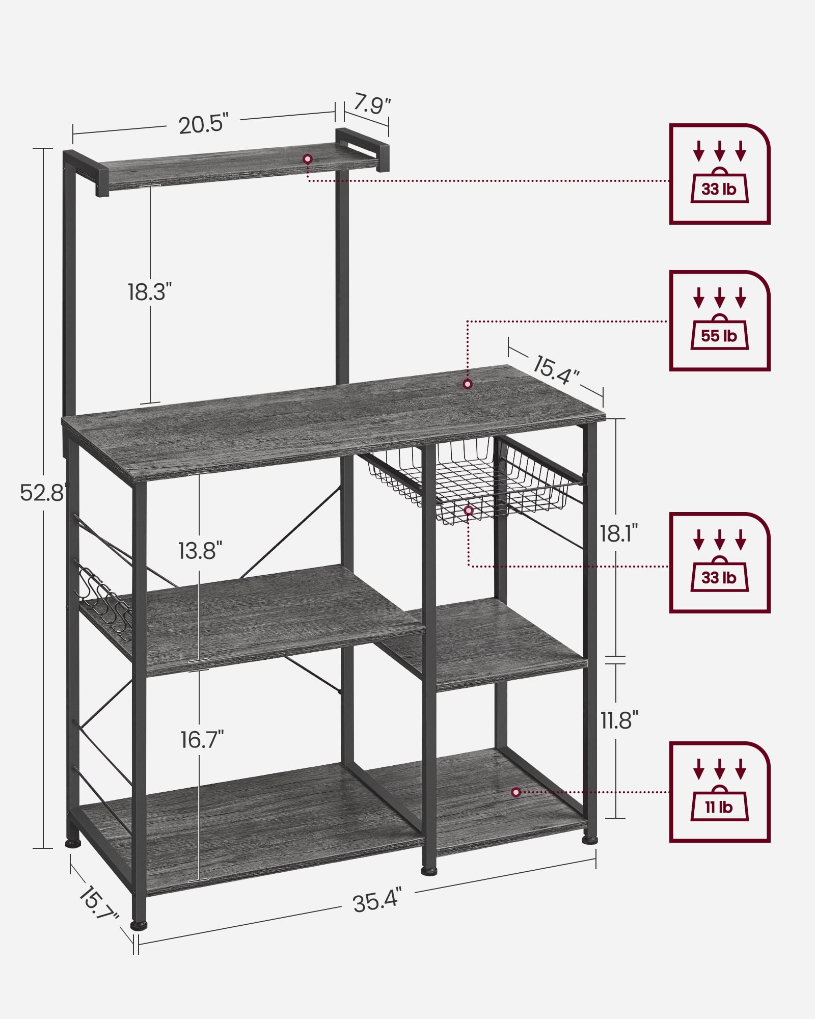 Features: [Stable and Secure] 0.8” x 0.8” steel tubes, quality particleboard panels, and X bars offer a stable structure; adjustable feet enhance the stability; the provided anti-tip kit ensures safer use of this kitchen shelf [Spacious Surface] Coffee machine, toaster, microwave, oven…set these kitchen appliances on the 15.4”D x 35.4”W surface of this kitchen shelf for your convenience while cooking [Categorized Storage] Set spice bottles on the top shelf, hang the ladle, spatula, and eggbeater on the hooks, store the tableware in the baskets, and place the kettle and blender on the shelves [Nice Look] Classic black steel frame, rustic brown shelves, and X bars in the back come together in this kitchen storage rack to spice up your kitchen [Simplified Assembly] Numbered parts and clear instructions will help simplify the assembly of this baker’s rack, so you can store kitchen utensils with it in a little time Specifications: Color: Charcoal Gray, Black Material: Particleboard, Steel Product Size: 15.7”D x 35.4”W x 52.8”H (40 x 90 x 134 cm) Product Weight: 34.6 lb (15.7 kg) Max. Static Load Capacity: Top Shelf: 33 lb (15 kg) Tabletop: 55 lb (25 kg) Each of the Middle and Bottom Shelf: 33 lb (15 kg) Wire Basket: 11 lb (5 kg) Package Contents: 1 x Baker’s Rack 6 x S-Shaped Hook 1 x Assembly Kit 1 x Instructions VASAGLE Notes: Children are not allowed to climb or play on the product. Please attach the product to the wall with the included anti-tip kit for safety. Avoid placing food directly on the metal wire basket for food hygiene reasons. Do not use the product in humid environments. If you accidentally spill water on it, wipe it off immediately with a dry cloth.