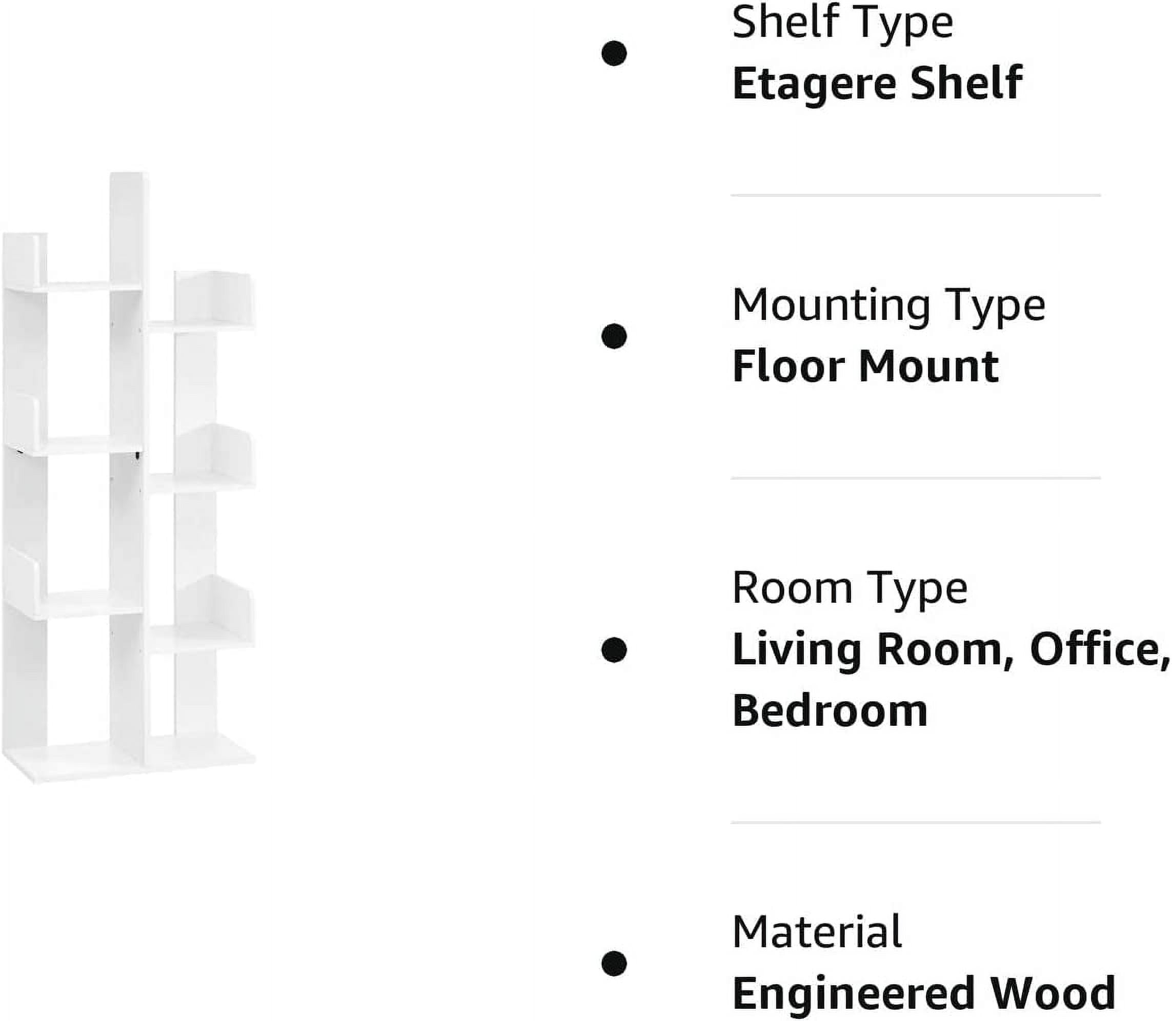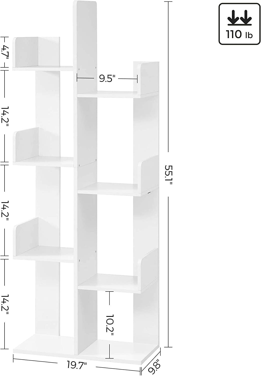 Features: An Invitation to Nature: Like a beautiful, majestic tree with silky smooth white bark, this large bookcase spreads its branches in your living room to sublimate your reading space. Let the peaceful calm of the forest enter your home! Orderly Space: Make this tree-shaped shelf bloom by placing all your treasures on its branches. It has 8 compartments to store your books…but that’s not all! Also put CDs, magazines, decorations, potted plants, and much more! Safety Matters: With side panels and 2 back panels to keep books in place, rounded corners to prevent bumps, and an anti-tip kit to attach it to the wall, this bookcase offers a feeling of security, keeping both your books and you in good hands Slides into Small Spaces: With its compact size of 19.7”L x 9.8”W x 55.1”H, this bookcase takes up very little space. You can easily create a reading corner in a living room, bedroom, or office that you thought was too small No Lonely Waiting: Here, good things don’t need to wait; with step-by-step instructions and numbered parts, you’ll set this bookshelf up and ready to hold your book collection! Specifications: Color: White Material: Particleboard Product Size: 9.8”D x 19.7”W x 55.1”H (25 x 50 x 140 cm) Product Weight: 26.1 lb (11.9 kg) Max. Static Load Capacity per Compartment: 22 lb (10 kg) Max. Static Load Capacity Total: 110 lb (50 kg Package Contents: 1 x Bookshelf 1 x Anti-Tip Kit 1 x Assembly Kit 1 x Instructions VASAGLE Notes: Children are not allowed to climb on the product or play with it. The max. static load capacity is 22 lb per shelf, please do not exceed this limit. For safety reasons, please secure the product to the wall with the included anti-tip kit. Please lift the product and not drag it when you want to move it.