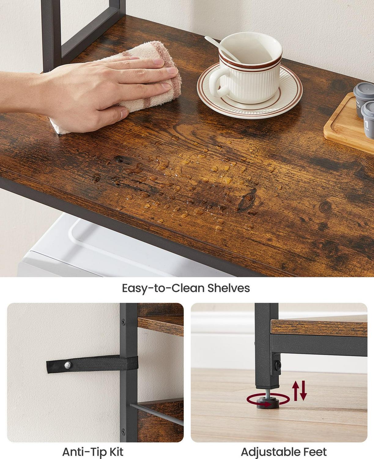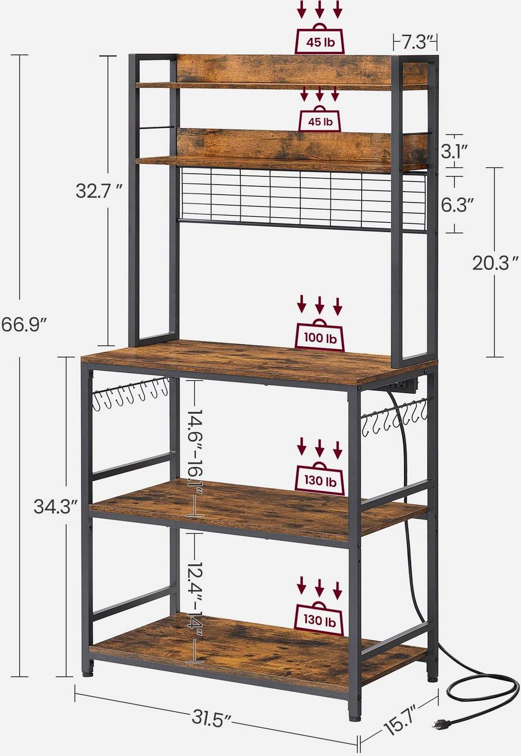 VASAGLE Kitchen Furniture -Space-saving Convenient Stylish! This Baker’s Rack will expand your storage space remodeling your kitchen, which is a perfect solution to help get you more of that much-needed space. Constructed by metal and wood adds an industrial flair that emphasizes the rustic appeal. Keep your spices, pots, pans, blenders,utensils, oven gloves, towels, and cookbooks all in one spot here on this kitchen rack. Simple assembly required for this utility storage shelving unit. We prepare an illustrated instruction manual and all necessary hardware and tools to help you set up quickly and easily.The power strip of kitchen baker rack has 4 AC outlets supporting up to 1875 watts.The middle kitchen shelf max. load capacity 130 lb. VASAGLE Bakers Rack w/ Power Outlet Coffee Bar Table Storage Shelf