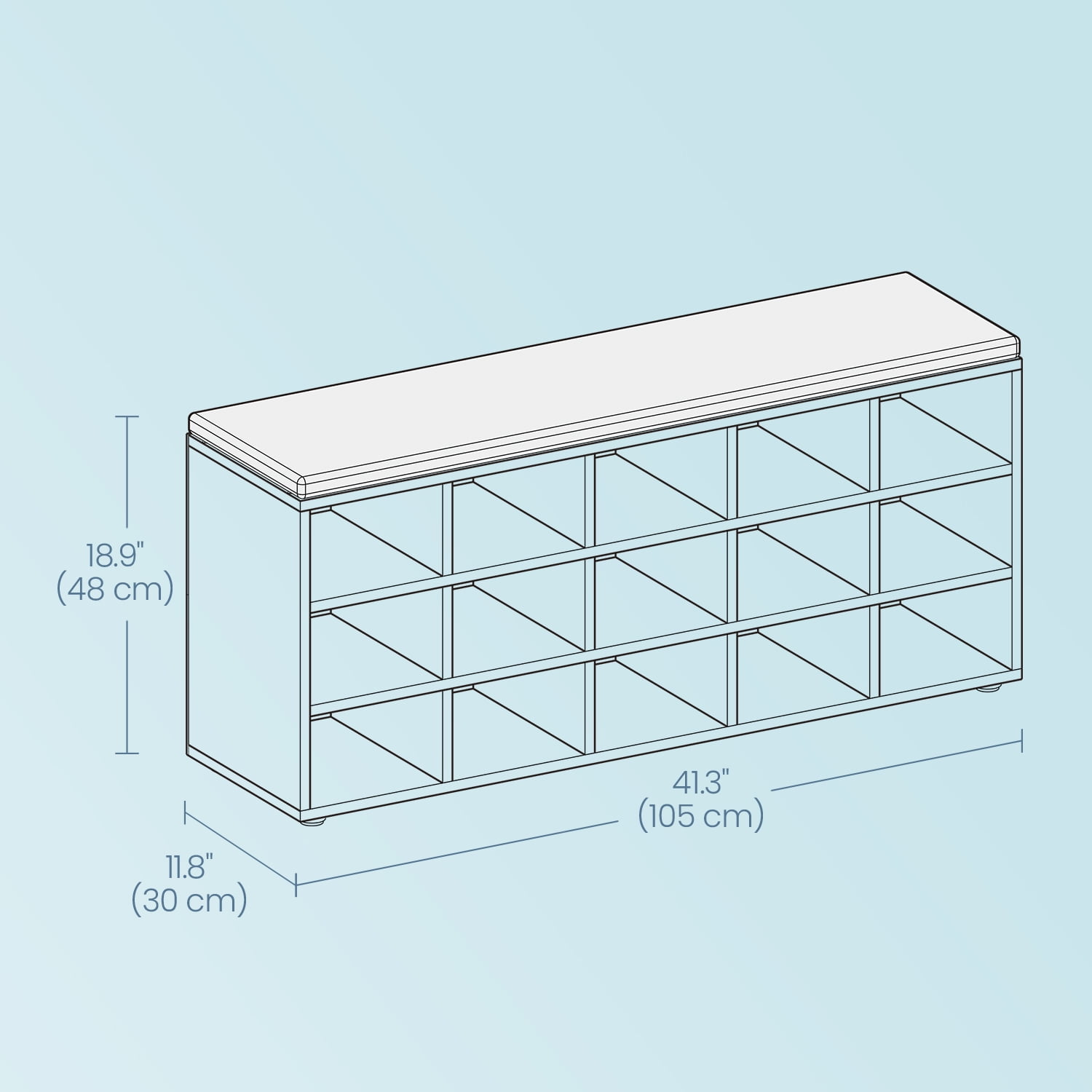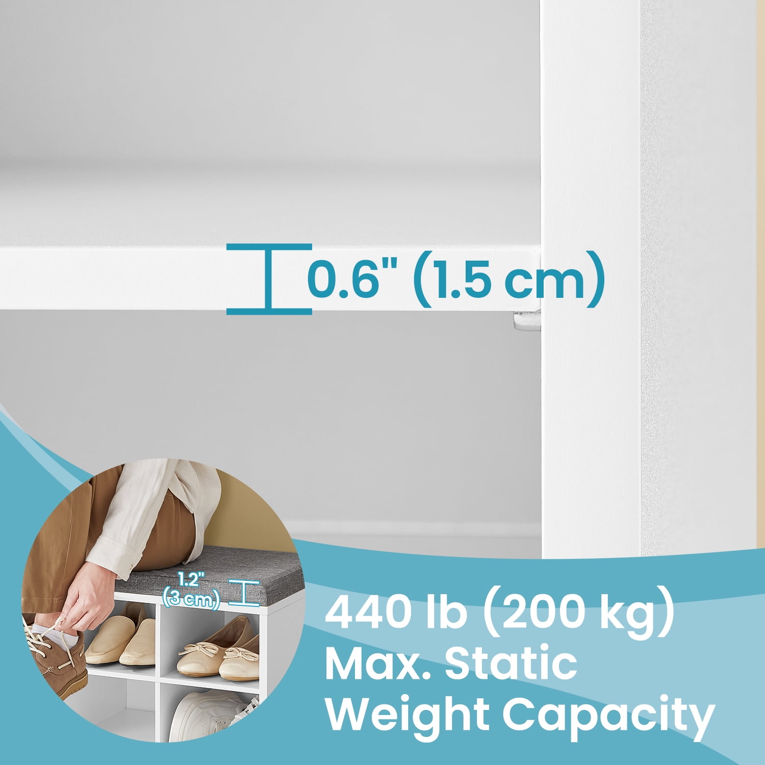 Features: IT’S TIME TO RETURN: After walking a long way for travel, work, or a fun day out, your shoes also need a perch to rest themselves. Why not create a home for them with this 15-slot shoe cabinet as a treat? TREAT YOURSELF, TOO: Instead of hopping around on one leg or sitting on a stool as hard as a brick, you can comfortably sit on this upholstered shoe bench to dress your feet AS STURDY AS THEY COME: Crafted of engineered wood and designed in a stable structure, this entryway bench holds up to 440 lb, so you won’t worry about it wobbling or collapsing under your weight KEEP IT SIMPLE: Thanks to the easy slot-together design of the inside structure, numbered parts, and easy-to-follow instructions, you’ll have this storage bench assembled without sacrificing your leisure time WHAT YOU GET: A cushioned shoe bench for comfortable sitting when change shoes and 15 shoe storage cubes for an organized entryway Specifications: Color: White Product Size: 41.3”L x 11.8”W x 18.9”H (105 x 30 x 48 cm) Max. Static Load Capacity: 440 lb (200 kg) Package Contents: 1 x Shoe Storage Bench 1 x Accessory Bag 1 x Instructions
