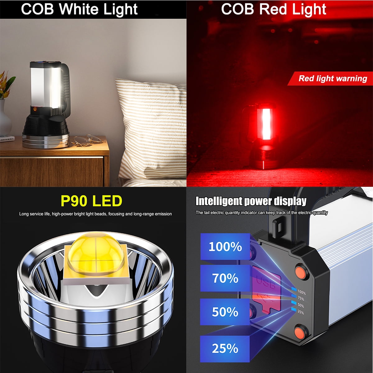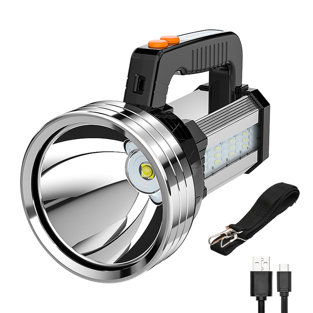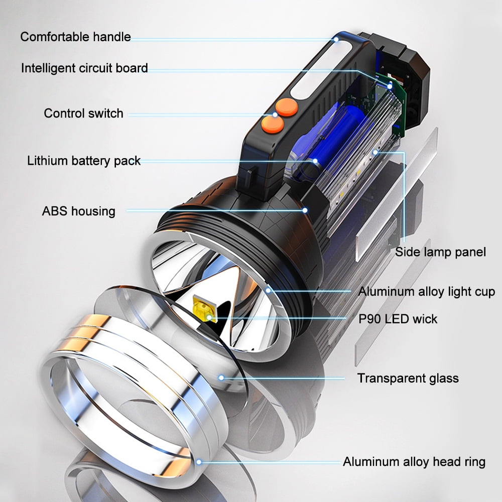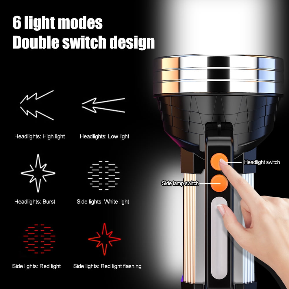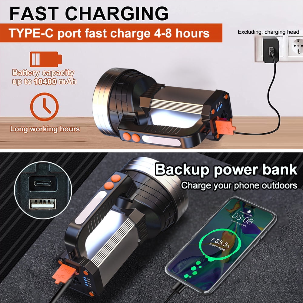 Vastfire Spotlight Flashlight for Boat Car Large Brightest Flashlights 100000 Lumen Flash Light Spot Lights Outdoor Handheld Portable Rechargeable Marine Spot Light Emergency Light Home Power Failure Camp 1. Led wick: upgraded four core burst lamp P90 wick, long service life, high power light bead, focusing and long-distance emission 2.6 Mode: 2 lights to meet your different needs. The main light source has three lighting modes: strong light, weak light and flash light. The side lights with four small LED lights provide three modes: strong light, weak light and flashing signal lights. The strong light of side lights can be used as small reading lights and camping lights at night. The flashing signal lamp can be used as an emergency warning lamp in case of danger 3. Power bank function: compatible with various charging devices, with USB smart charging and power bank function at the tail 4. Display of electric quantity at any time: understand the electric quantity status and tail electric quantity indication, be able to know the electric quantity at any time, supplement the electric quantity in time, and avoid insufficient electric quantity when using outdoors 5. Large capacity battery: full power and strong endurance. Four 10400ma high-capacity lithium batteries provide continuous power supply and long endurance. There is no need to worry about power shortage 6. Supporting bracket lens: supporting bracket with adjustable angle and red green light lens are used to convert white, red and green light sources. 7. Purpose: super bright LED searchlight, small size, light weight, comfortable handle, adjustable shoulder strap, ideal for camping, hiking, fishing, navigation, emergency lighting, outdoor, dog walking and rescue activities