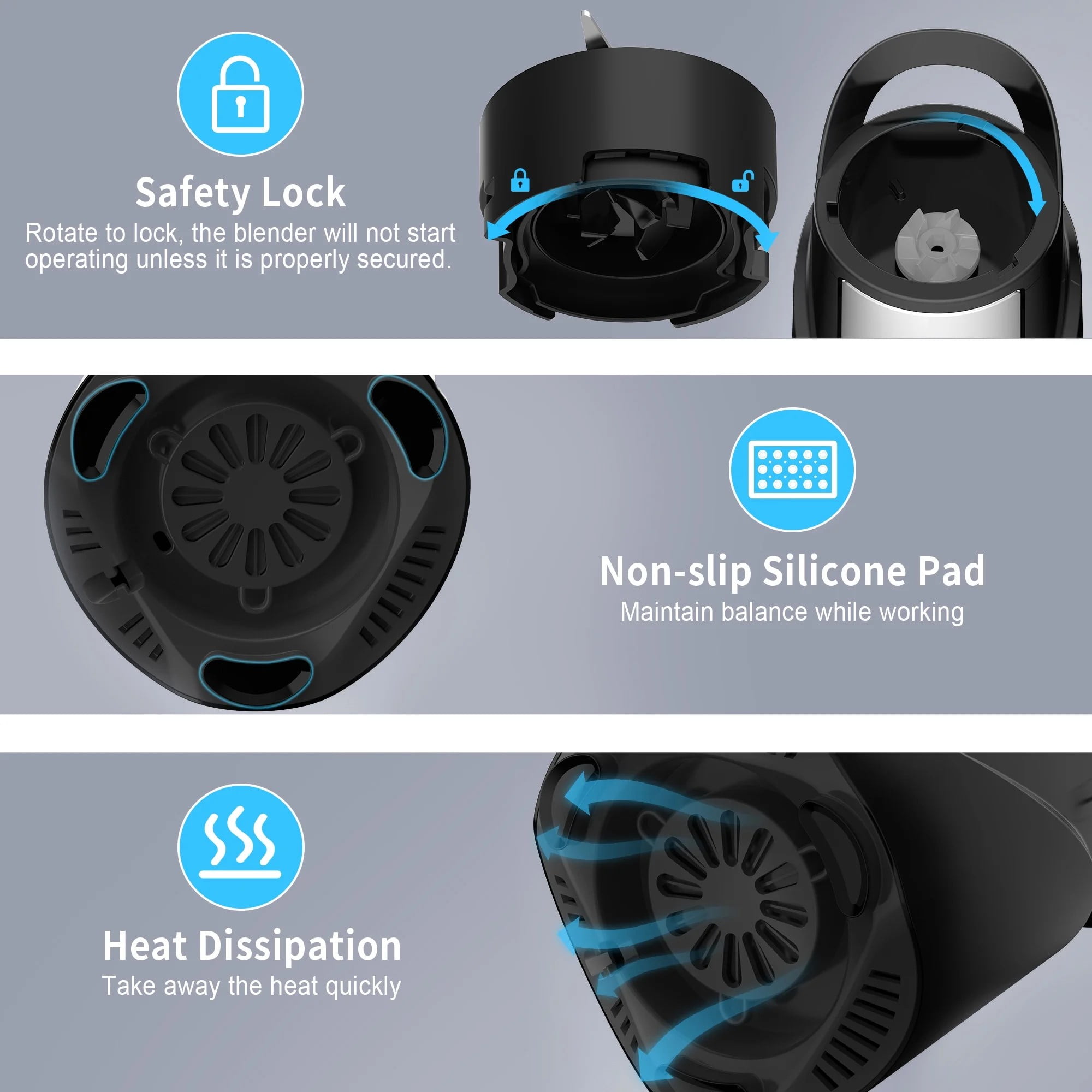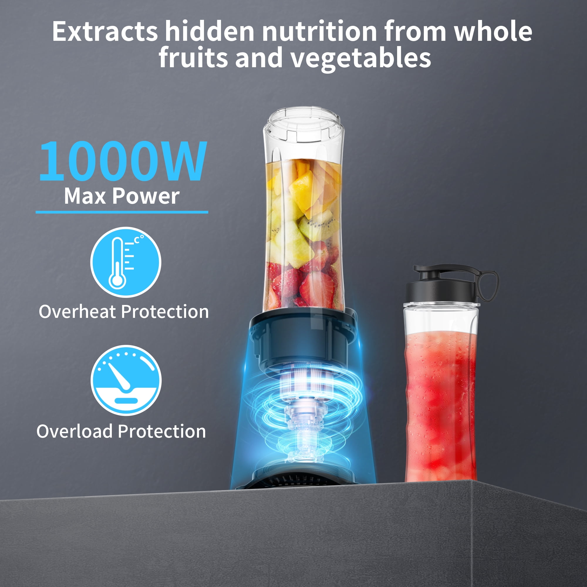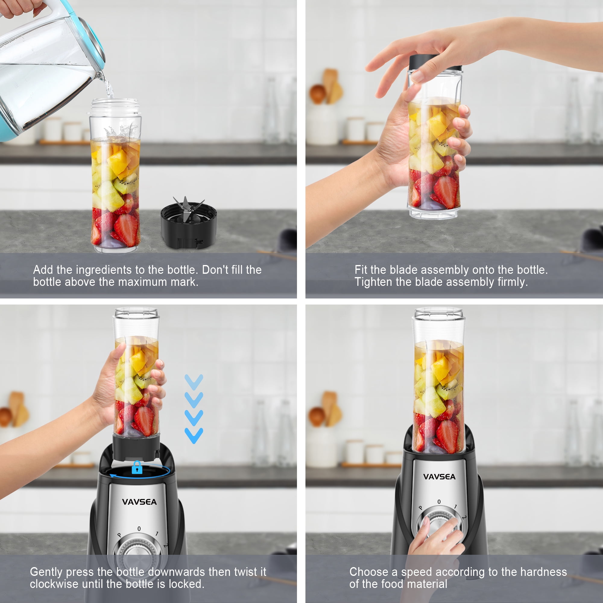 NOTE: ①Protect your cutter’s performance and durability by avoiding oversized, thick, or hard food items. ②To ensure smooth operation, add ice cubes gradually in small quantities. Powerful 1000W Motor: The 1000W Smoothie Blender features a robust motor that effortlessly blends, mixes, and grinds various ingredients, including fruits, vegetables, nuts, and ice. With its powerful performance, it creates smooth and flavorful juices, smoothies, salad dressings, and more, satisfying different taste preferences. Versatile Blender and Grinder Design: VAVSEA new smoothie blender offers versatility with its 4-leaf blade for blending and mixing, and a 2-leaf blade for grinding coffee beans, nuts, and spices. The option to choose different containers for various purposes enhances convenience and flexibility in the kitchen. Safety Features and BPA-Free Construction: Designed with safety in mind, the Smoothie Personal Blender includes a safety lock, overheating protection, and a cooling system to prevent overheating and extend its lifespan. All plastic parts are BPA-free, ensuring the health and well-being of users. The non-slip suction cups provide stability during use, and comprehensive after-sales services, including warranty and customer support, are provided. Large Capacity and Portable Cups: With a 34oz mixing bowl, a 20oz travel cup, and a 5oz dry grinding cup, this countertop blender accommodates the needs of a family of three. The travel cup allows users to conveniently take their freshly made drinks or food on the go, making it ideal for busy lifestyles. Easy-to-Use and Clean: Operating the 1000W Smoothie Blender is a breeze. Simply add ingredients to the cup, attach it to the base, and select the desired speed (2-speed or pulse) to start blending. The cup includes measurement markings for precise ingredient control. Cleaning is effortless, as the blender can be rinsed with water or easily cleaned in a dishwasher, except for the motor part and blade assembly.