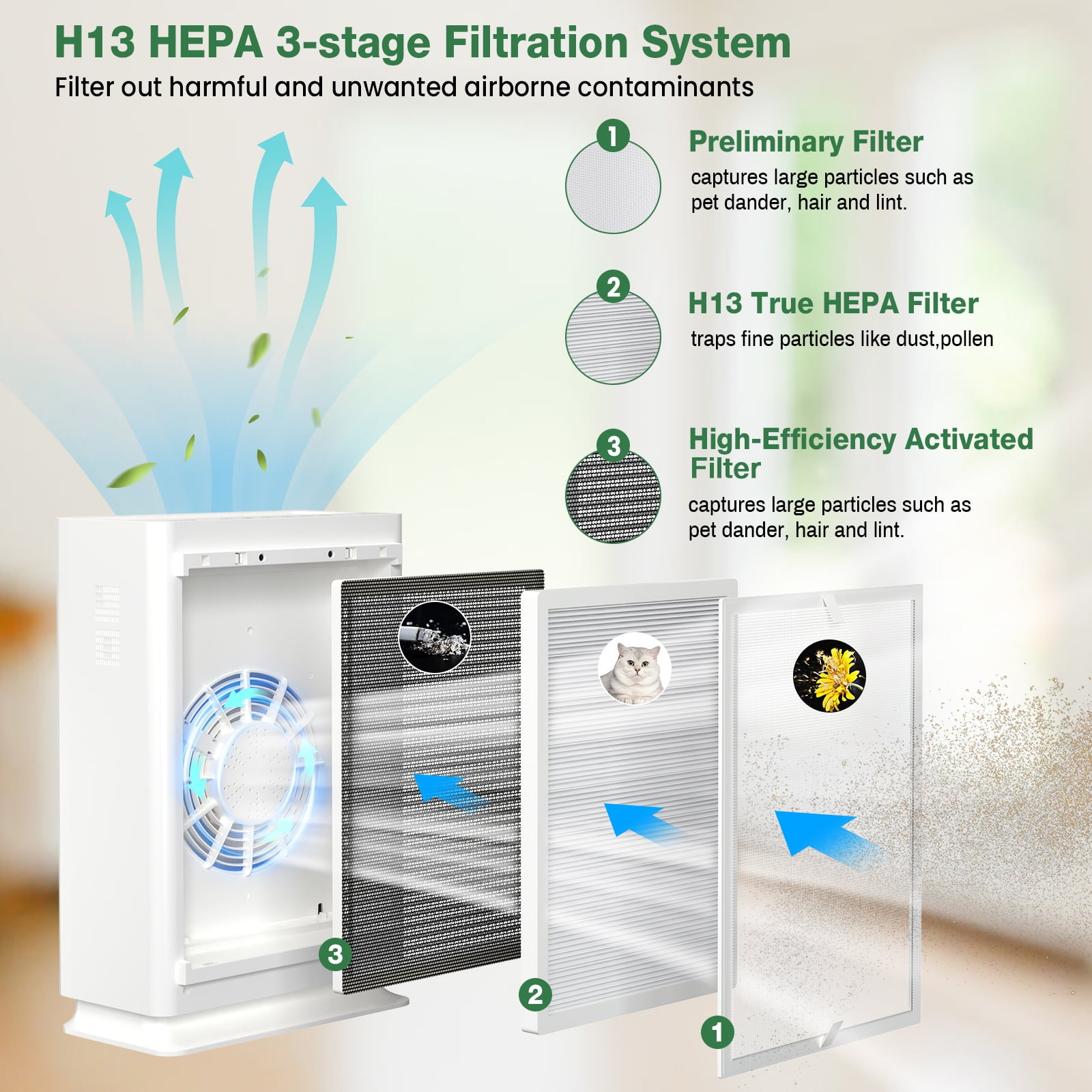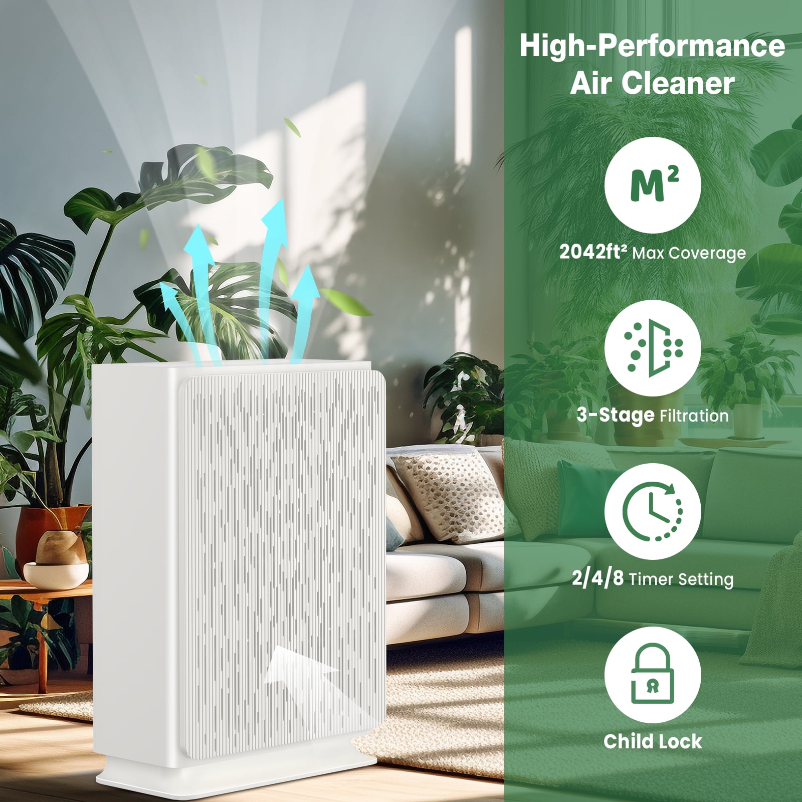 【2042 sq.ft Usage Area】This large air purifier features with latest Technology, can clean up to 2042 ft² 6 time per hour, ideal for living room, home, kitchen and whole house. Each filter can last 1-3 months based on your actual usage. 【H13 True HEPA Filtration】This HEPA air purifier is equipped with a 3-stage filtration system including pre-filter, true HEPA filter, activated carbon filter, net filter, can reduces up to 99.97% of harmful germs, dust, pollen, pet dander, mold. 【Multiple Function Modes】This room air filter has smart auto mode, 4 speeds, 1-12 H timer and child lock. And the 30 dB super quiet sleep mode offers you and your baby a soothing sleep environment. 【2-8 H Timing Function & Child Lock】The air purifier with smart timer function allows you to set 2-8 H timer based on your demands. It also comes with CHILD LOCK function to avoid any accidental operation by kids or pets. 【When to Change Filter】 Our bedroom air purifier are set up with a 3000 H filter replacement reminder. The indicator light will flash when the purifier has been in use for 3000 H. It is recommended to replace your filter every 1-3 months depending on the use and air quality. (To ensure the best effectiveness of the purifier, please contact us to get the right filter link). 【Quality Assurance and After-sales Service】 Our VAVSEA air purifier is not only FCC certified, ETL Listed and CARB approved, but it is also 100% OZONE FREE, ensuring your safety and satisfaction. Additionally, we offer a 1-Year Warranty and Lifetime Service Support for your peace of mind. VAVSEA Air Purifier Highlights: Room Size: Up to 2042sq. ft Weight: 9.47 pounds Noise Level: Minimum 30dB Timer: 2, 4, or 8 hours. Fan Speed: 3-speed Dimensions: 13.38×10.7×24 inch Filter: H13 HEPA Filter 3-Stage Filtration NOTE: Please remove the plastic bag of the filter before running the air purifier