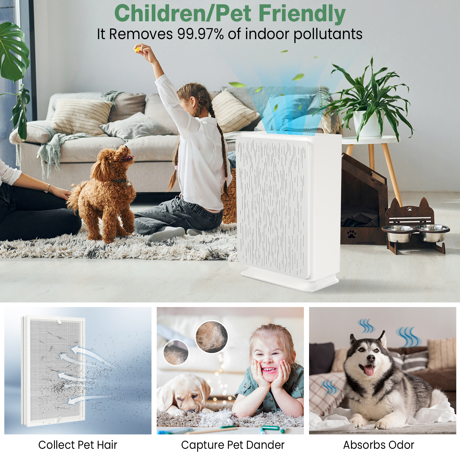 The VAVSEA air purifier can refresh the air in a room up to 2042 square feet 6 times an hour, making it perfect for large rooms in the home. 3-stage filtration system: pre-filter/H13 True HEPA purifier/enhanced activated carbon filter. 30dB quiet operation in sleep mode. The H13 True HEPA purifier works with a pre-filter and a high-efficiency activated carbon filter to capture dust, smoke, pollen, odors or odors. Pet allergy filters help capture pet dander and absorb unpleasant odors. Get great relief from asthma, pet allergies, coughs, sinusitis, sneezing, chronic allergies, and seasonal allergies with the VAVSEA air purifier.