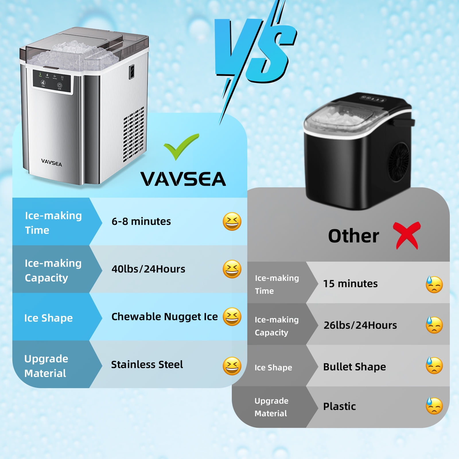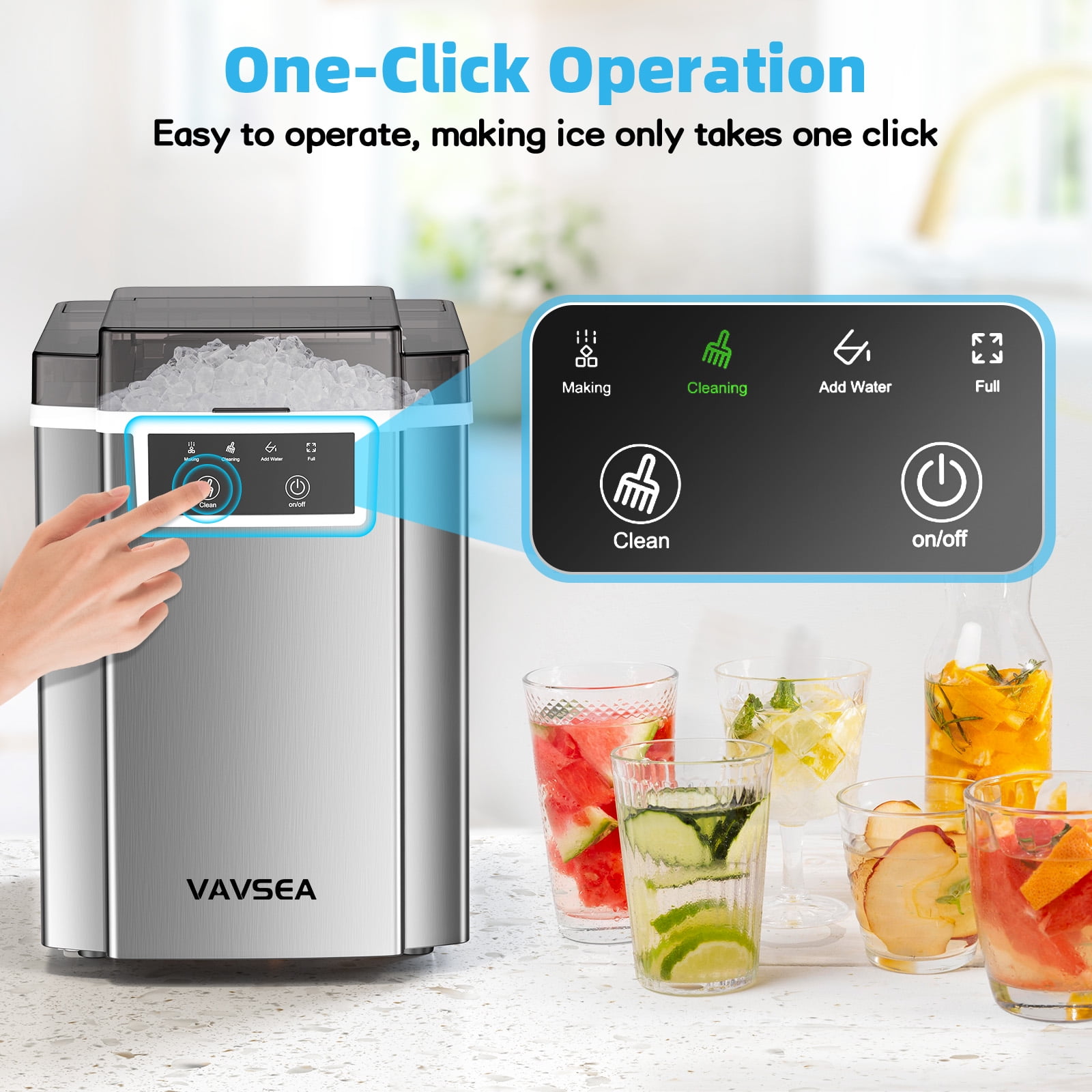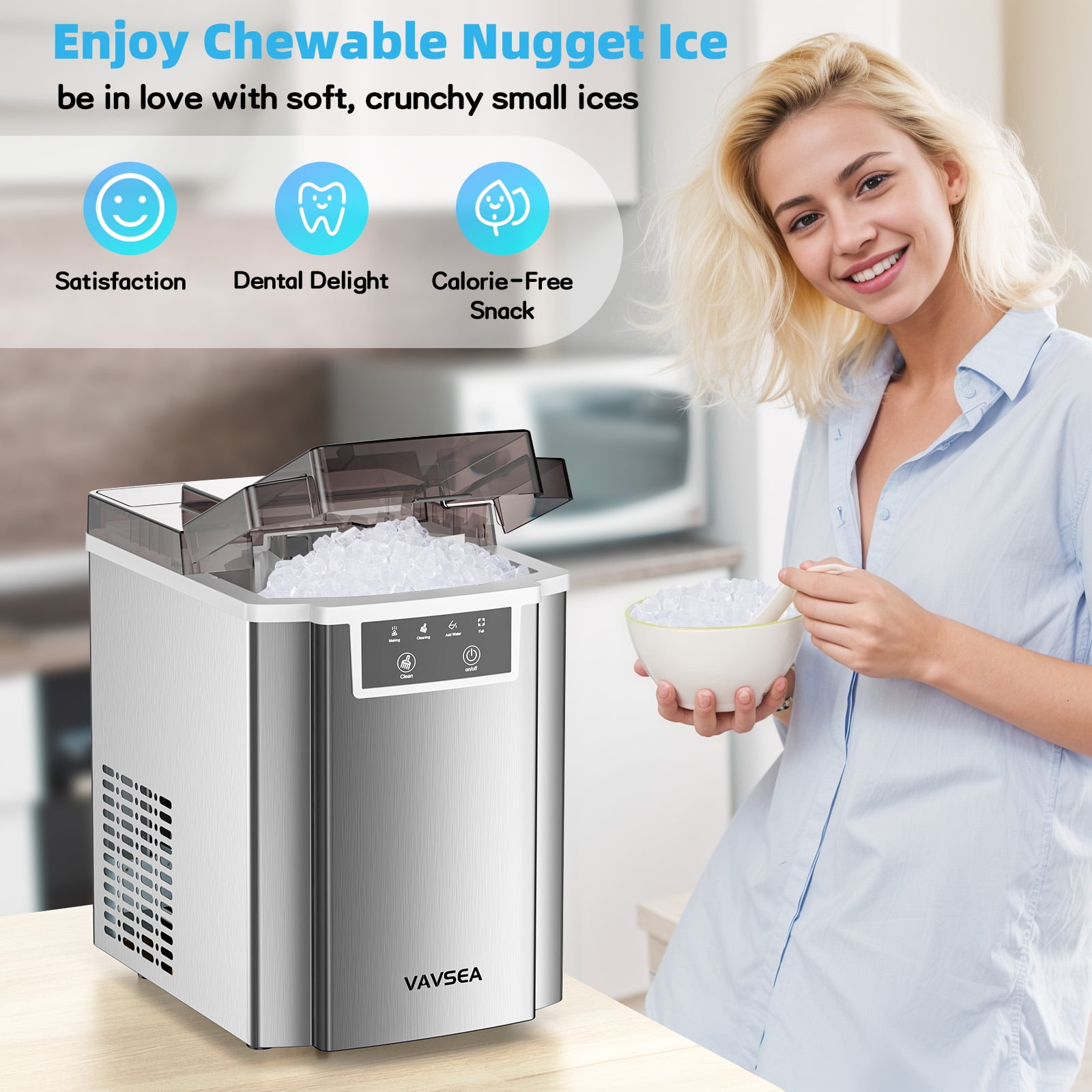 6-8Minutes Fast Ice Making &40LBS/Day: This nugget ice maker countertop adopts a high-efficiency compressor with strong ice-making capacity, which can produce soft, crispy, chewy pebble ice in 6-8 minutes, and can produce up to 40 pounds of transparent ice per day. Our pellet ice maker is equipped with a 1.6Qt water tank, 2.2 lbs removable basket. You will never run out of ice. Soft and Chewy Granular Ice: The unique soft pellet ice won’t hurt your hands or mouth, unlike those bullet ice and square ice, crushed nugget ice cube is made not only to cool down drinks fast but also to retain their flavor and providing a joyfully crunchy chewable experience.The melting speed and sense of experience of nugget ice is ideal companion for most frozen drinks. Easy to Operate: This chewable ice maker adopts a one-button design, which is easy to use, just press it to make ice. Using advanced infrared sensors, there are two indicator lights to remind you of the status of the ice maker, and the indicator lights will automatically light up when the water level is low or the ice basket is full. Easy Self-Cleaning: The Pebble Portable Ice Machine has a self-cleaning function, which greatly simplifies your daily maintenance. Press and hold the “Ice/Clean” button for 5 seconds to start automatic cleaning, which takes about 15 minutes. No more tedious manual cleaning with our easy self-cleaning function. 43dB Low Noise: The operating noise level of our ice maker is less than 43dB, ensuring that the production process remains quiet and unobtrusive. You can enjoy the convenience of our nugget ice maker machine without worrying about disturbing others. Compact Design and Reliable Support: Our sonic ice maker is compact in size, 10.24 x13.39 x 14.57 inches, and can be easily installed on most countertops and tabletops, making it an ideal choice for home, office, kitchen, RV, etc. At the same time, VAVSEA also provides consumers with a one-year warranty service. If you have any questions, please contact us to solve the problem. Specifications: Ice Type: Chewable Nugget Ice Daily Output: 40lbs Rapid Ice Making: Produces ice in 6-8 minutes Water Tank Capacity: 1.5L/1.6Qt Ice Basket Capacity: 2.2lbs Material: Stainless Steel Package Size: 10.24 x13.39 x 14.57 IN Package Weight: 18.8 lbs