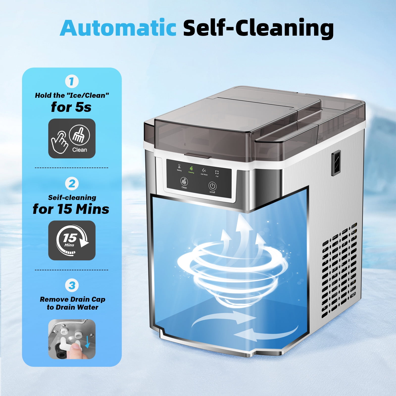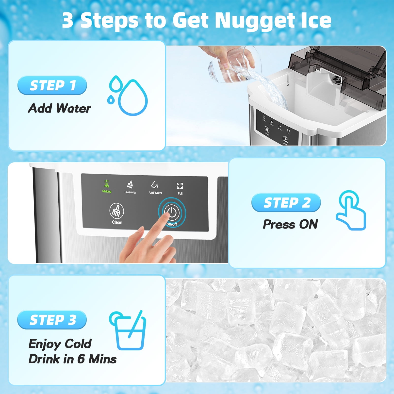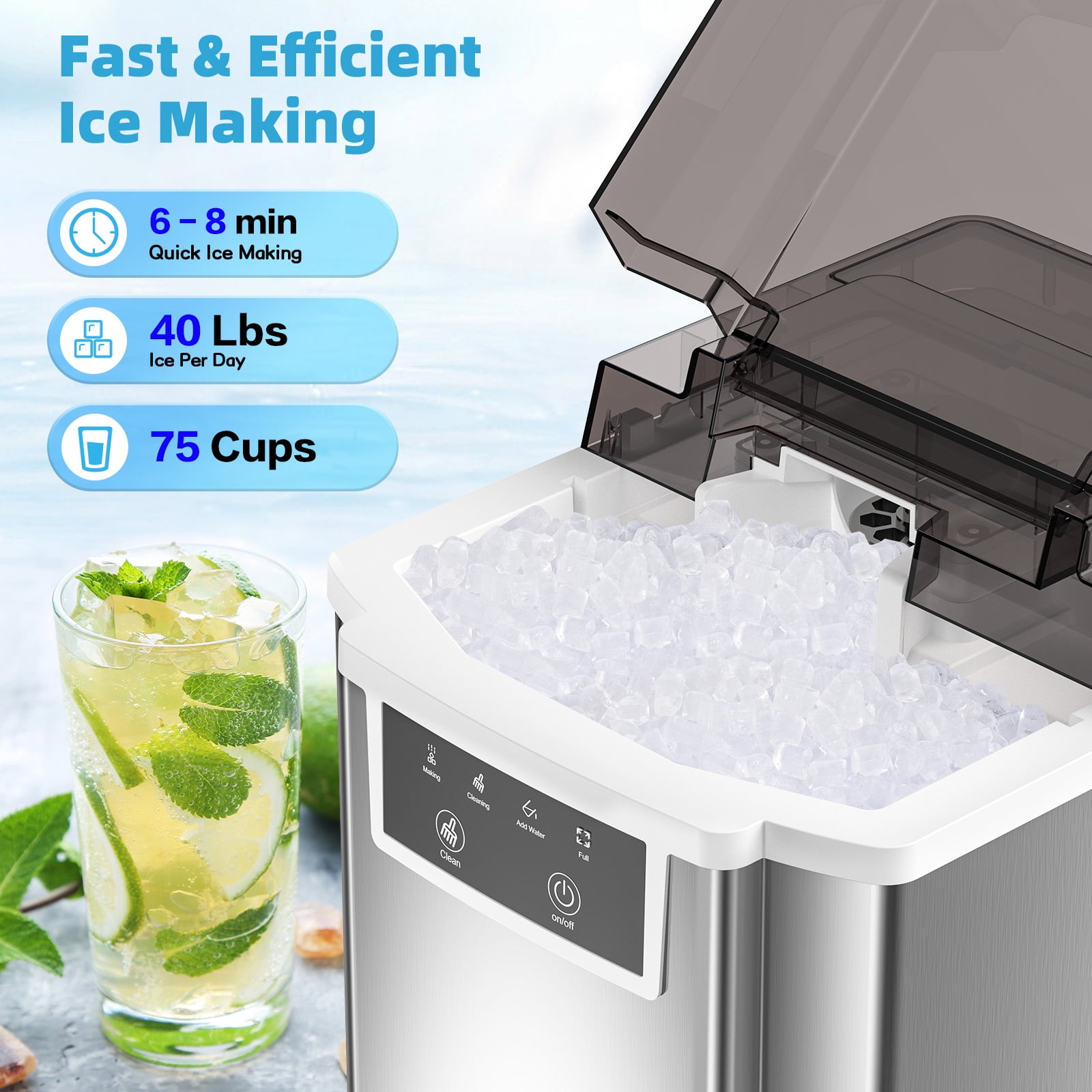 6-8Minutes Fast Ice Making &40LBS/Day: This nugget ice maker countertop adopts a high-efficiency compressor with strong ice-making capacity, which can produce soft, crispy, chewy pebble ice in 6-8 minutes, and can produce up to 40 pounds of transparent ice per day. Our pellet ice maker is equipped with a 1.6Qt water tank, 2.2 lbs removable basket. You will never run out of ice. Soft and Chewy Granular Ice: The unique soft pellet ice won’t hurt your hands or mouth, unlike those bullet ice and square ice, crushed nugget ice cube is made not only to cool down drinks fast but also to retain their flavor and providing a joyfully crunchy chewable experience.The melting speed and sense of experience of nugget ice is ideal companion for most frozen drinks. Easy to Operate: This chewable ice maker adopts a one-button design, which is easy to use, just press it to make ice. Using advanced infrared sensors, there are two indicator lights to remind you of the status of the ice maker, and the indicator lights will automatically light up when the water level is low or the ice basket is full. Easy Self-Cleaning: The Pebble Portable Ice Machine has a self-cleaning function, which greatly simplifies your daily maintenance. Press and hold the “Ice/Clean” button for 5 seconds to start automatic cleaning, which takes about 15 minutes. No more tedious manual cleaning with our easy self-cleaning function. 43dB Low Noise: The operating noise level of our ice maker is less than 43dB, ensuring that the production process remains quiet and unobtrusive. You can enjoy the convenience of our nugget ice maker machine without worrying about disturbing others. Compact Design and Reliable Support: Our sonic ice maker is compact in size, 10.24 x13.39 x 14.57 inches, and can be easily installed on most countertops and tabletops, making it an ideal choice for home, office, kitchen, RV, etc. At the same time, VAVSEA also provides consumers with a one-year warranty service. If you have any questions, please contact us to solve the problem. Specifications: Ice Type: Chewable Nugget Ice Daily Output: 40lbs Rapid Ice Making: Produces ice in 6-8 minutes Water Tank Capacity: 1.5L/1.6Qt Ice Basket Capacity: 2.2lbs Material: Stainless Steel Package Size: 10.24 x13.39 x 14.57 IN Package Weight: 18.8 lbs