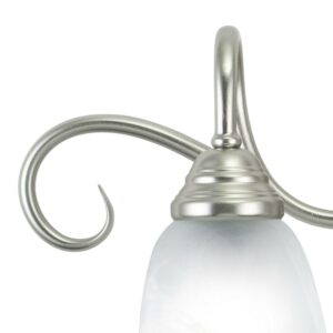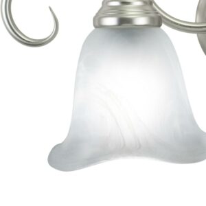 The Bella collection features a brushed nickel finish with white alabaster glass shades. The shades are delicately scalloped softening the overall feel. Elegantly scrolled arms complete the look of this transitional family of fixtures. This fixture may be mounted up or down. Choose from a variety of sizes for the perfect fit in your space.