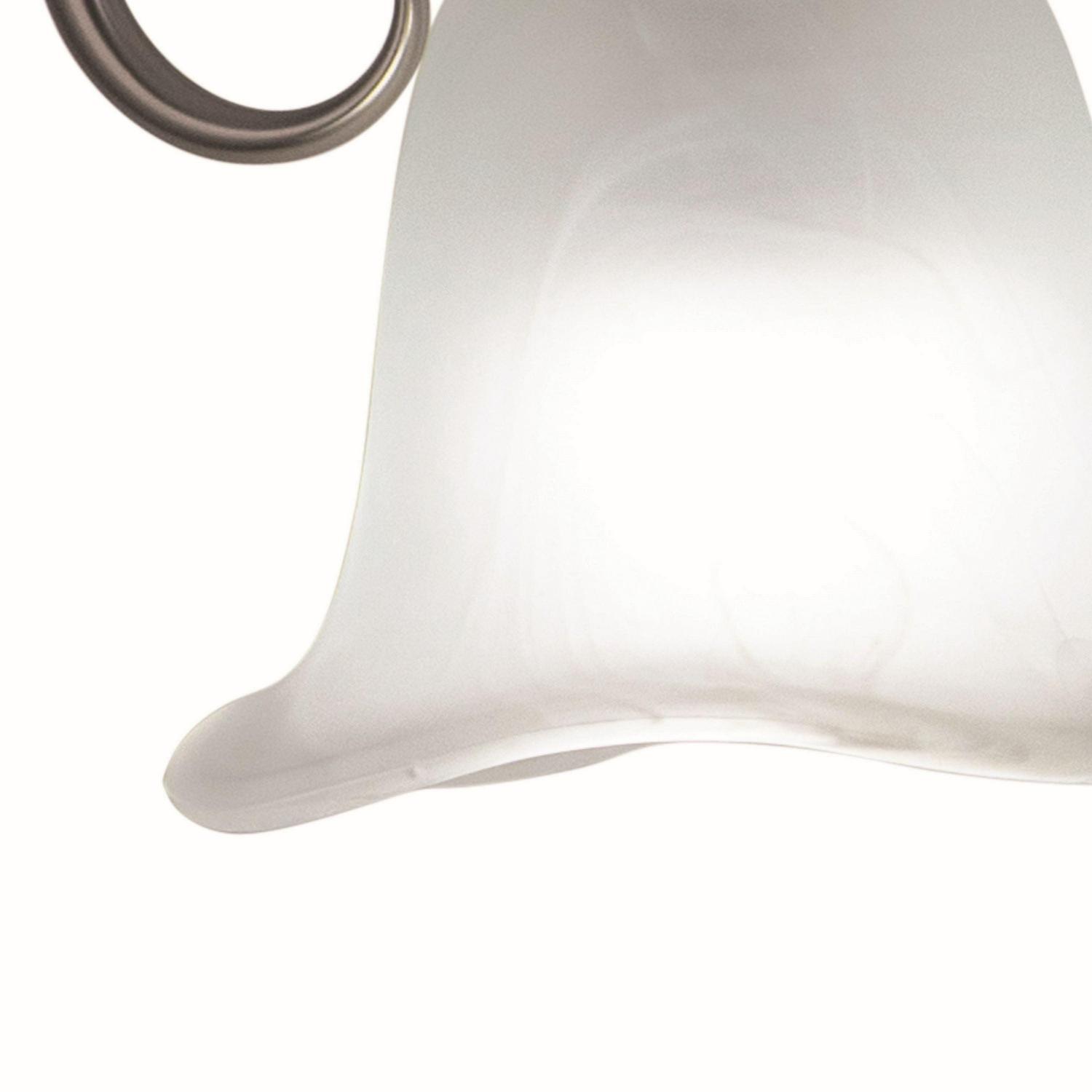 The Bella collection features a brushed nickel finish with white alabaster glass shades. The shades are delicately scalloped softening the overall feel. Elegantly scrolled arms complete the look of this transitional family of fixtures. This fixture may be mounted up or down. Choose from a variety of sizes for the perfect fit in your space.
